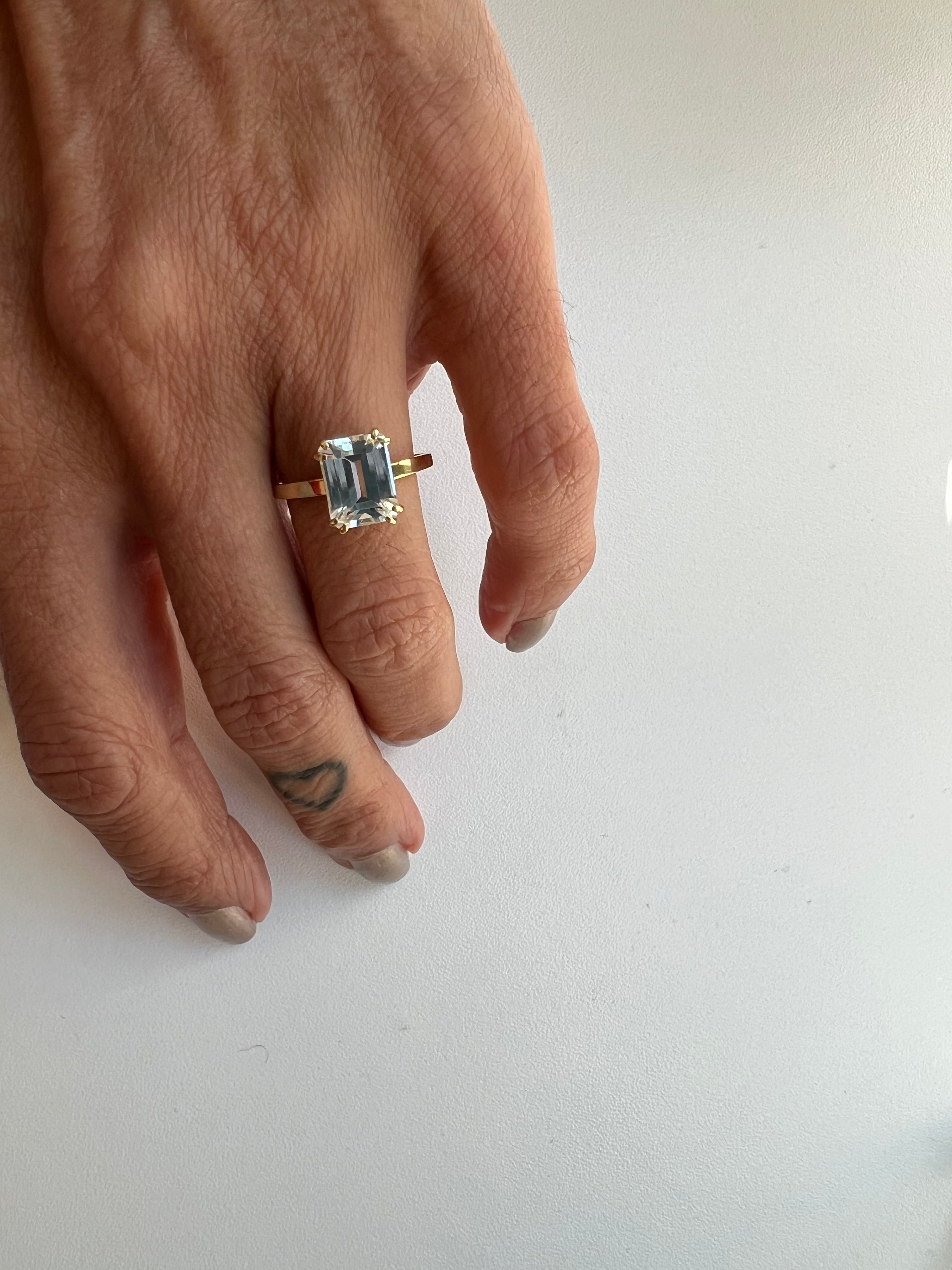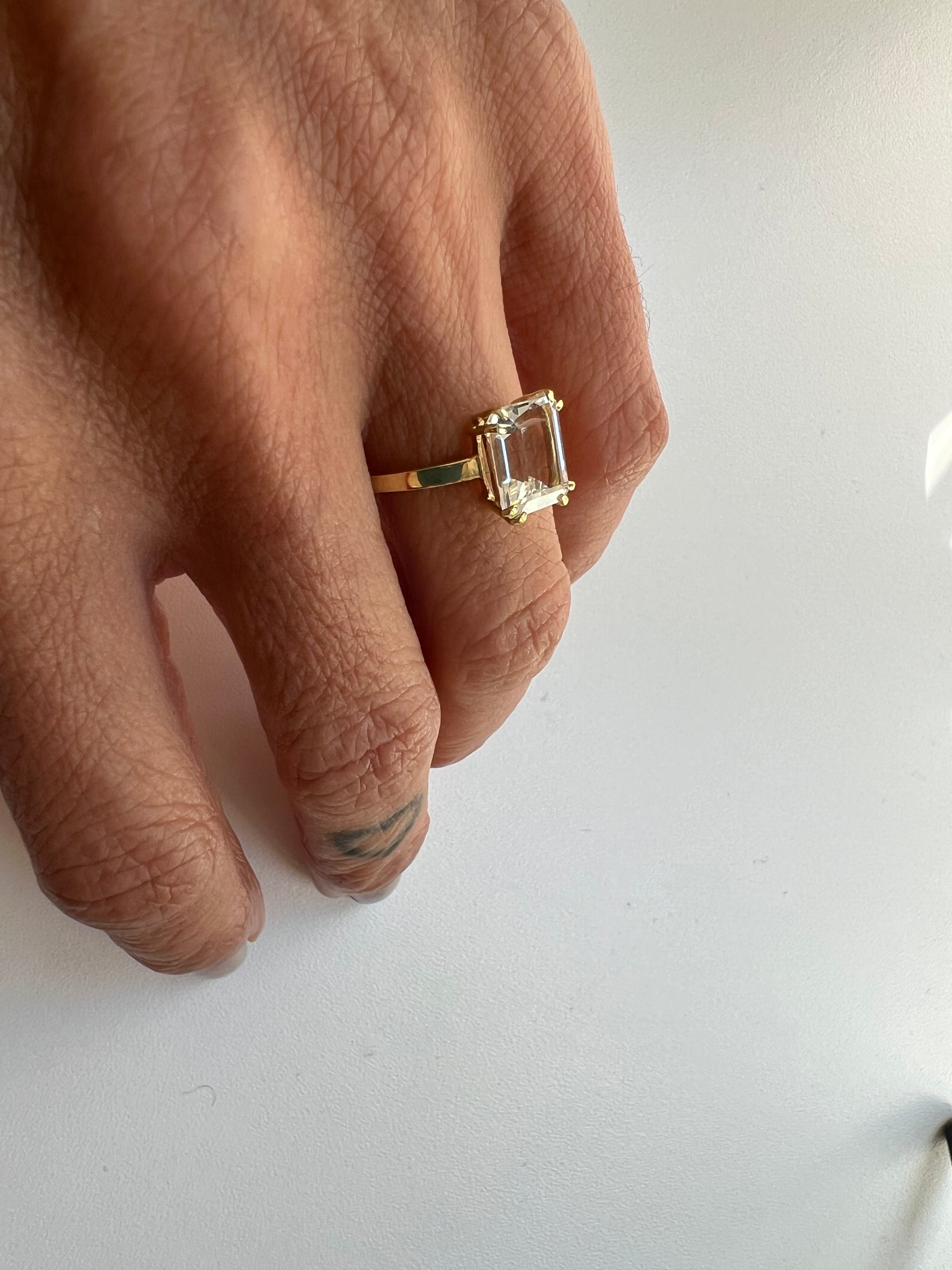 O Anel Cecília é feito em ouro 18k com uma deslumbrante pedra natural de topázio incolor, com 2.84 ct e 7x9 mm de tamanho, na numeração de aro 16. Garanta elegância e sofisticação em seu visual com esse acessório luxuoso. Aproveite toda a beleza e brilho dessa pedra preciosa em seu dia a dia.
