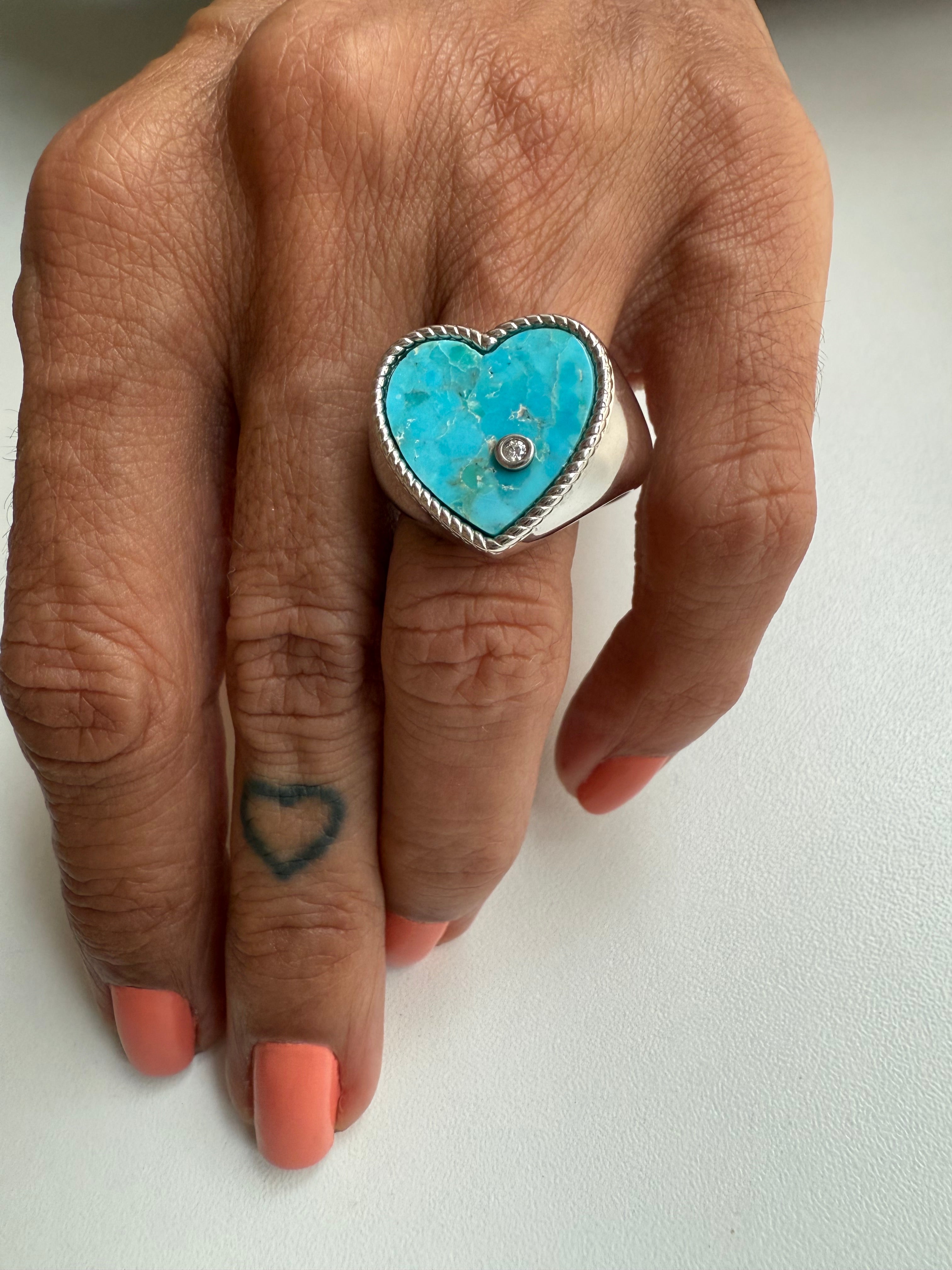 O Anel Coração Turquesa é perfeito para quem busca elegância e sofisticação. Feito com prata 925 e banho de ródio, possui pedras naturais turquesa que além de trazer beleza, também promovem equilíbrio e proteção. Ideal para aro 20.5, oferece conforto e estilo em um só acessório.