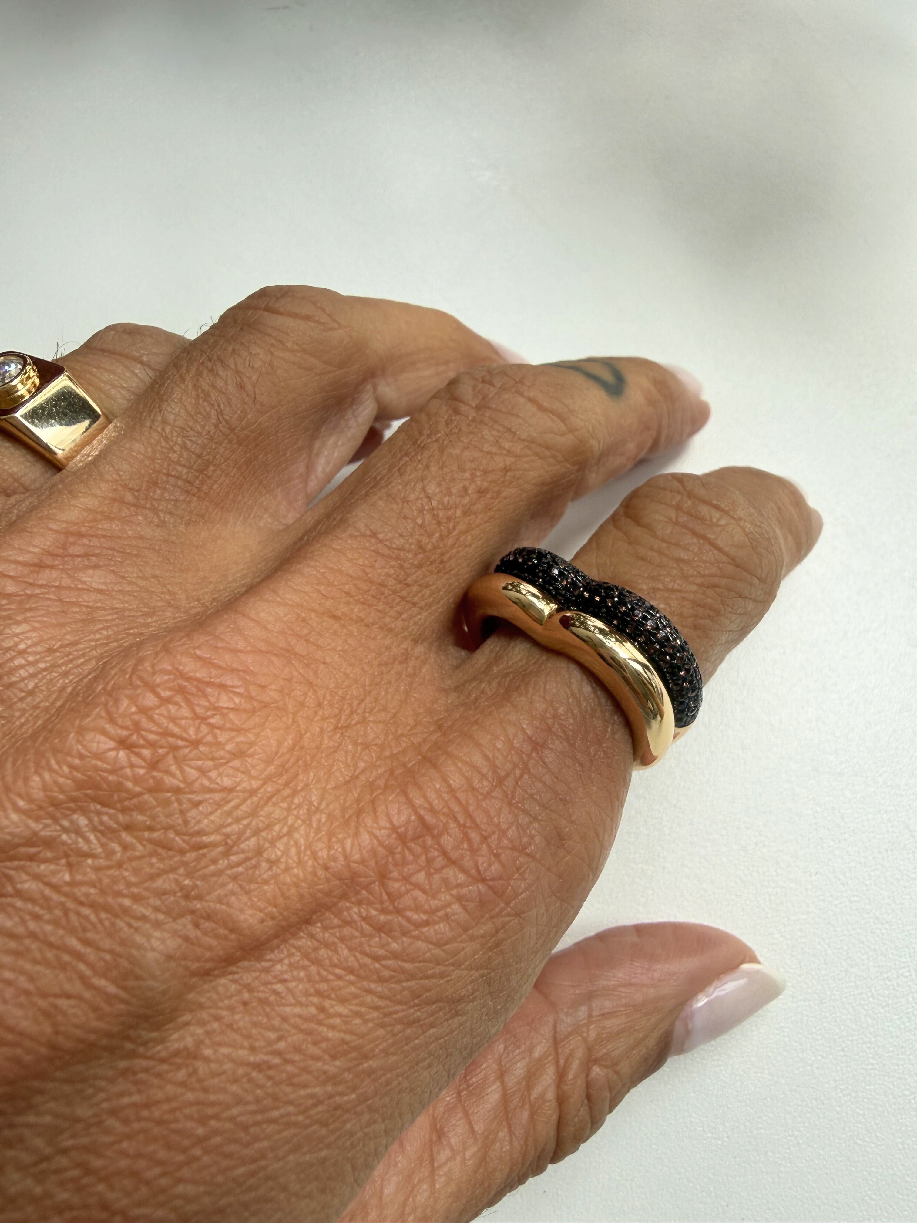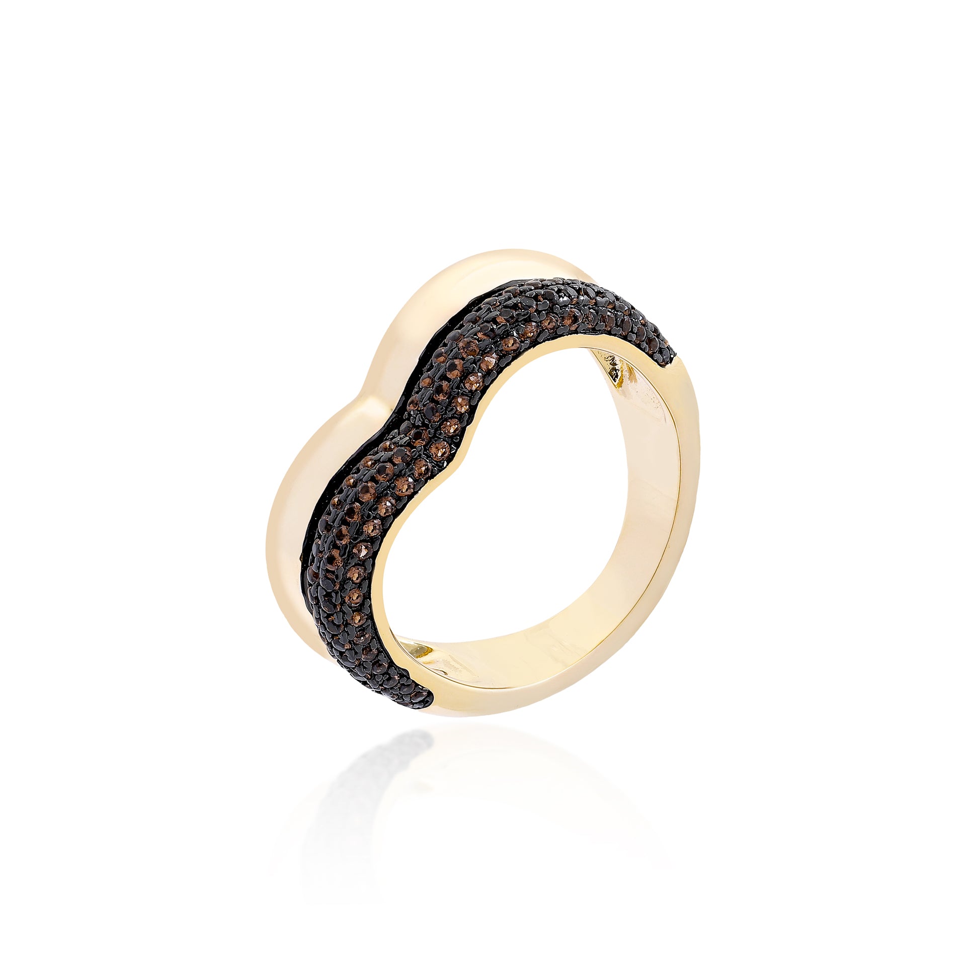 O Anel Duplo Coração Brown é confeccionado em prata 925 com banho de ouro, apresentando cravações de zircônias brown e um acabamento em rodiado negro. Este design combina durabilidade e elegância, oferecendo uma peça de alta qualidade que destaca a beleza das zircônias, ideal para diversas ocasiões.