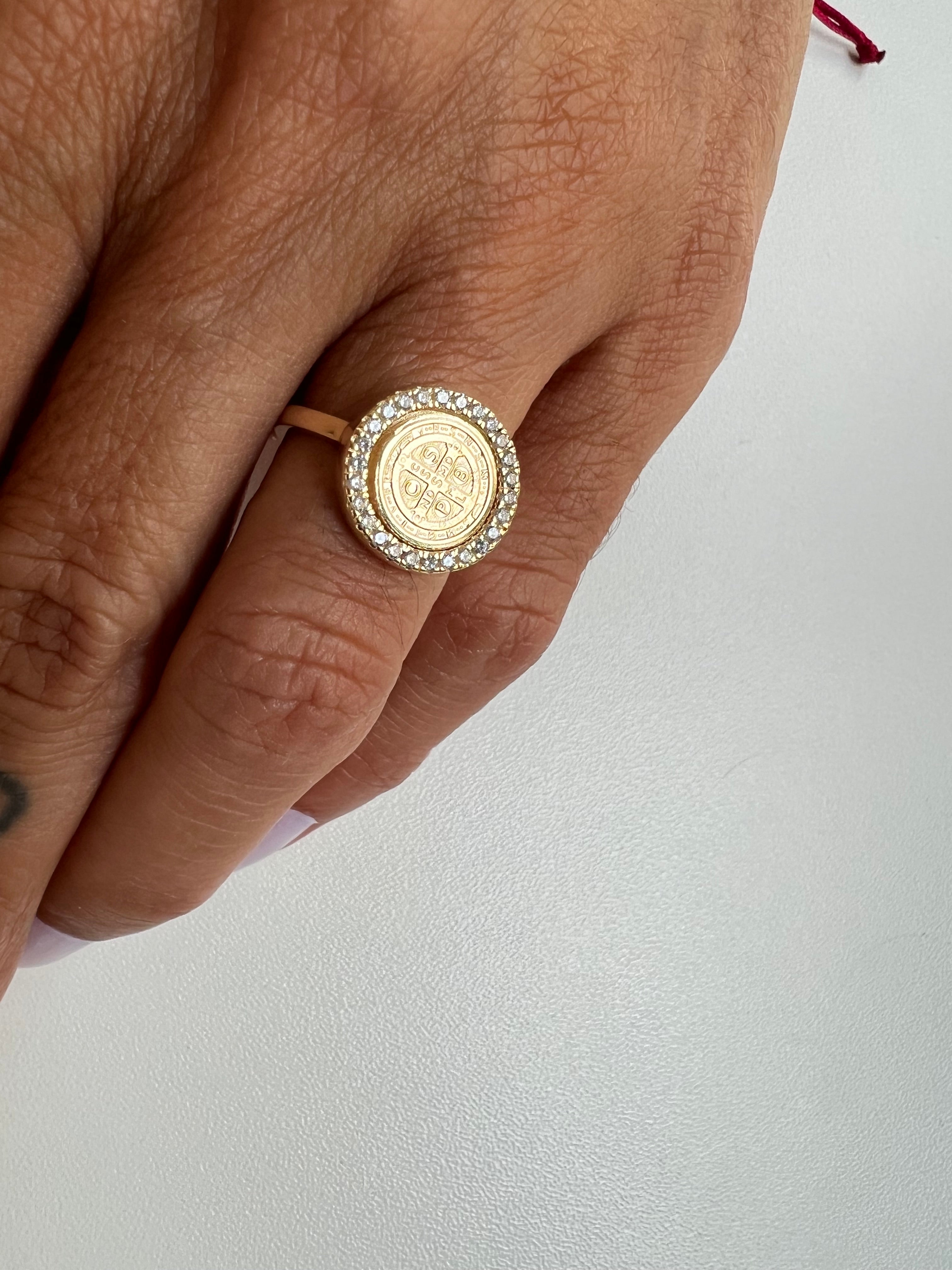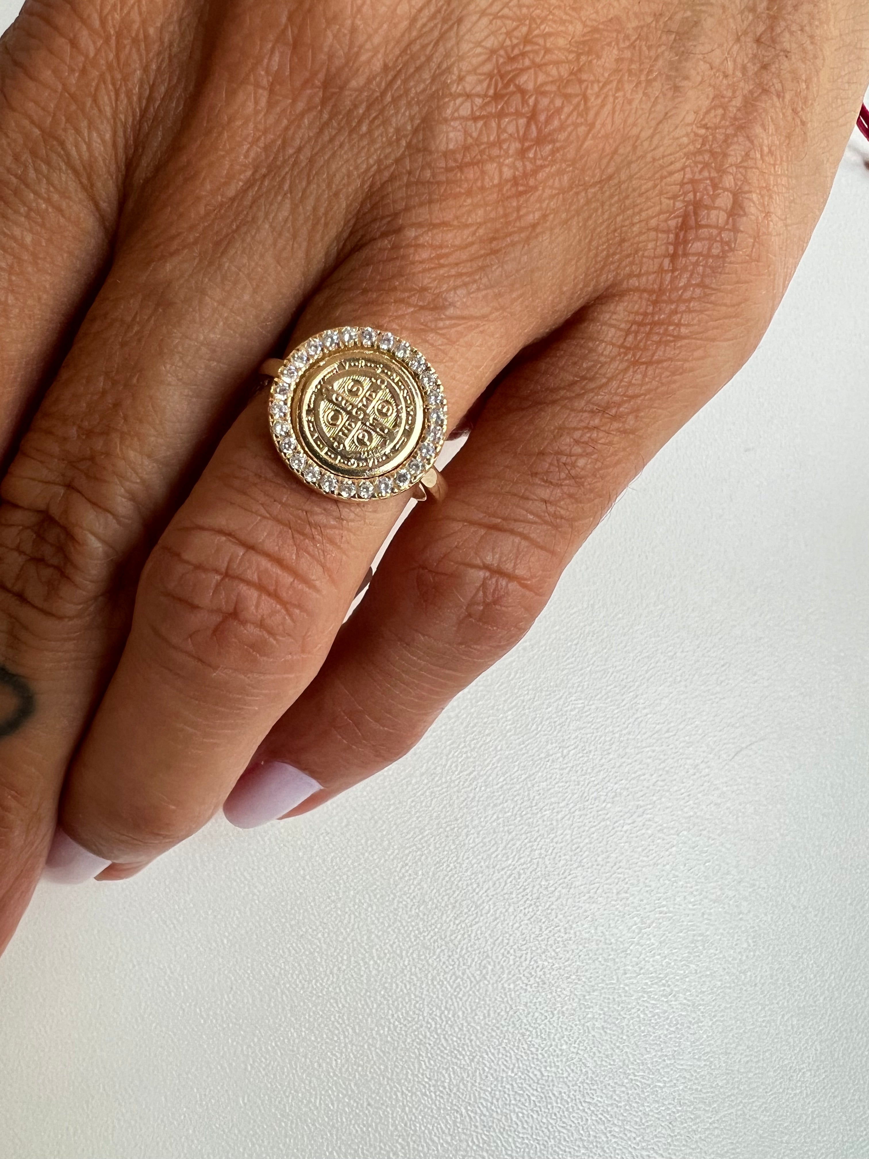 Este anel de prata 925 tem banho de ouro 18k e apresenta uma medalha de São Bento. Com sua combinação de metal precioso e símbolo sagrado, este anel é perfeito para quem busca elegância e proteção. Repleto de significado e beleza, é uma ótima escolha para adicionar à sua coleção de joias.