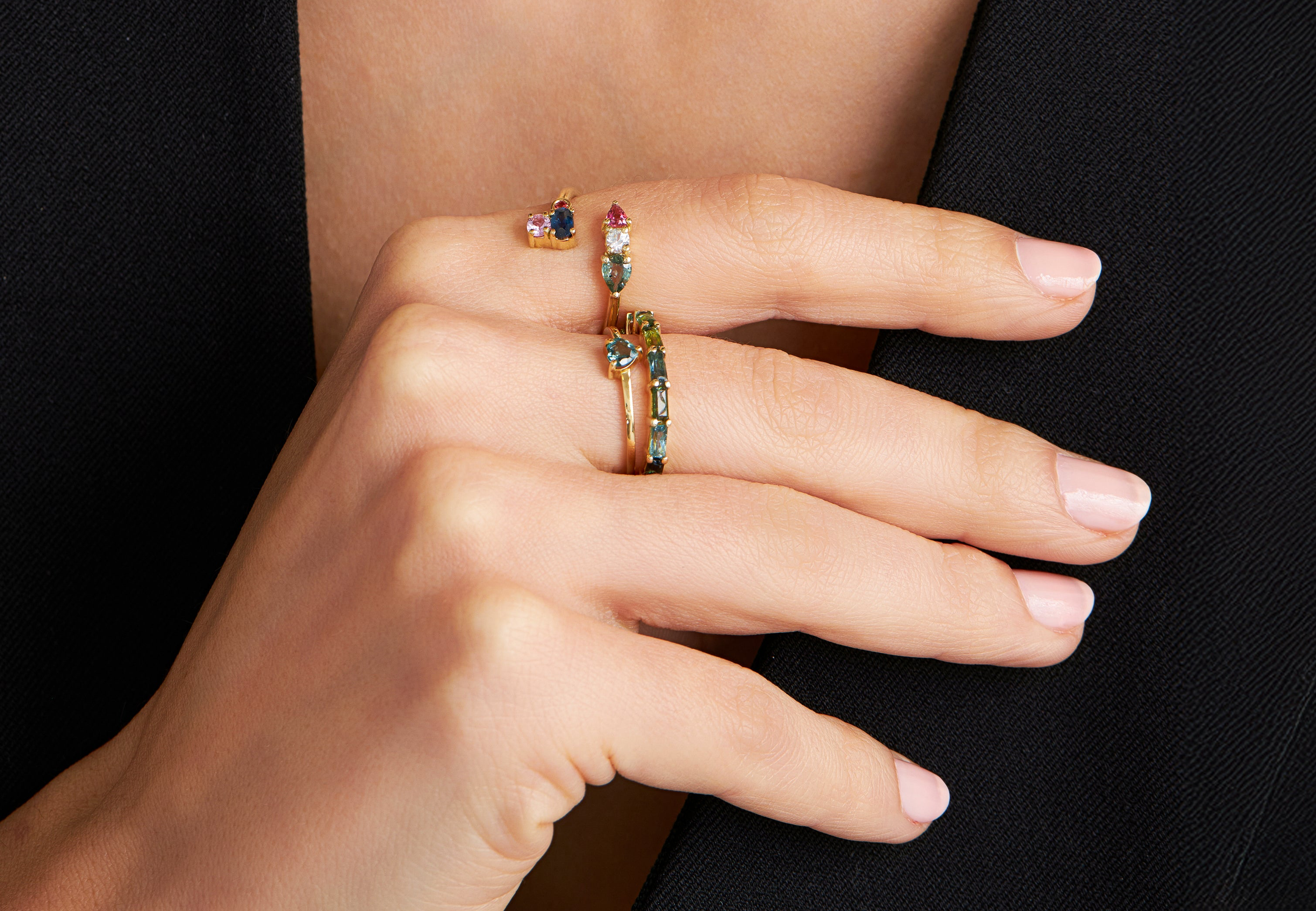 Descubra a elegância do Anel Saphiras colore. Feito em ouro 18k, possui um trilion de saphiras coloridas e três turmalinas, garantindo uma beleza única. O tamanho do aro é 16, proporcionando um ajuste perfeito ao seu dedo. Adquira agora e deixe sua mão ainda mais bonita!