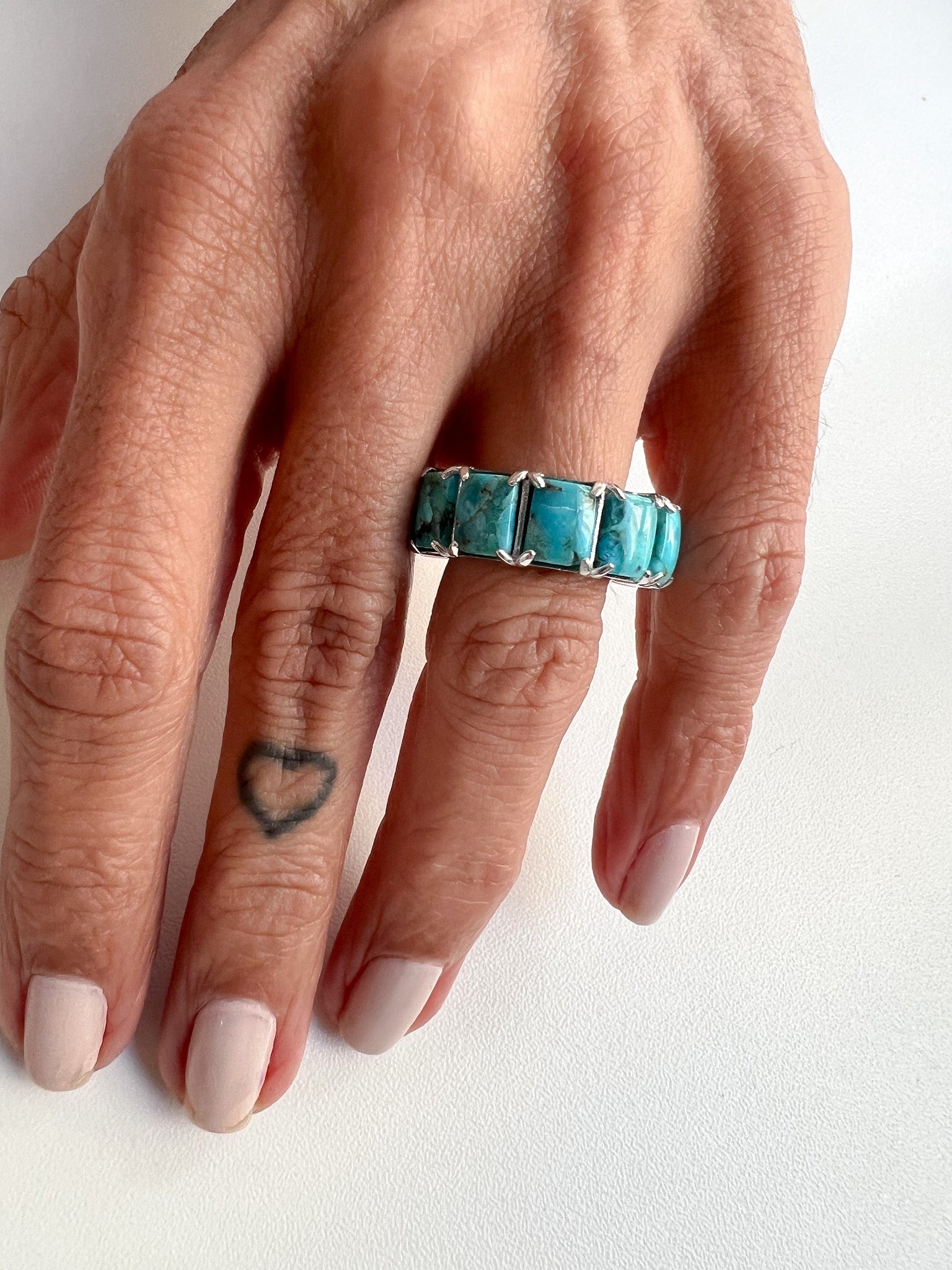 Este lindo anel é feito em prata 925 de alta qualidade, banhado em ródio para um brilho duradouro. Possui pedras quadradas de turquesa natural que adornam toda a sua volta, adicionando um toque de cor e elegância ao seu visual. Um acessório sofisticado e único para qualquer ocasião.Aro 14