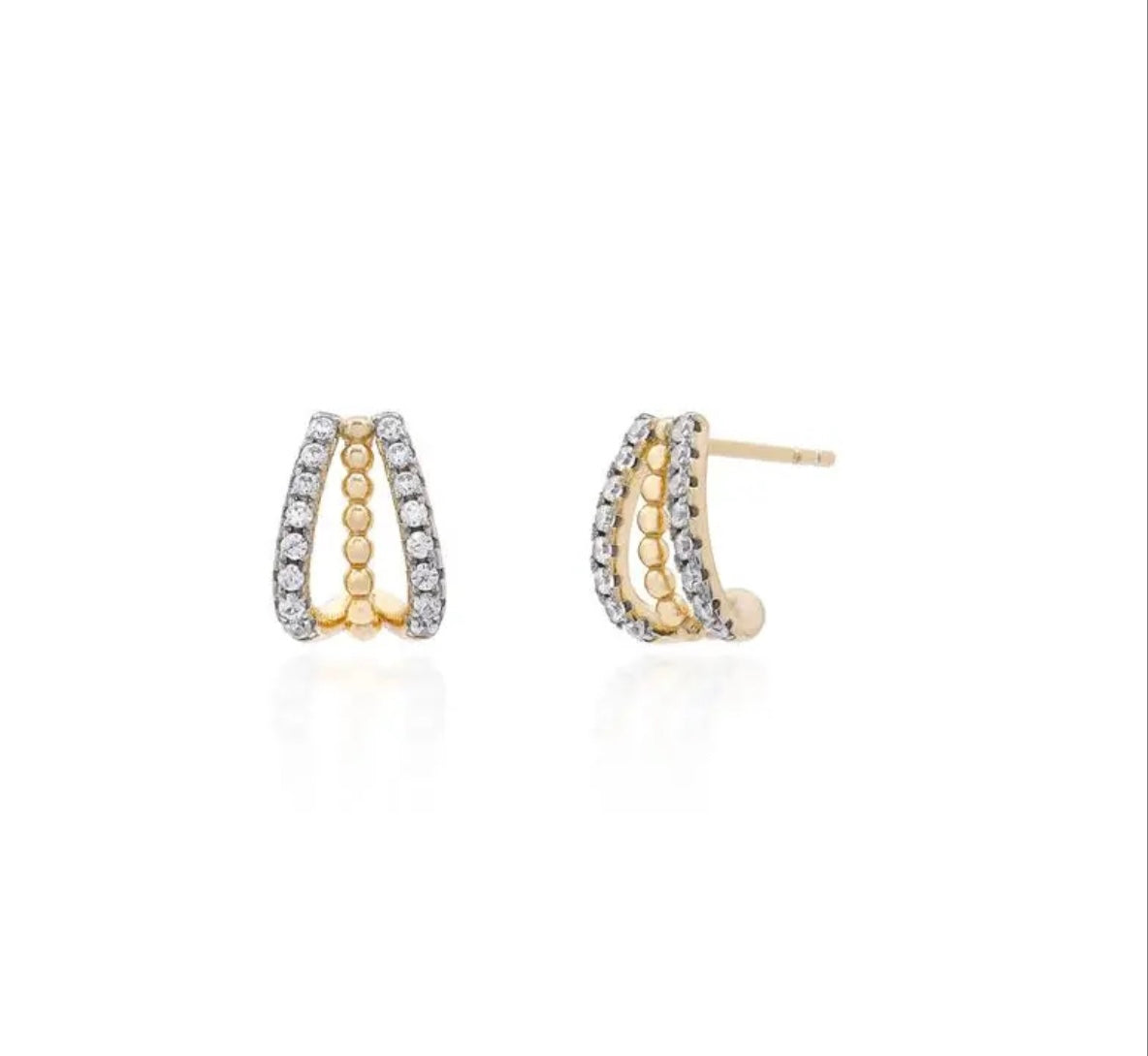 Adicione um toque de sofisticação ao seu visual com o Brinco Argola Duas Cores. Com encaixe perfeito na orelha e confeccionado em prata 925 com banho de ouro, este brinco apresenta uma fileira de bolinhas e duas fileiras com cravações de zircônias rodinadas para maior brilho e elegância.