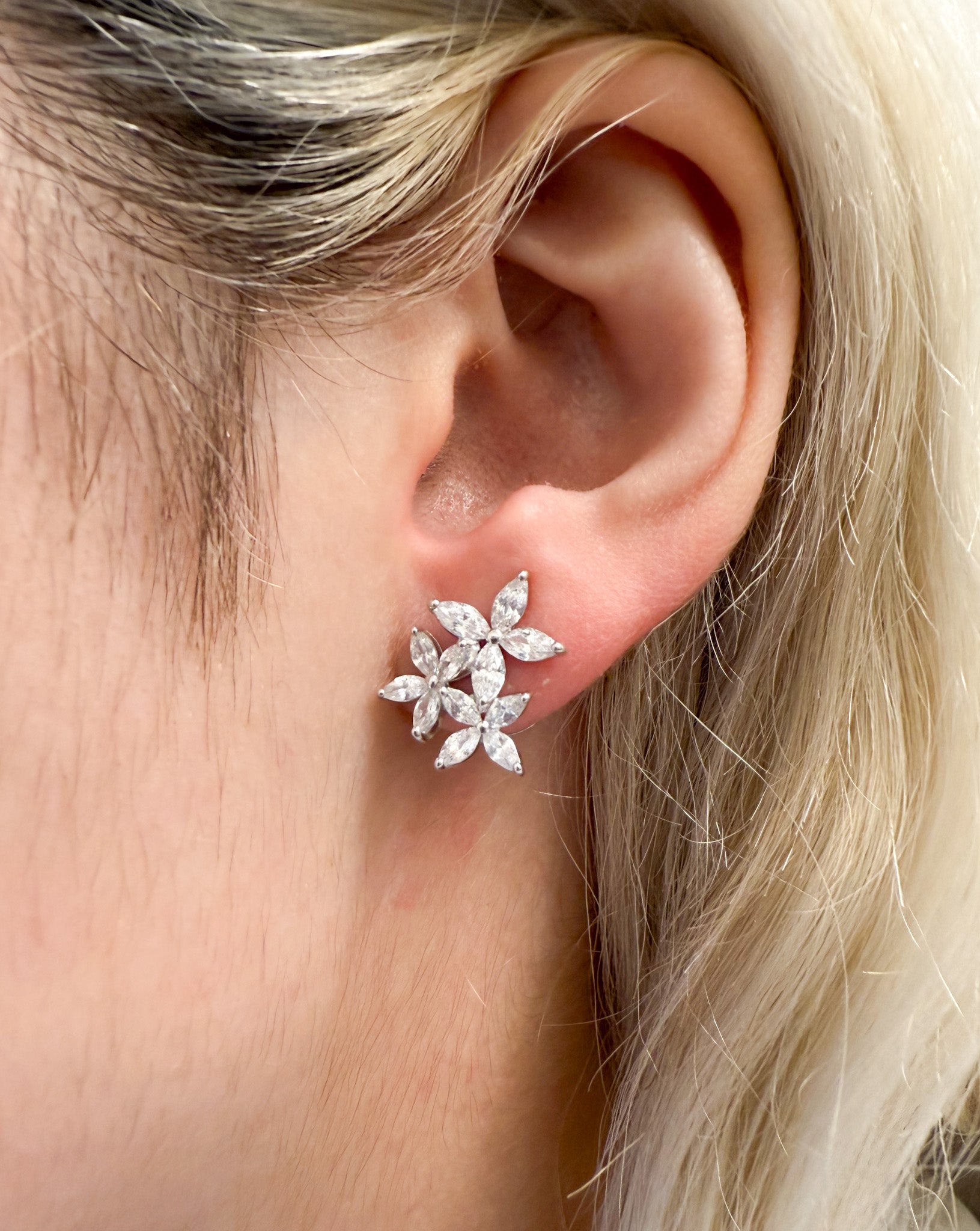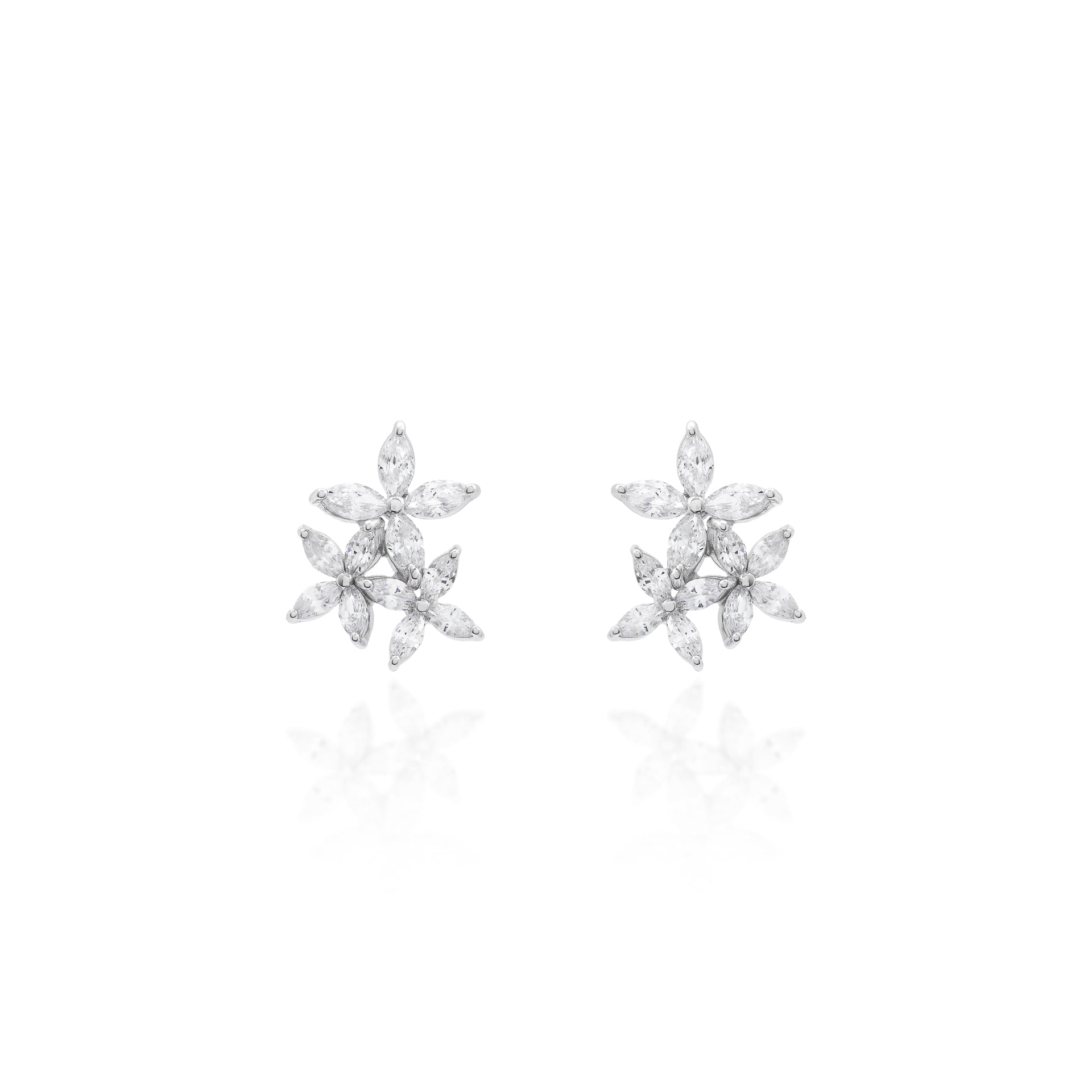 Brinco de prata 925 banhado em ródio com navetes de zircônia de 2mm em formato de 3 pétalas para um visual elegante. Com 1.5 cm de comprimento e pino central para maior segurança. Adicione brilho e sofisticação ao seu look com este brinco.