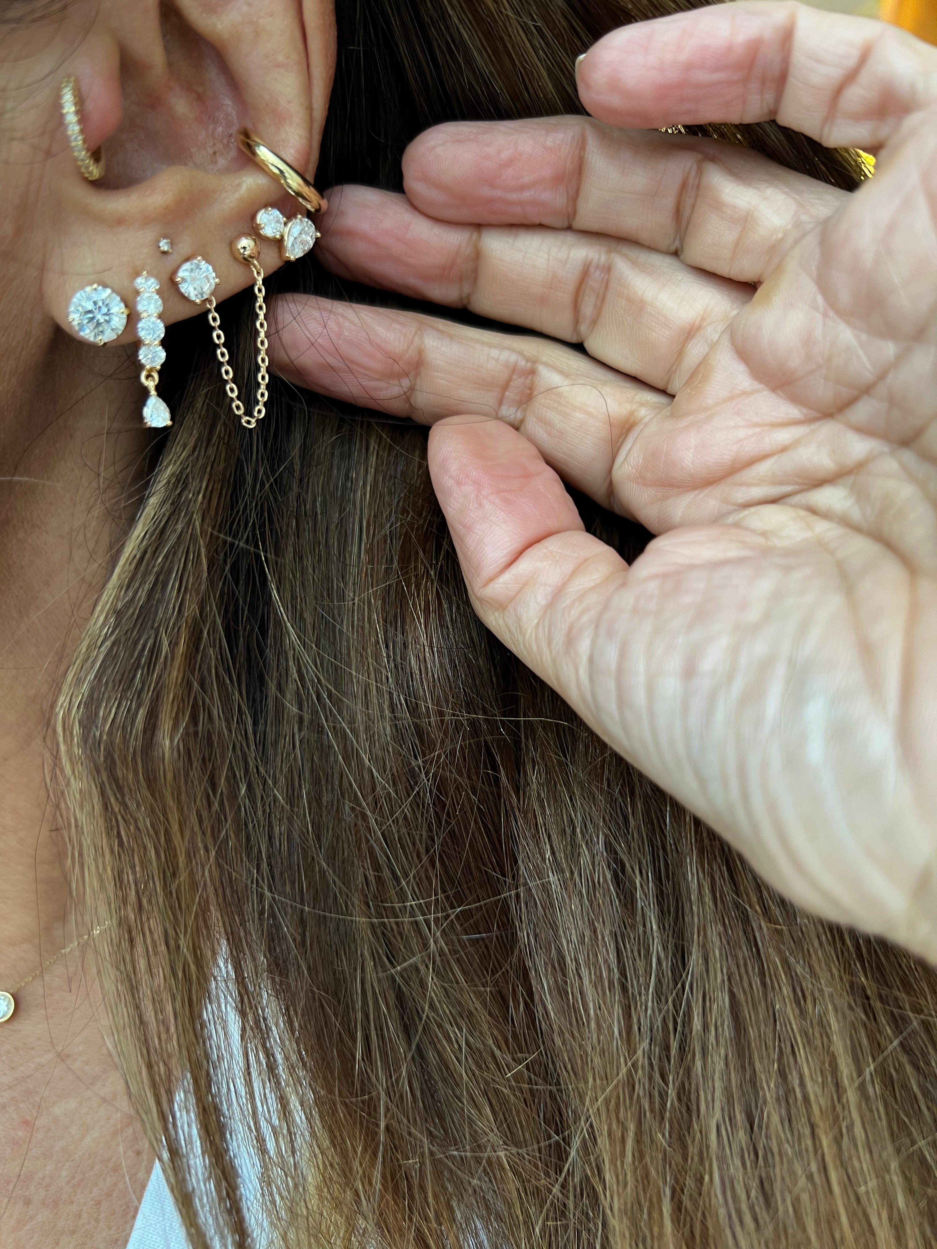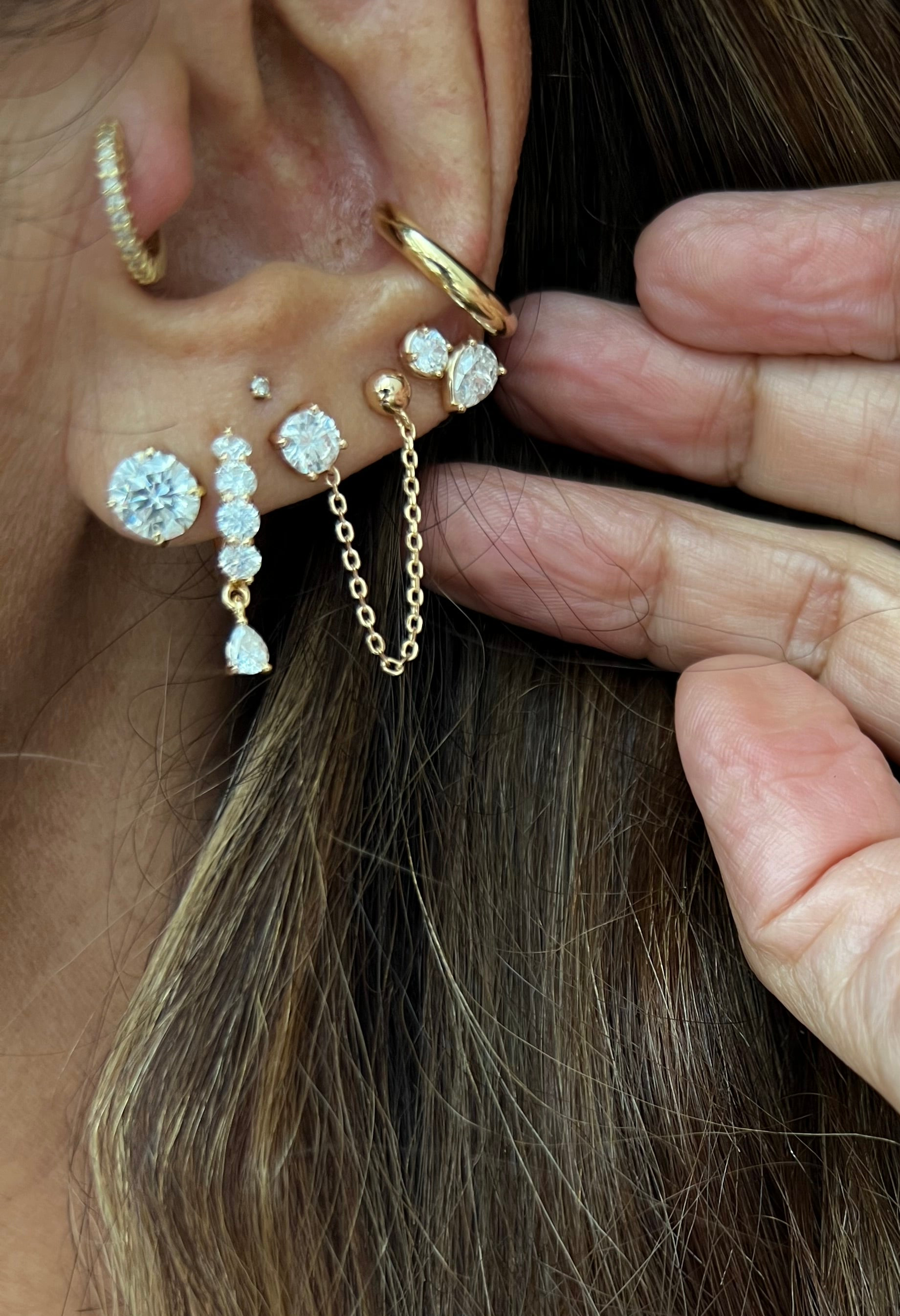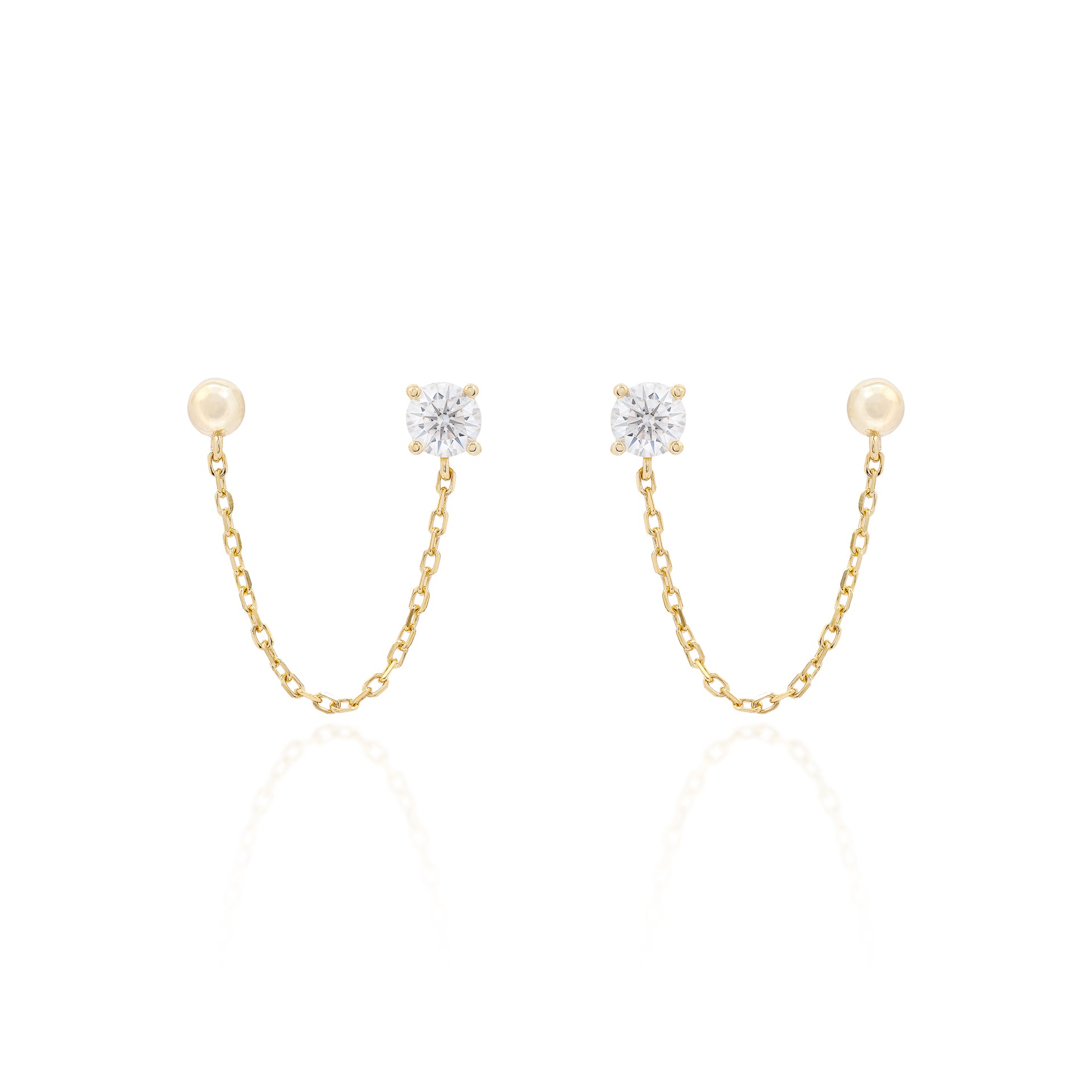 O Brinco corrente moissanite Zoé é ideal para quem busca elegância e sofisticação. Confeccionado em prata 925 com banho de ouro, possui uma pedra de moissanite de 1.00ct que garante brilho intenso e duradouro. Com design moderno, é perfeito para ser usado em dois furos, proporcionando um visual único e elegante.