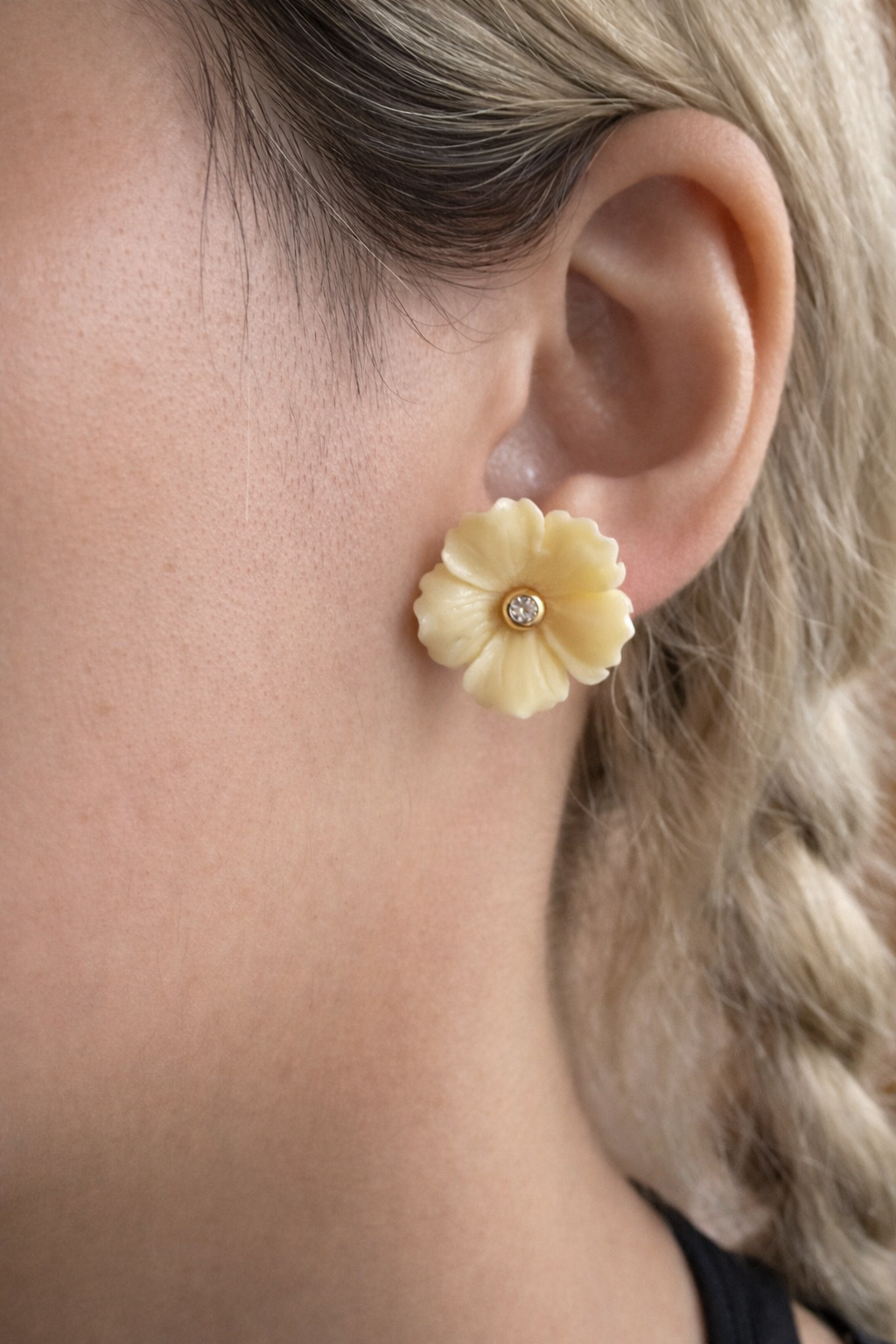 Brinco flor banho de ouro com Bakelite off white com pino central