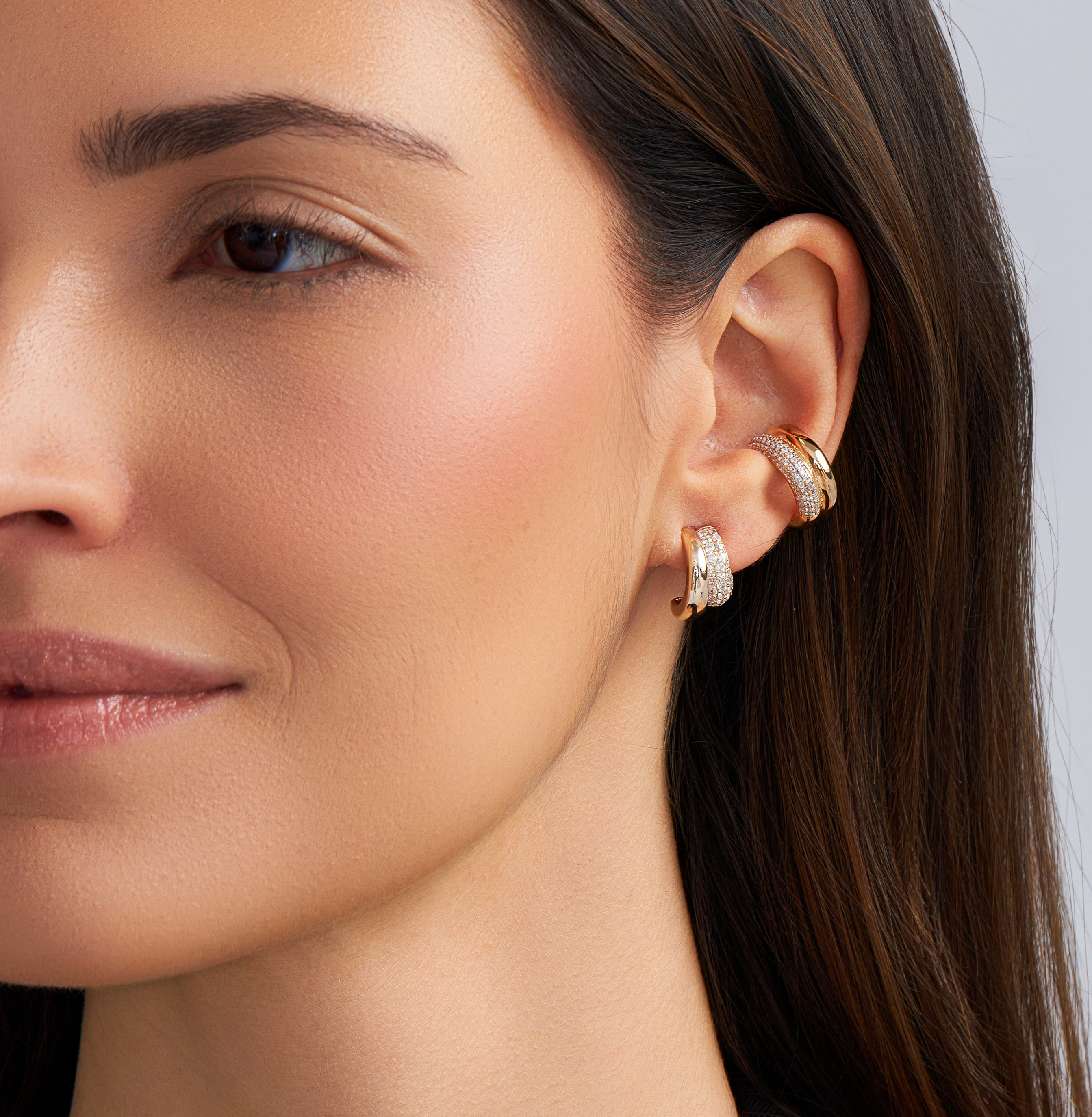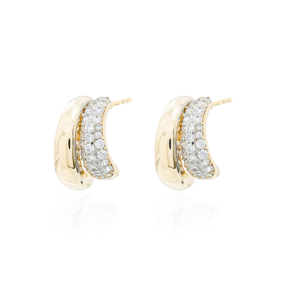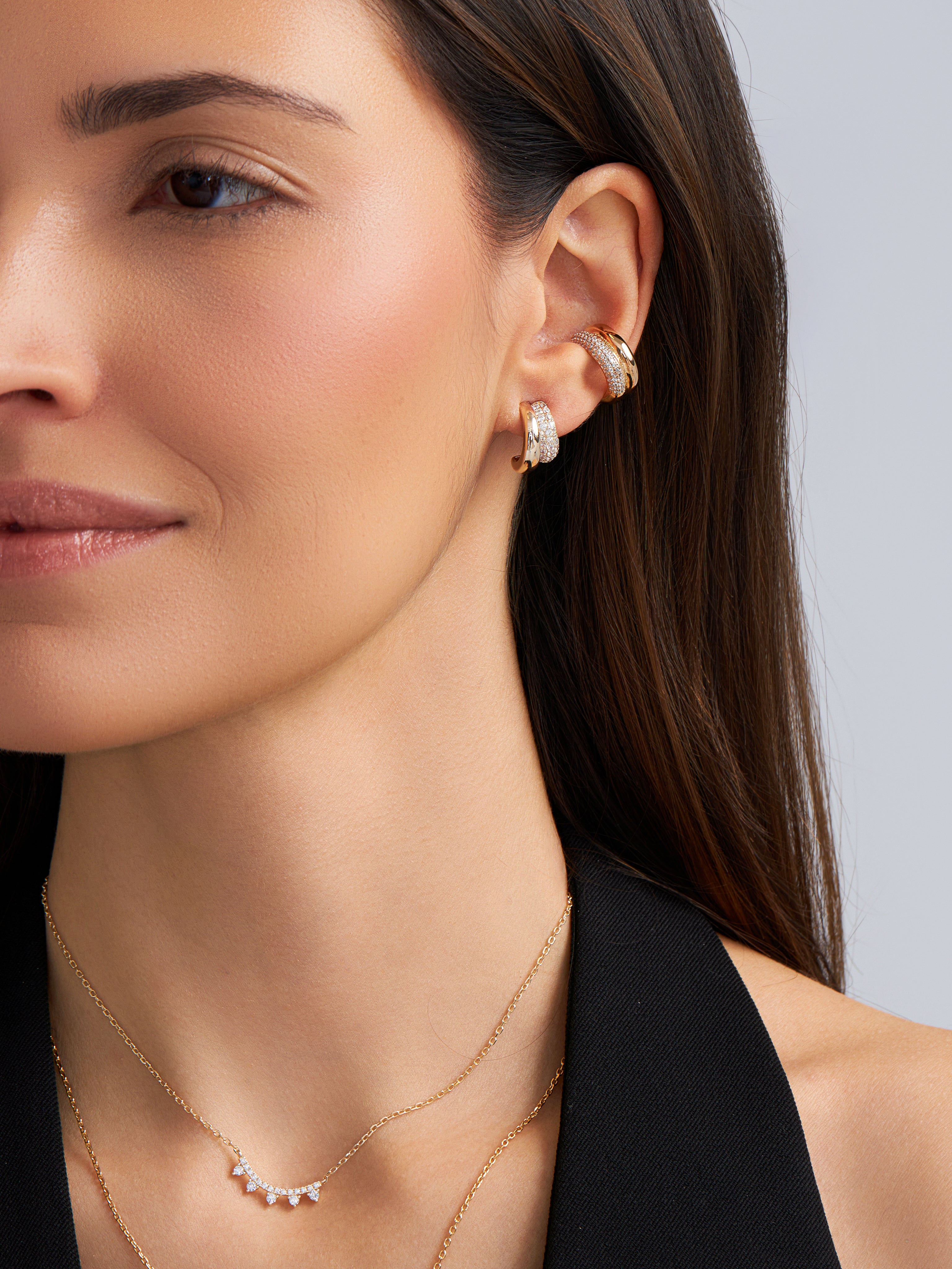Apresentamos o elegante Brinco Justine, um modelo de meia argola dupla cravejado com zircônias brancas e uma menor lisa de prata 925 com banho de ouro 18k. Adicione um toque de brilho e sofisticação aos seus looks com este lindo brinco.