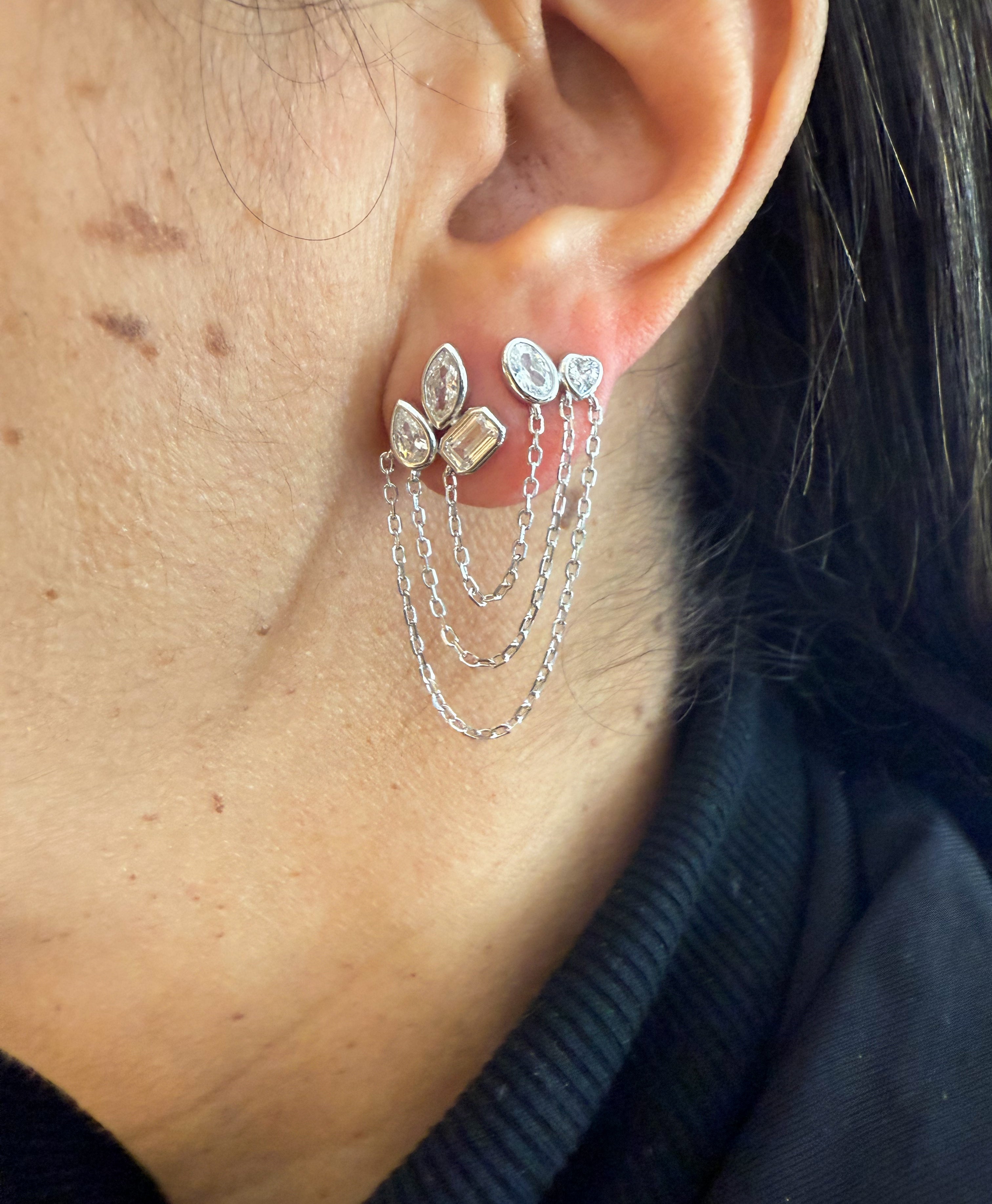 Este brinco Luli é feito de prata 925 com banho de ródio, com cravações inglesas e correntes. Um par é vendido no produto. Adorne suas orelhas com o estilo e qualidade deste brinco que é resistente e elegante, perfeito para qualquer ocasião.precisa ter dois furos em cada orelha .