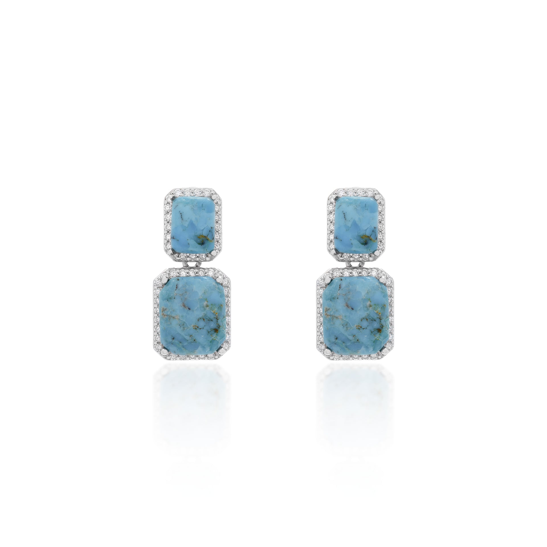Este elegante Brinco Oceane Duplo é feito de prata 925 com banho de ródio, dando brilho e durabilidade. Com pedras naturais turquesas e pedras de moissanites de 0.62 ct,cravação princess ,este brinco traz a beleza única da natureza para sua coleção. Sua base retângulo de 5mm e pedra central de 8mm criam uma combinação perfeita de elegância e design contemporâneo.