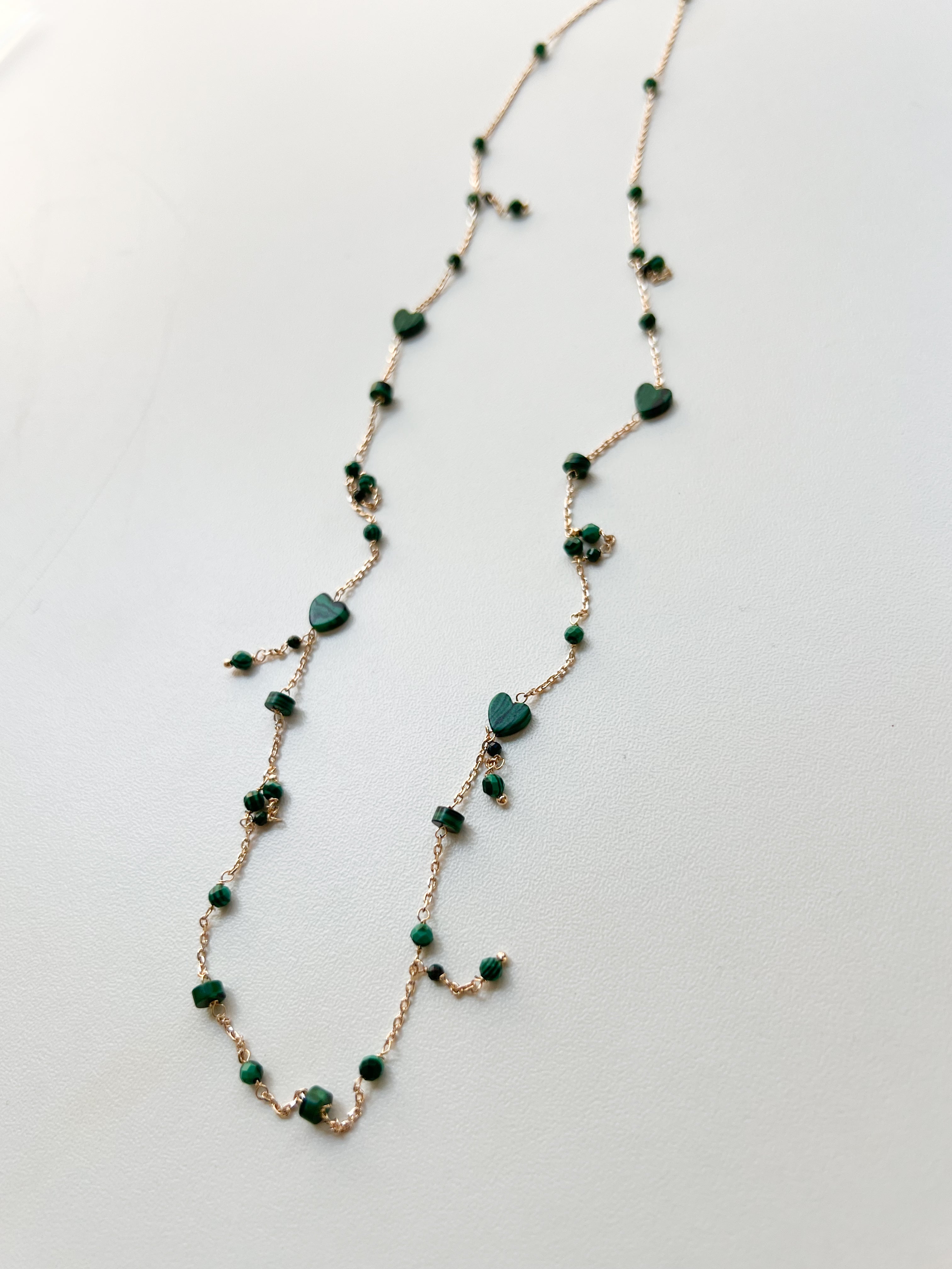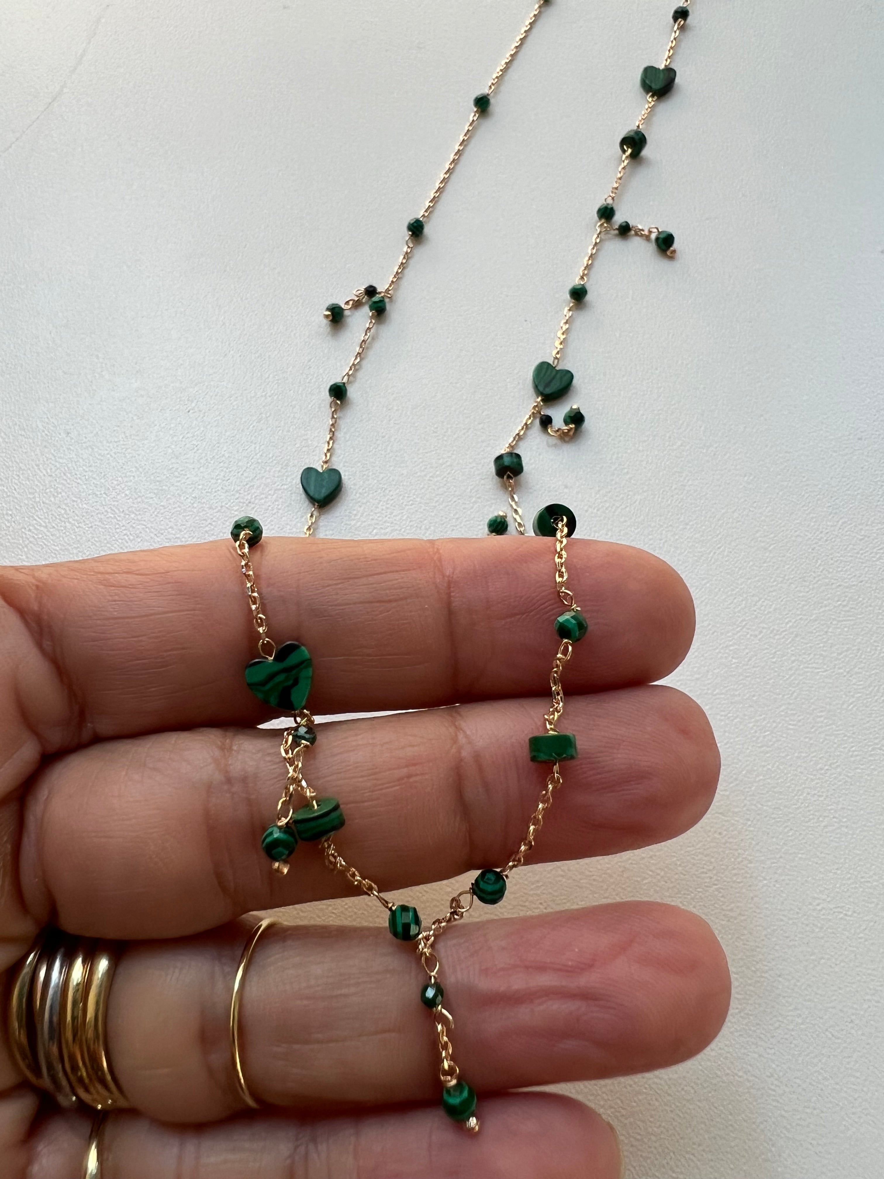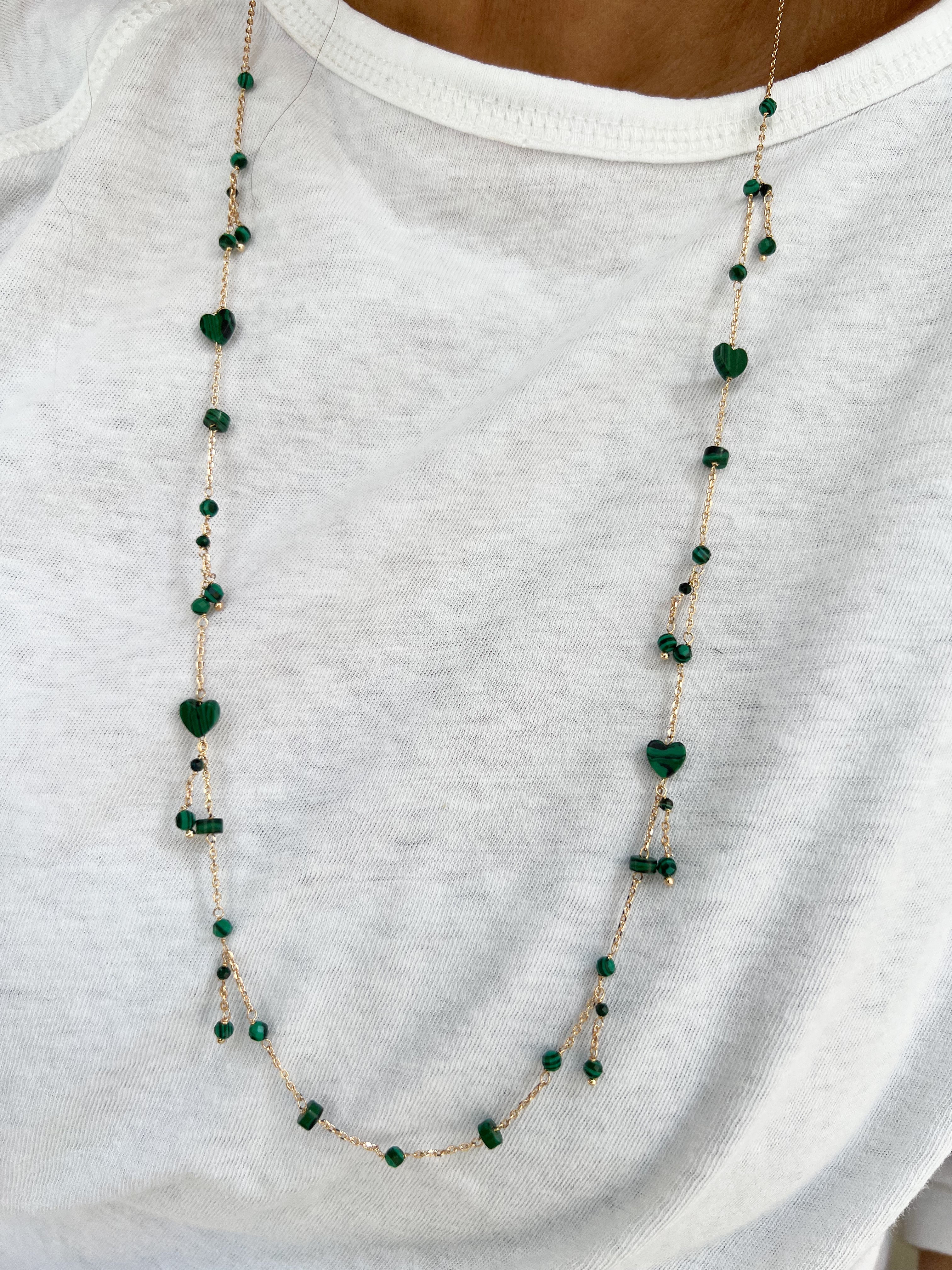 Este colar alongado apresenta delicados coraçõezinhos em malaquita, uma pedra conhecida por sua beleza única e propriedades energéticas. Com banho de ouro 18k, oferece durabilidade e um acabamento sofisticado. Medindo 72 cm, é perfeito para quem busca uma peça elegante que valoriza qualquer look com um toque de exclusividade e requinte.