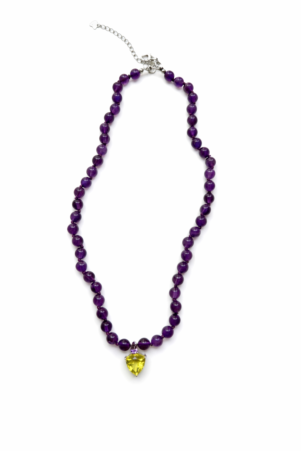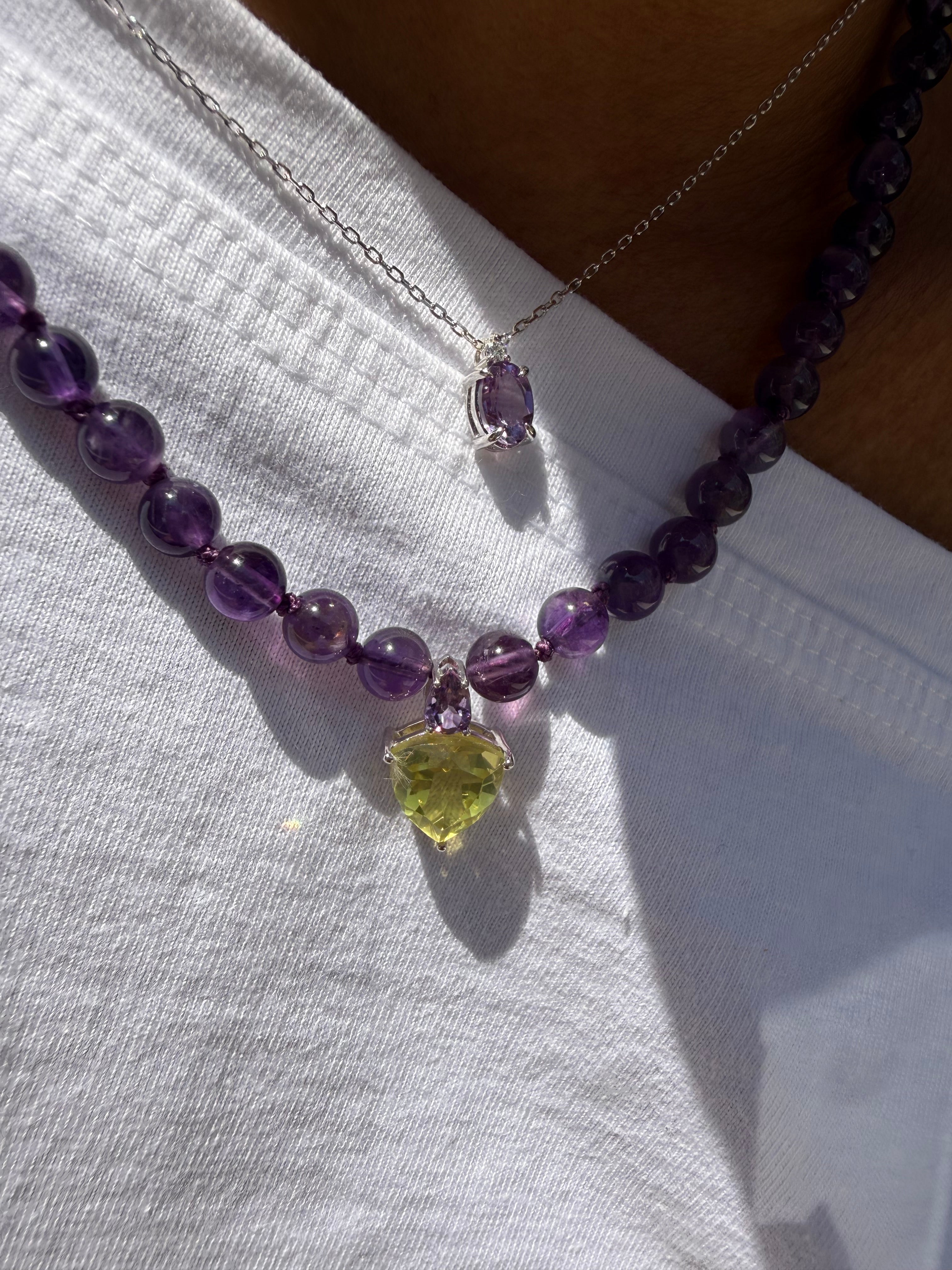 Colar de pedras naturais ametistas e green gold ,com fecho de prata 925 com banho de ródio,com 40 cm mais 5cm de extensores.