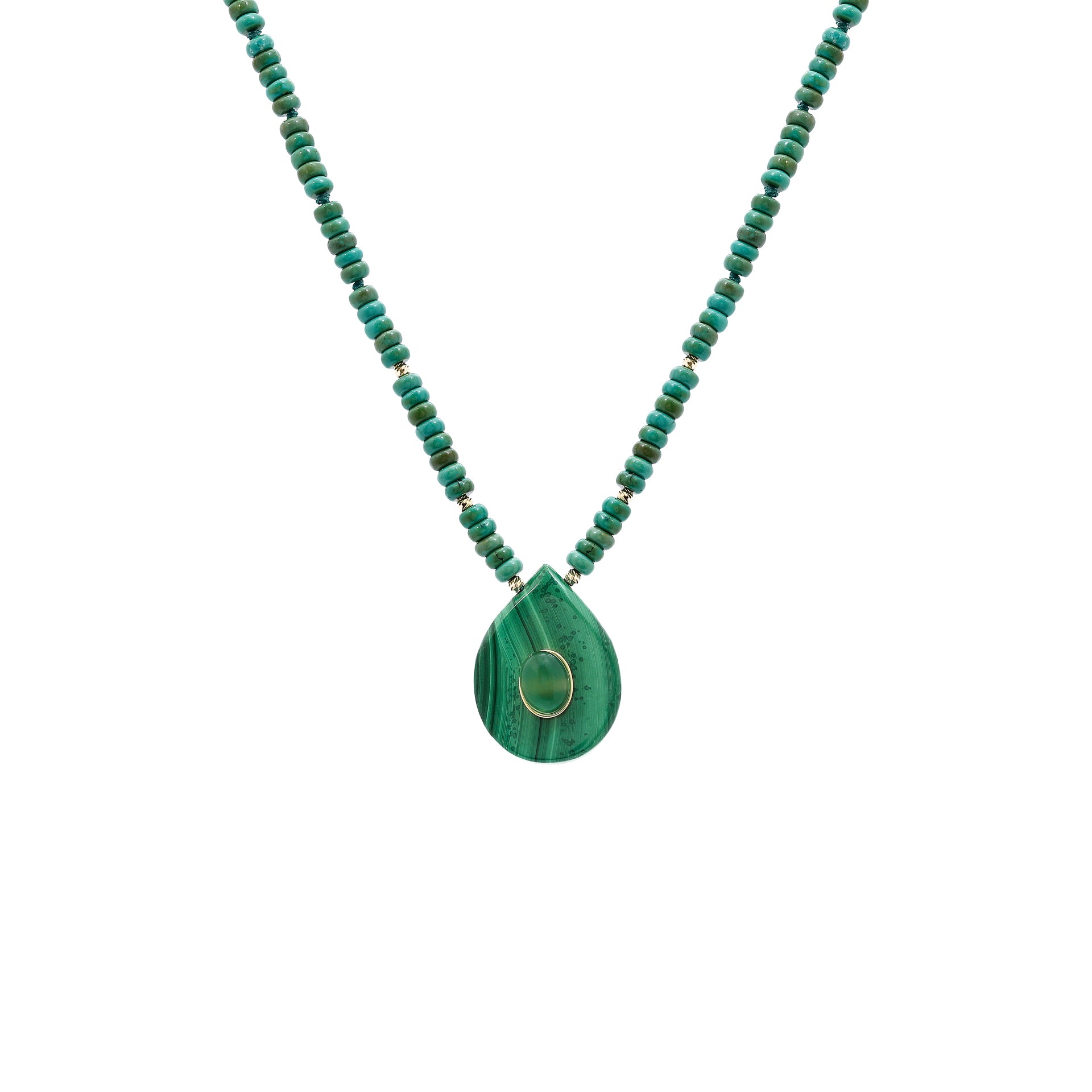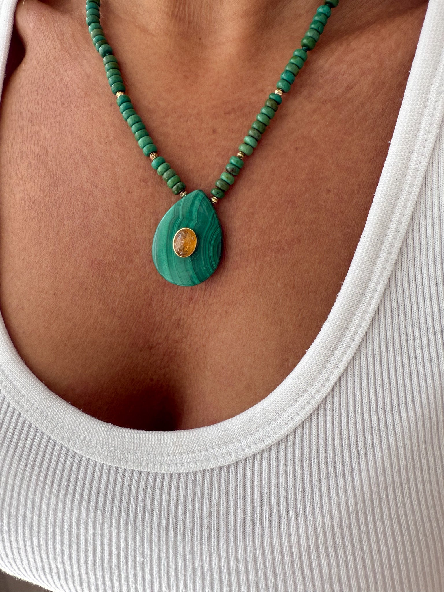 Com o Colar Malaquitas Gota, você terá elegância e proteção. Feito com pedras naturais malaquitas, incluindo uma gota e uma pedra de cabuchom de citrino, este colar de 45 cm é perfeito para quem busca equilíbrio e boas energias. Adicione um toque especial ao seu visual com este colar único.