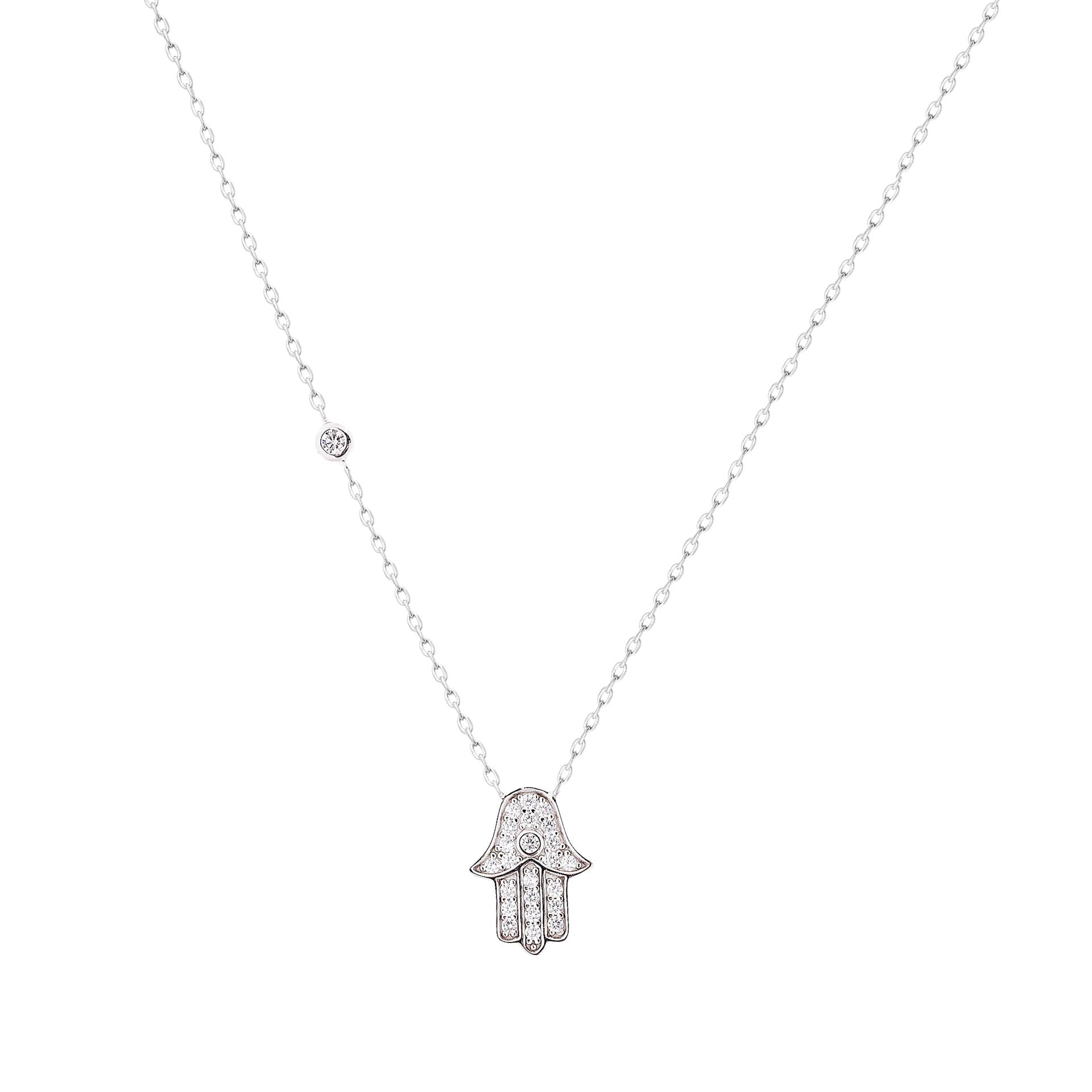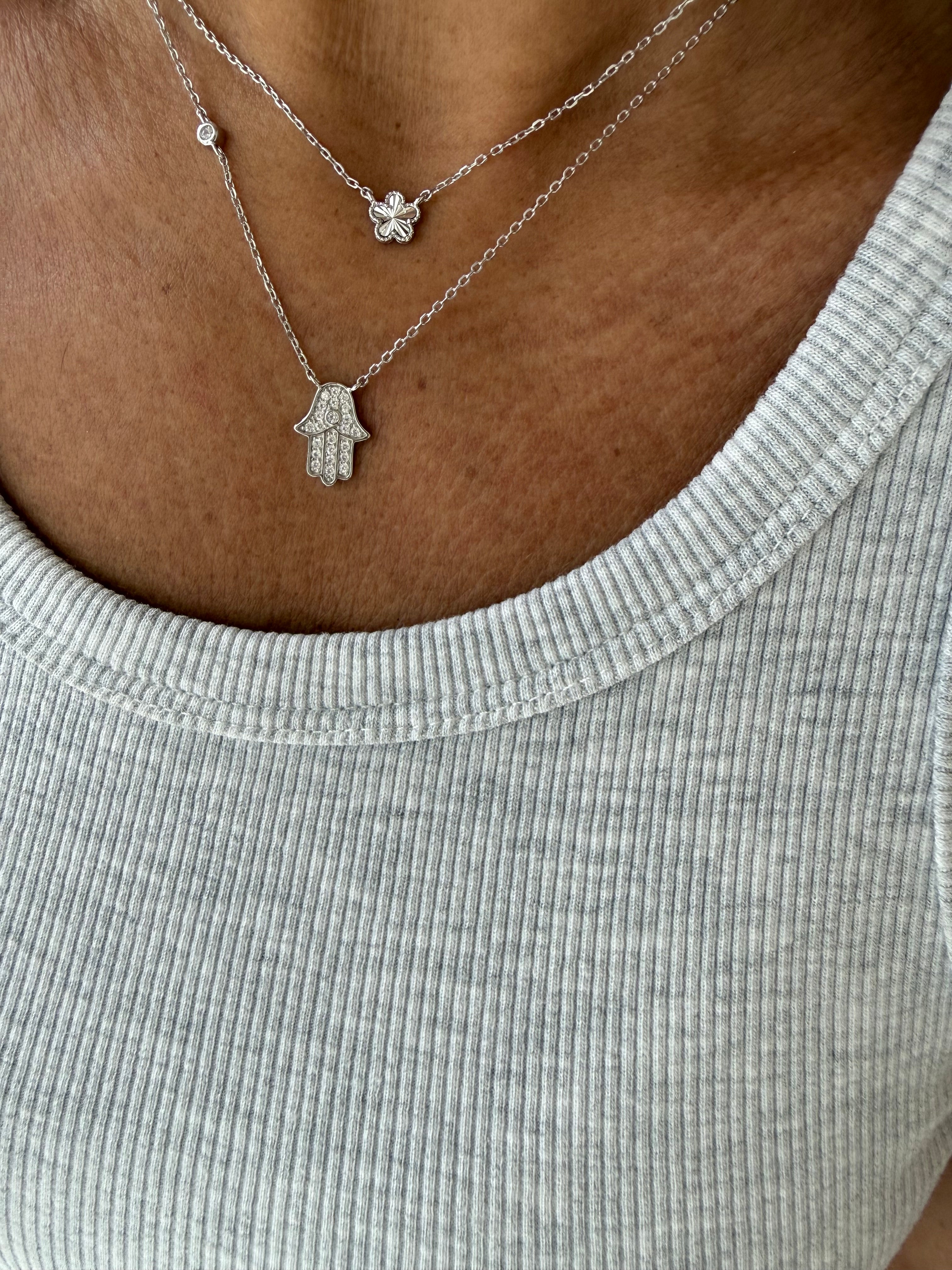 Colar de prata 925 com banho de ródio ,com pingente de hamsa com uma zirconia,45 cm