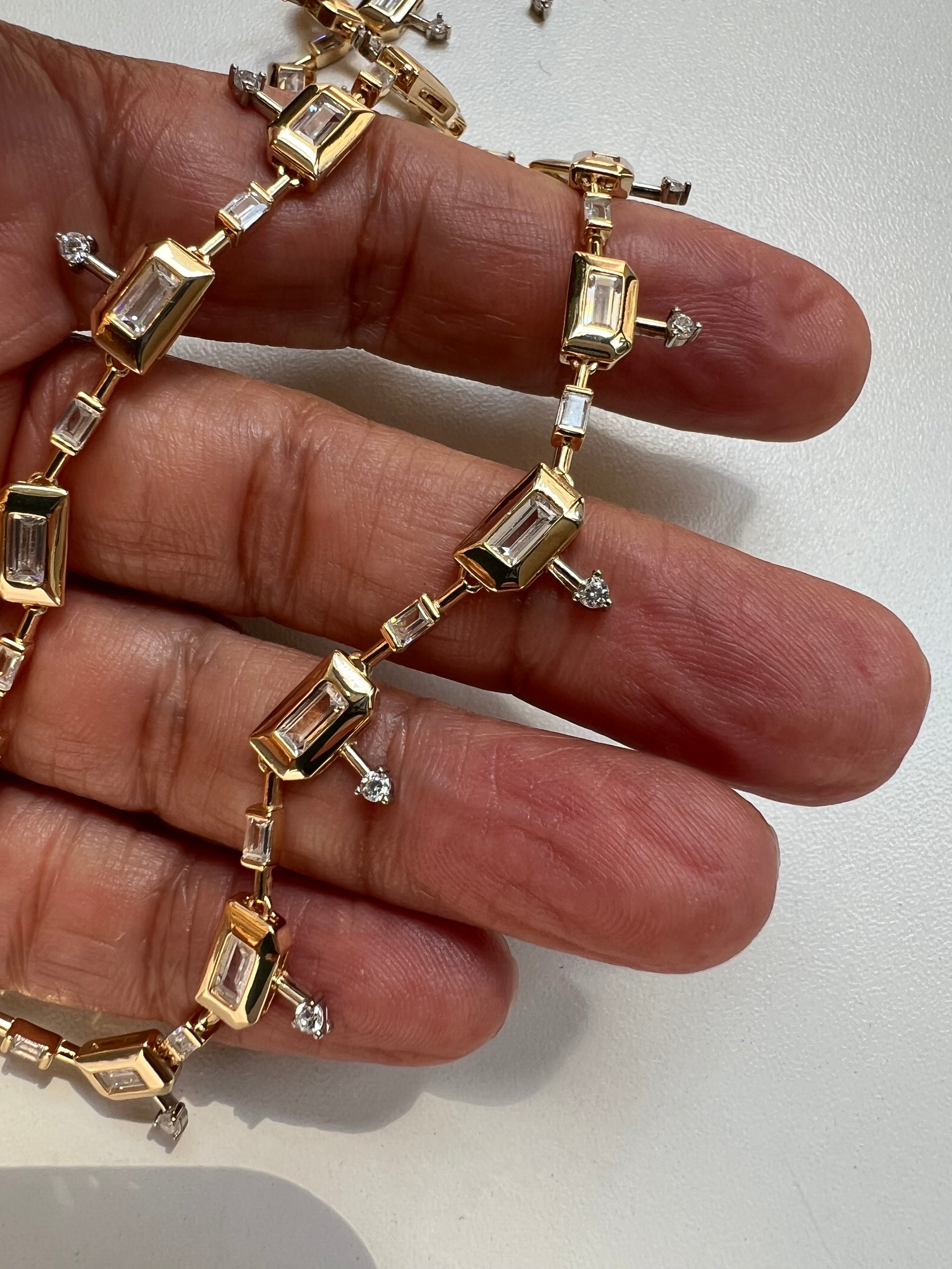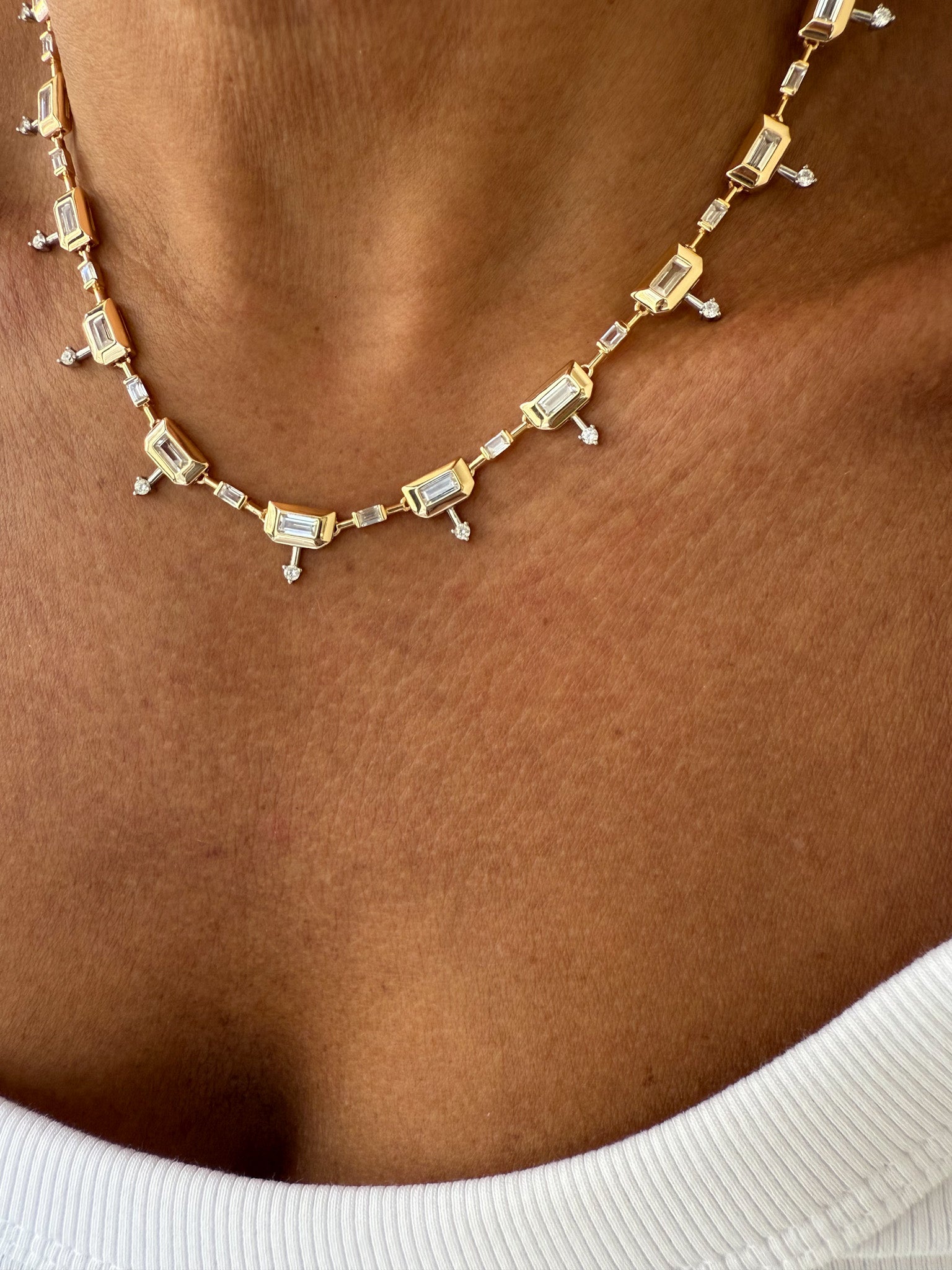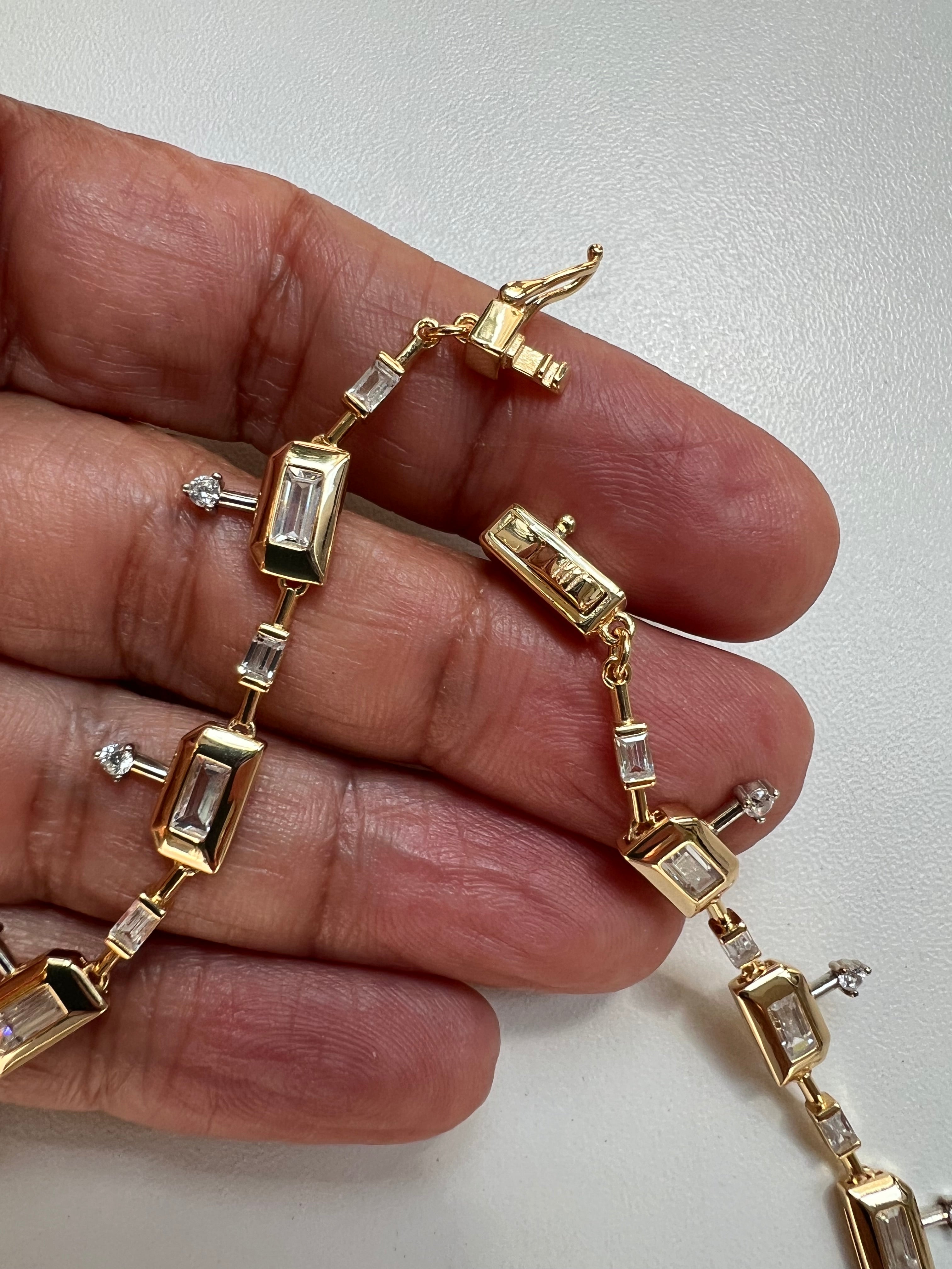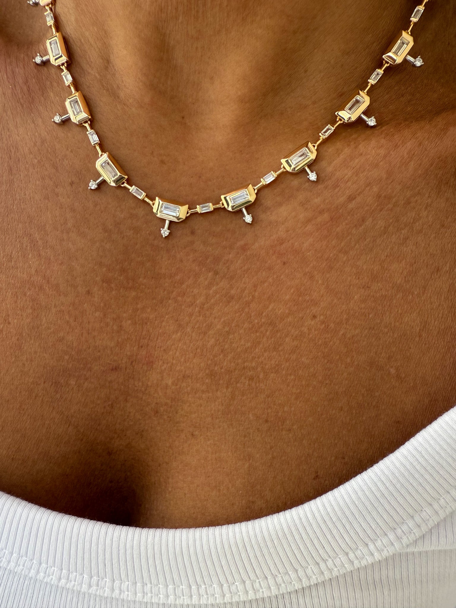 Este colar Margot é feito em prata 925 com banho de ouro 18k, o que garante sua durabilidade e resistência. Possui detalhes de zircônias e cristais translúcidos que dão um toque elegante e sofisticado à peça. Com um comprimento de 42 cm e fecho caixa, é perfeito para complementar qualquer look de forma discreta e luxuosa.