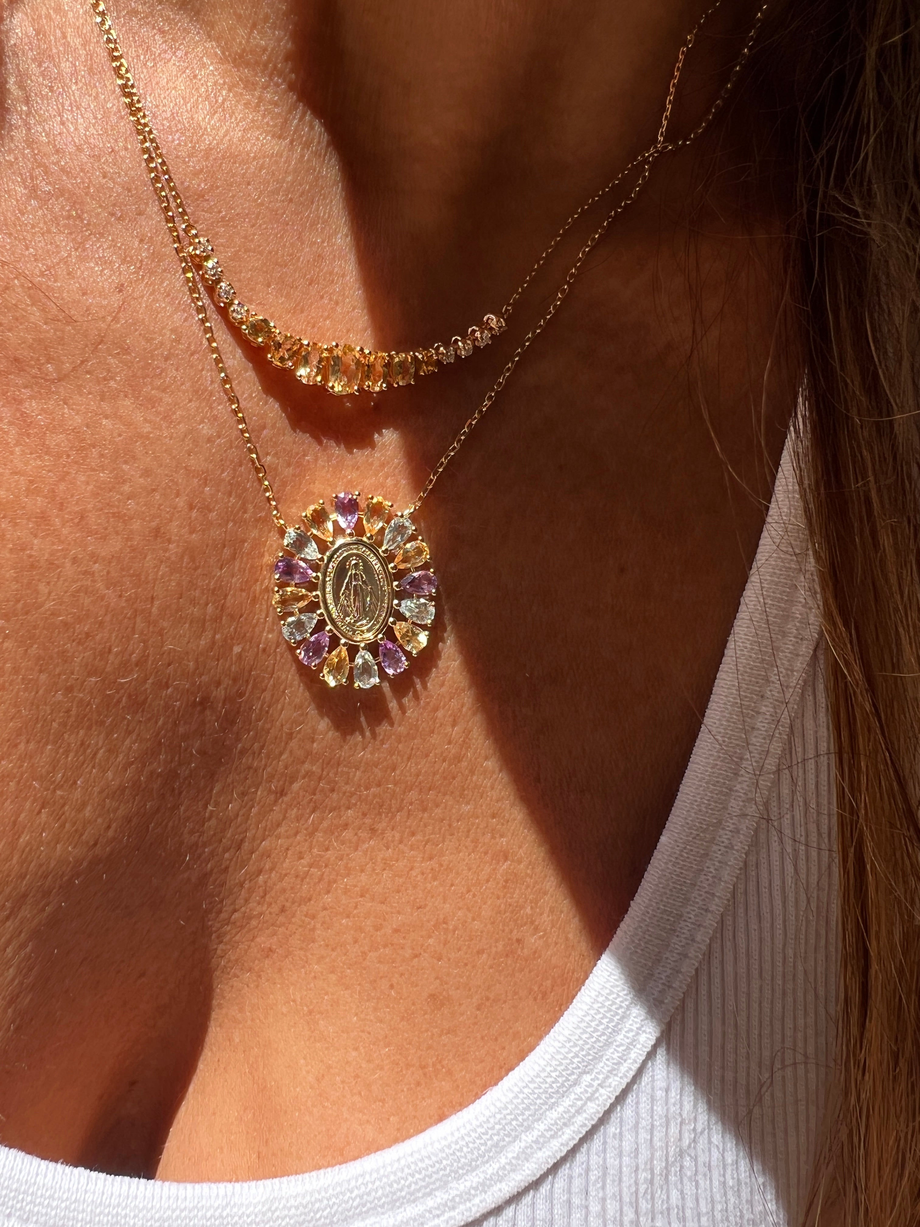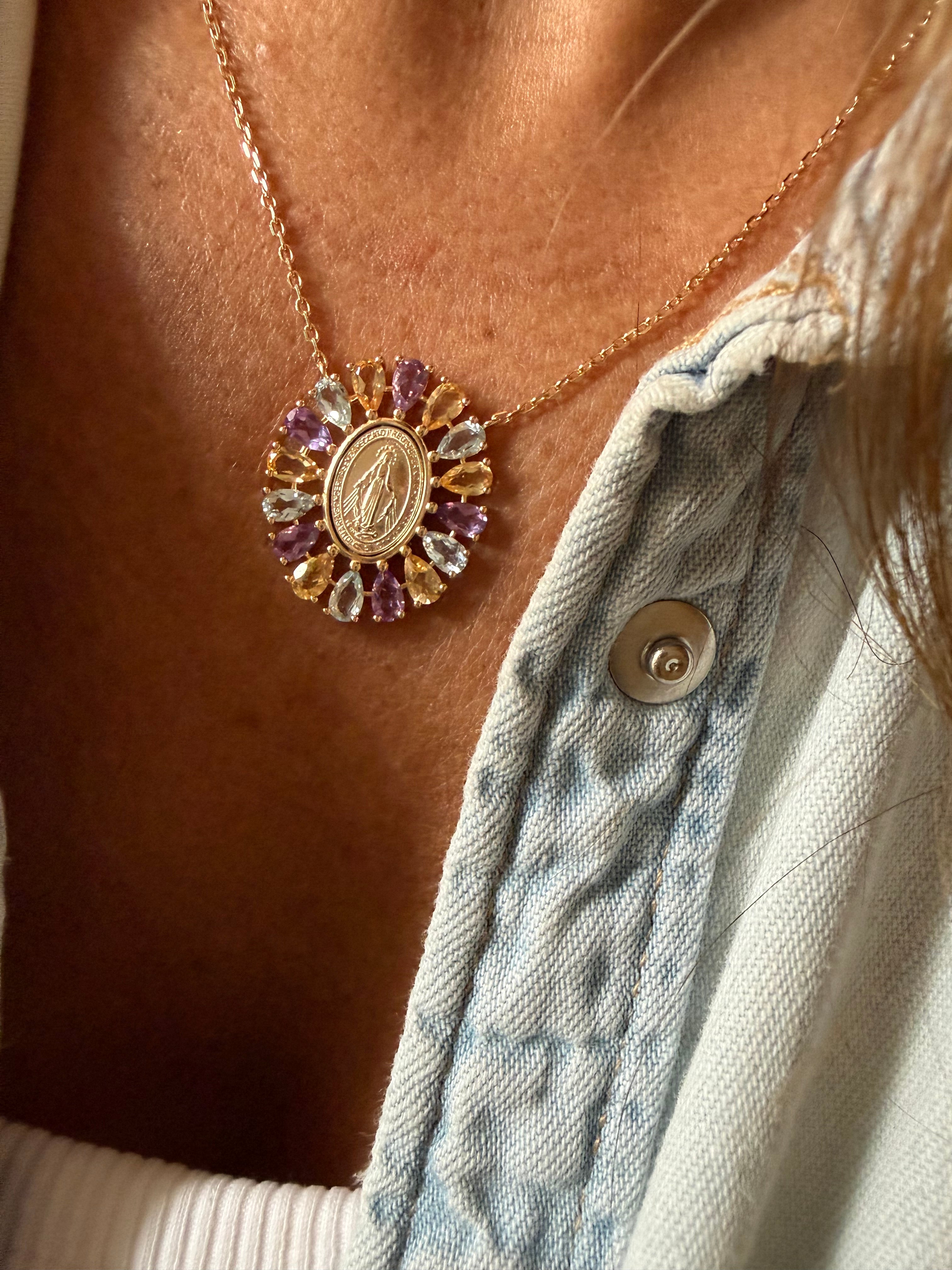 O colar Medalha Milagrosa é confeccionado em prata 925 com banho de ouro 18k. Apresenta uma medalha Milagrosa e é adornado com pedras naturais, incluindo citrino, sky e ametista. Este conjunto de materiais não apenas confere elegância, mas também é conhecido por suas propriedades energéticas e estéticas.