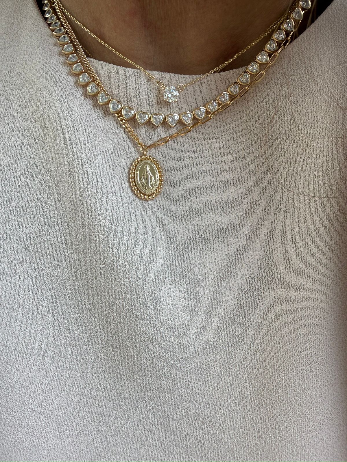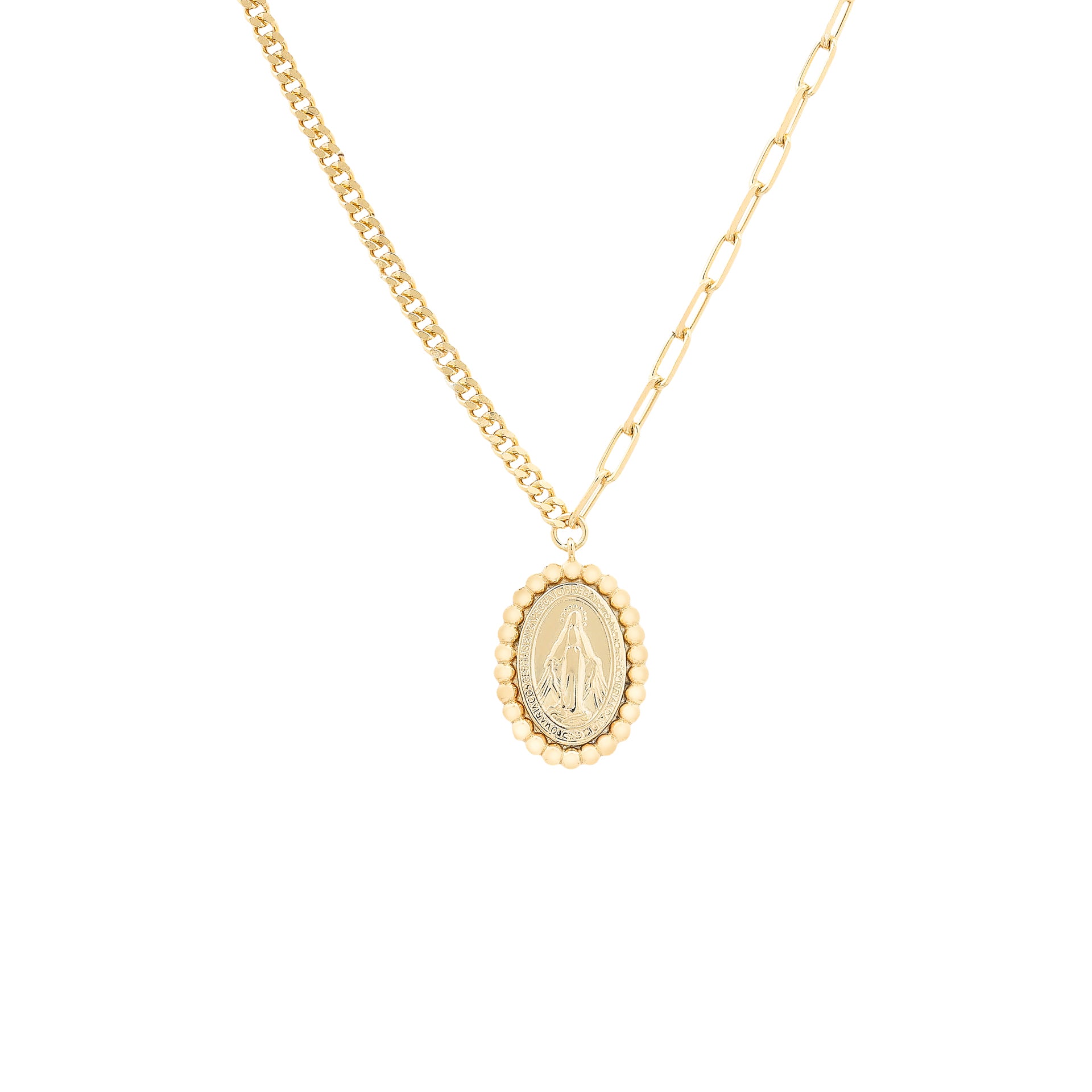 O colar Medalha Milagrosa Metade Elos é confeccionado em prata 925 com banho de ouro 18k, garantindo durabilidade e brilho. Com 40 cm de comprimento e 5 cm de extensores, oferece versatilidade no uso. A medalha Granada é apresenta detalhes em ambos os lados, proporcionando um aspecto sofisticado e simbólico.
