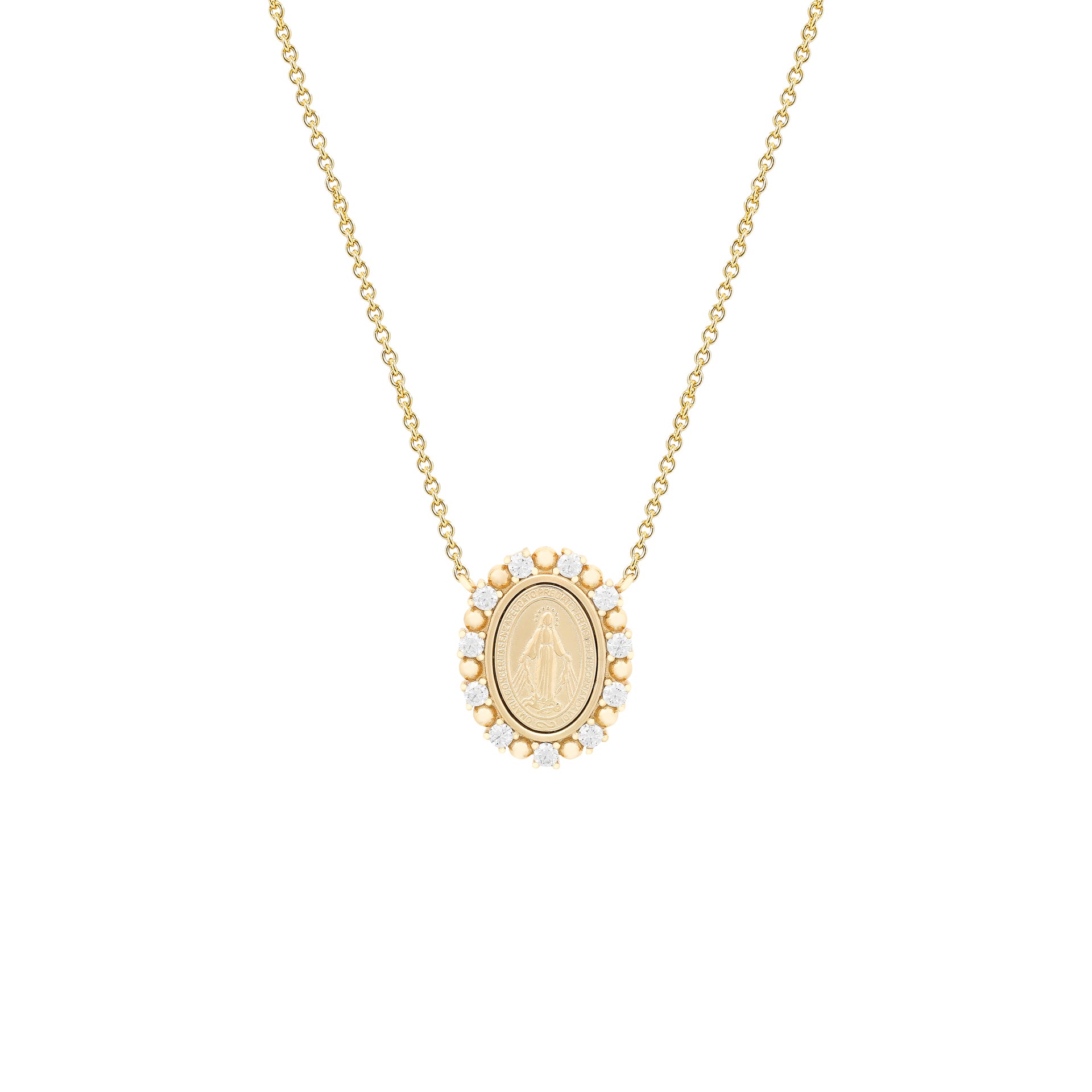 O colar Medalha Milagrosa em prata 925 com banho de ouro 18k apresenta uma cravação interna intricada e pedras moissanites de 0,33 ct (2 mm). A combinação de materiais nobres e pedras de alta qualidade maximiza a durabilidade e o brilho, tornando-o uma peça elegante e resistente ao desgaste diário.