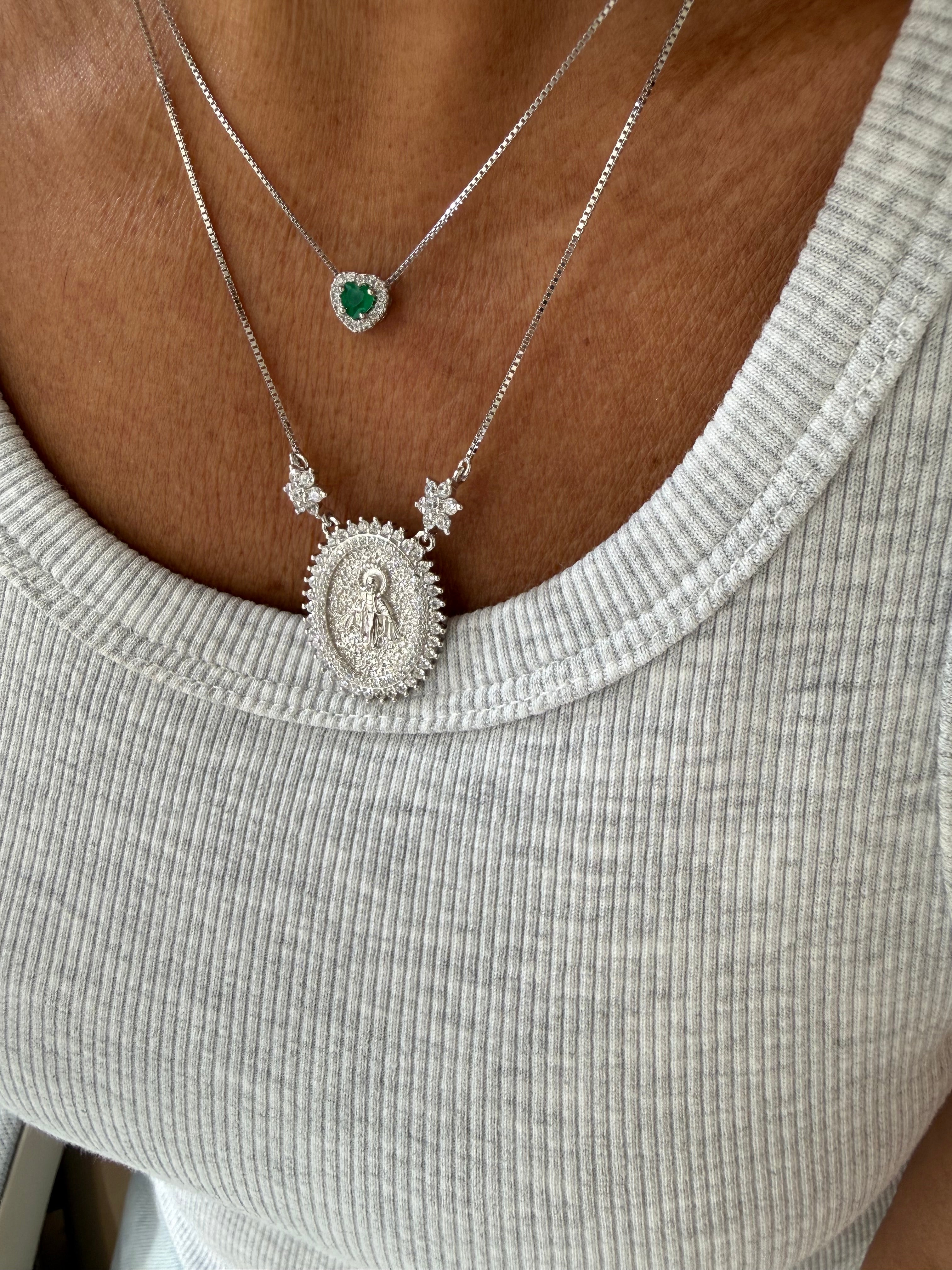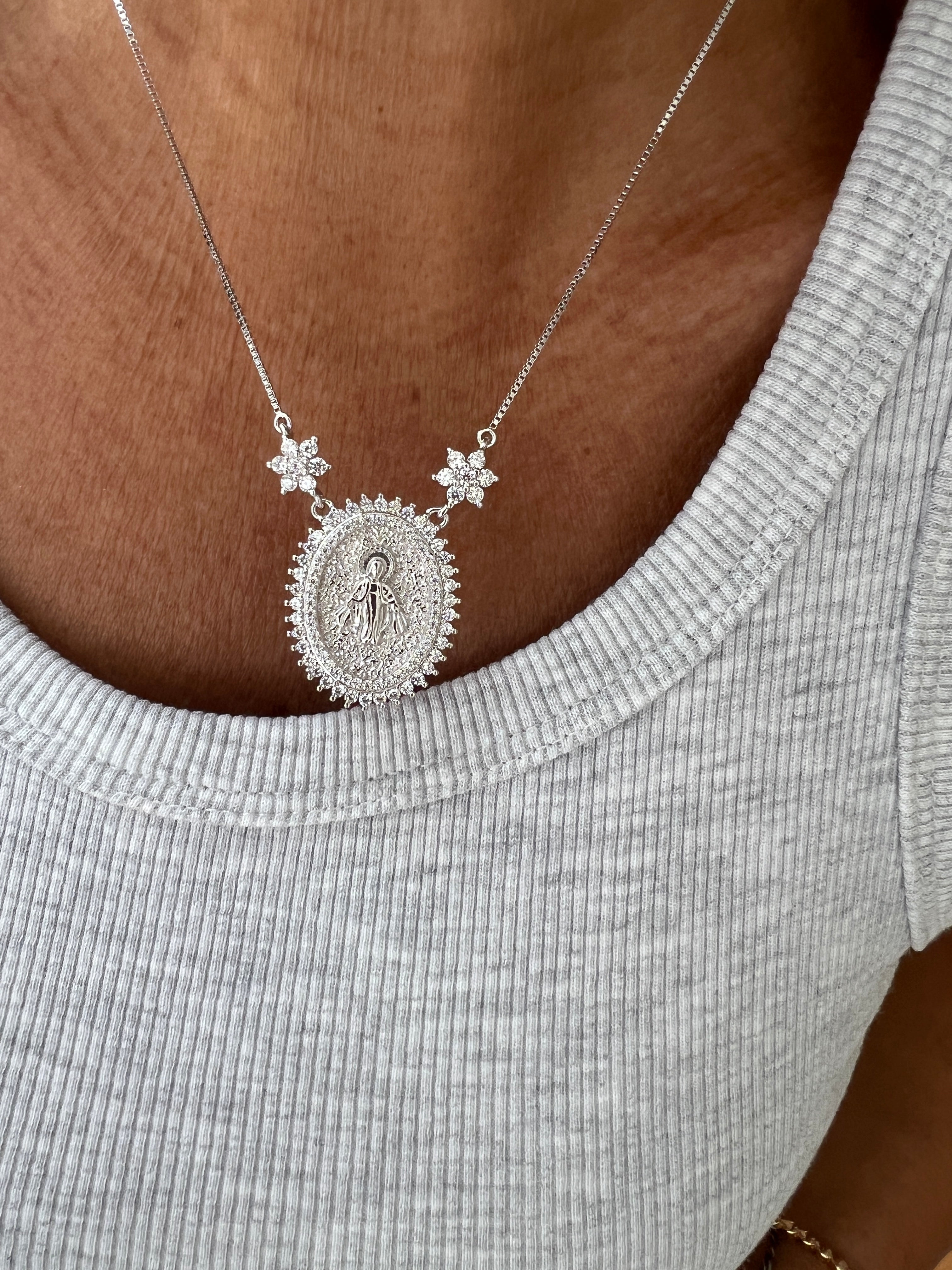 O Colar Medalha de Proteção Nossa Senhora das Graças é confeccionado em prata 925 com banho de ródio, garantindo maior durabilidade e resistência à oxidação. Seu design inclui uma medalha milagrosa e duas flores adornadas com zircônias, tornando-o uma peça elegante. Com 50 cm de comprimento, oferece opções de ajuste para 45 cm e 47 cm, adequando-se a diferentes estilos e preferências.