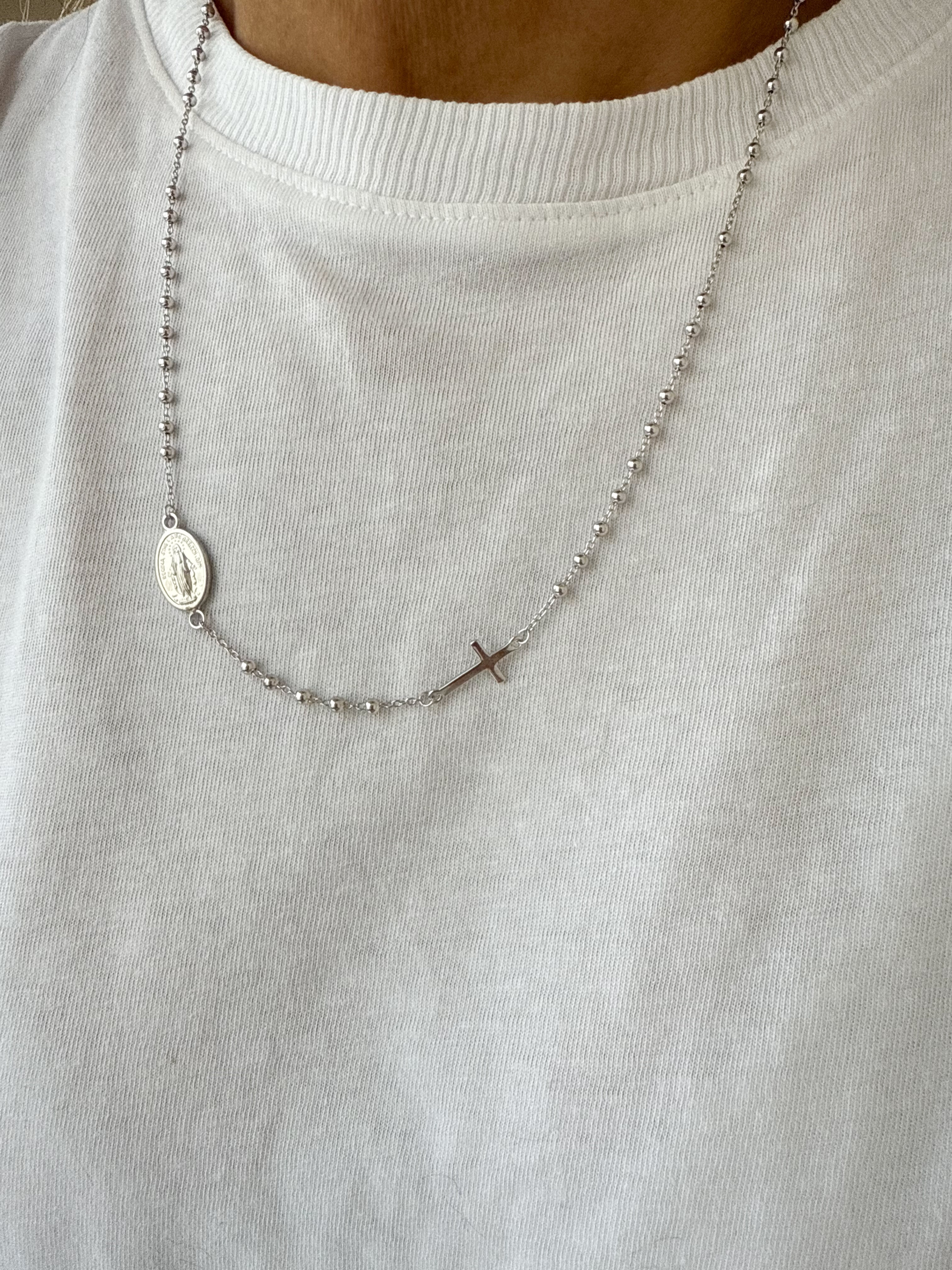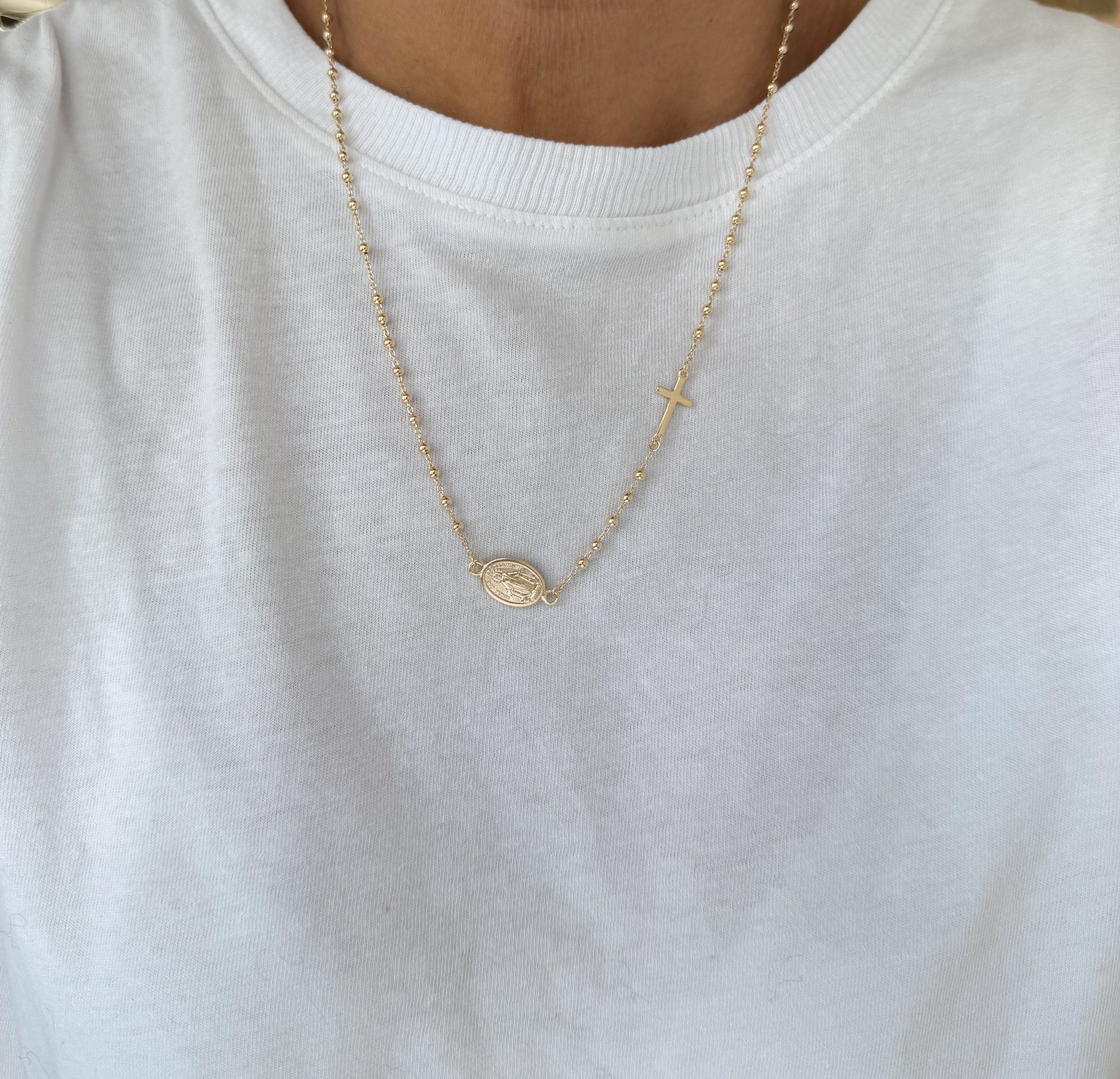 O Colar modelo terço bolinhas é a peça perfeita para expressar sua devoção com estilo. Feito com prata de qualidade e banhos de ouro 18k e ródio, possui um lindo terço com bolinhas e medalha de nossa senhora das graças. Adapta-se a diferentes comprimentos, de 45 a 50cm.