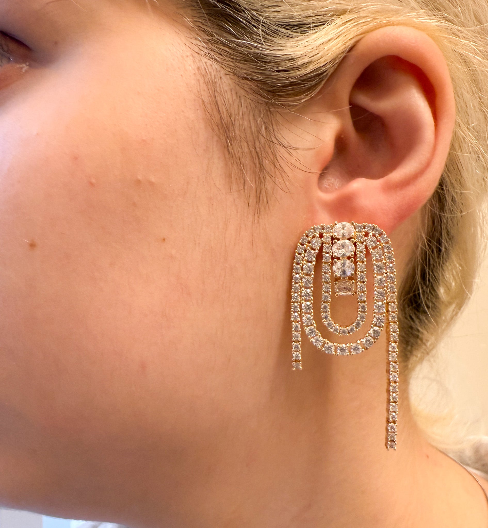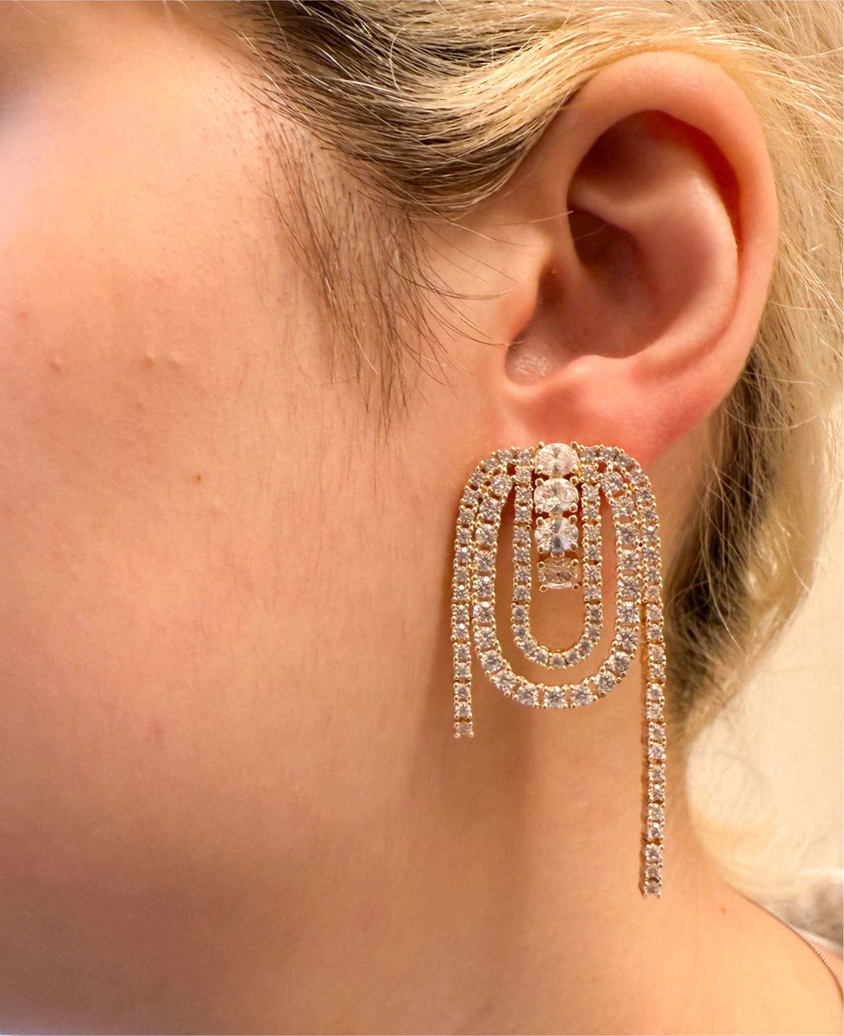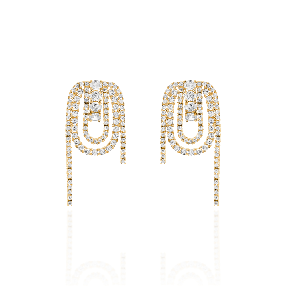 Brinco Riviera duas fileiras em prata 925 com banho de ouro 18k brilhante, decorado com zircônias, medindo 5cm. Adicione um toque de elegância a qualquer visual com este brinco de design único e sofisticado. Perfeito para ocasiões especiais ou para uso diário.