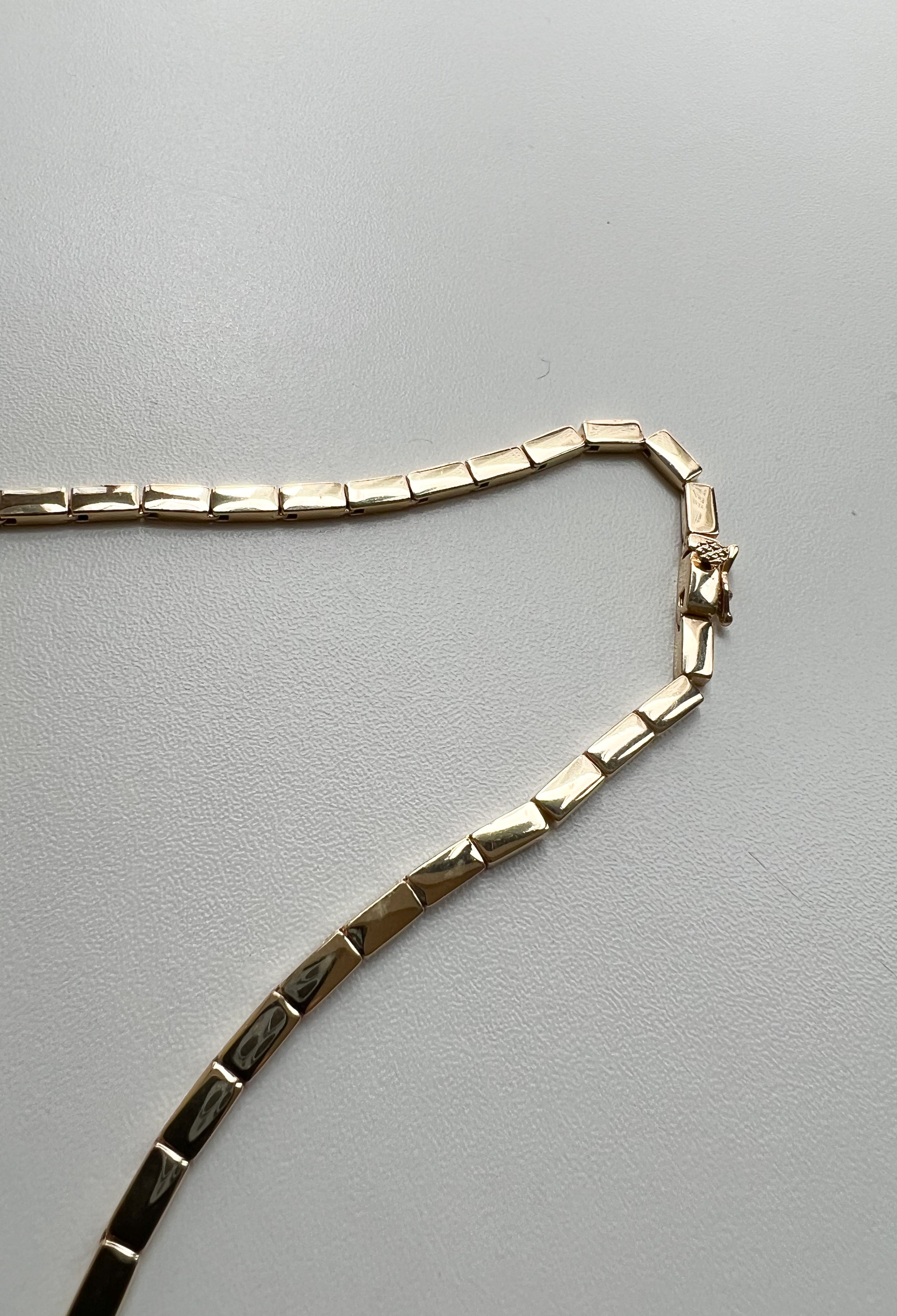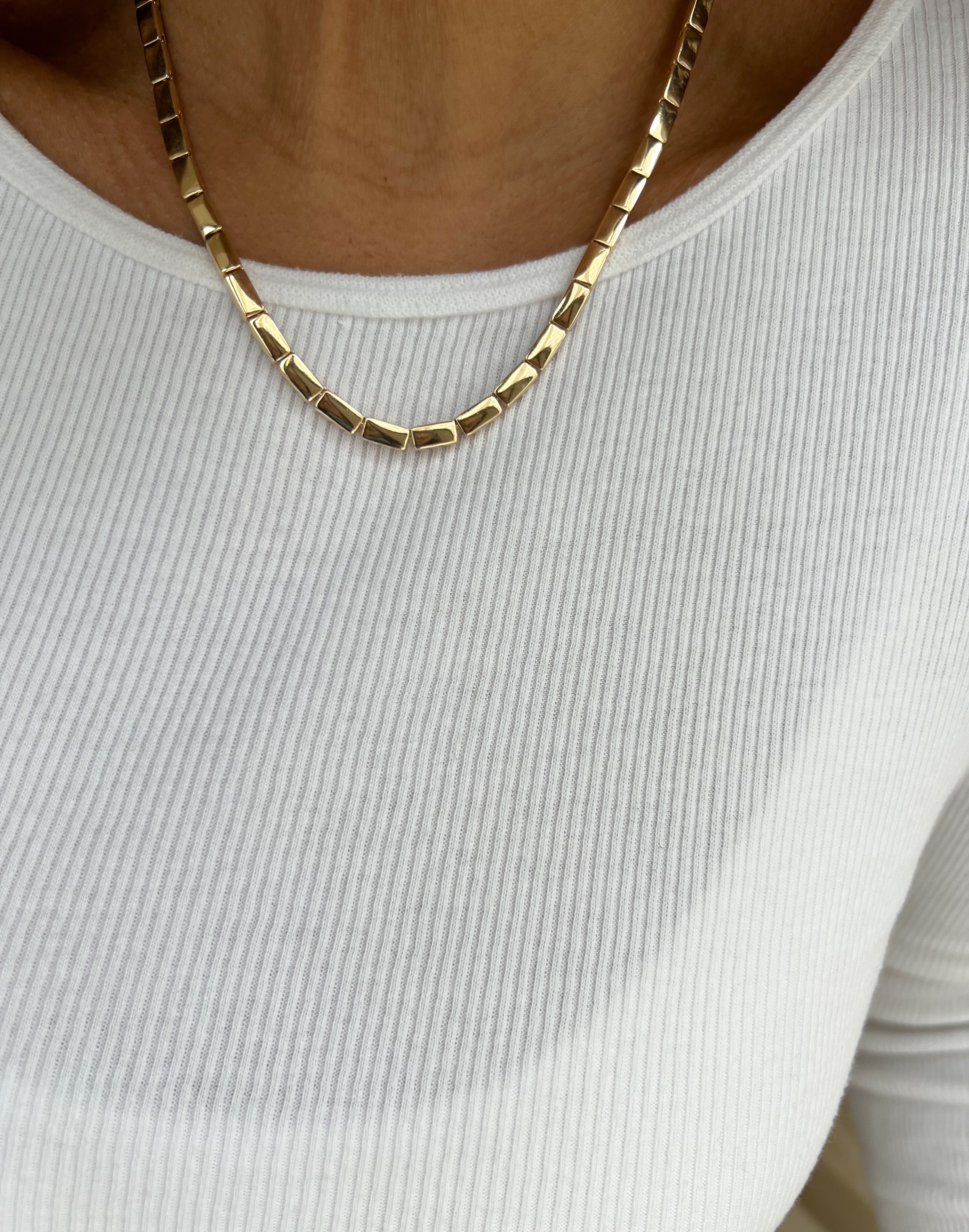Este colar de pastilhas é confeccionado em prata 925 com banho de ouro 18k, garantindo durabilidade e brilho sofisticado. Com 44 cm de comprimento, oferece um caimento elegante e versátil, ideal para complementar diferentes estilos com um toque de requinte.