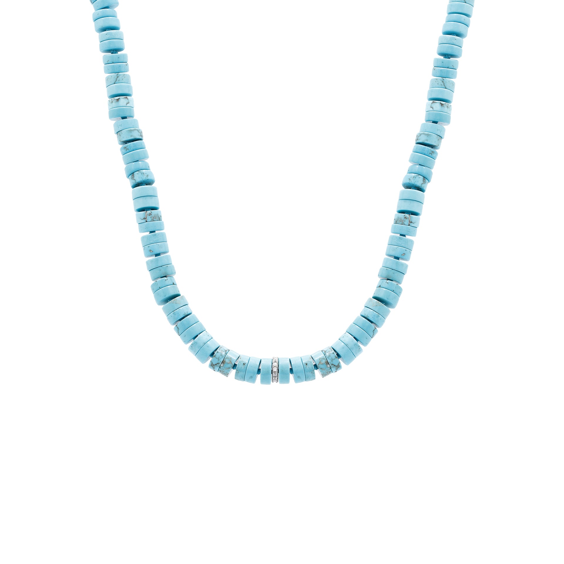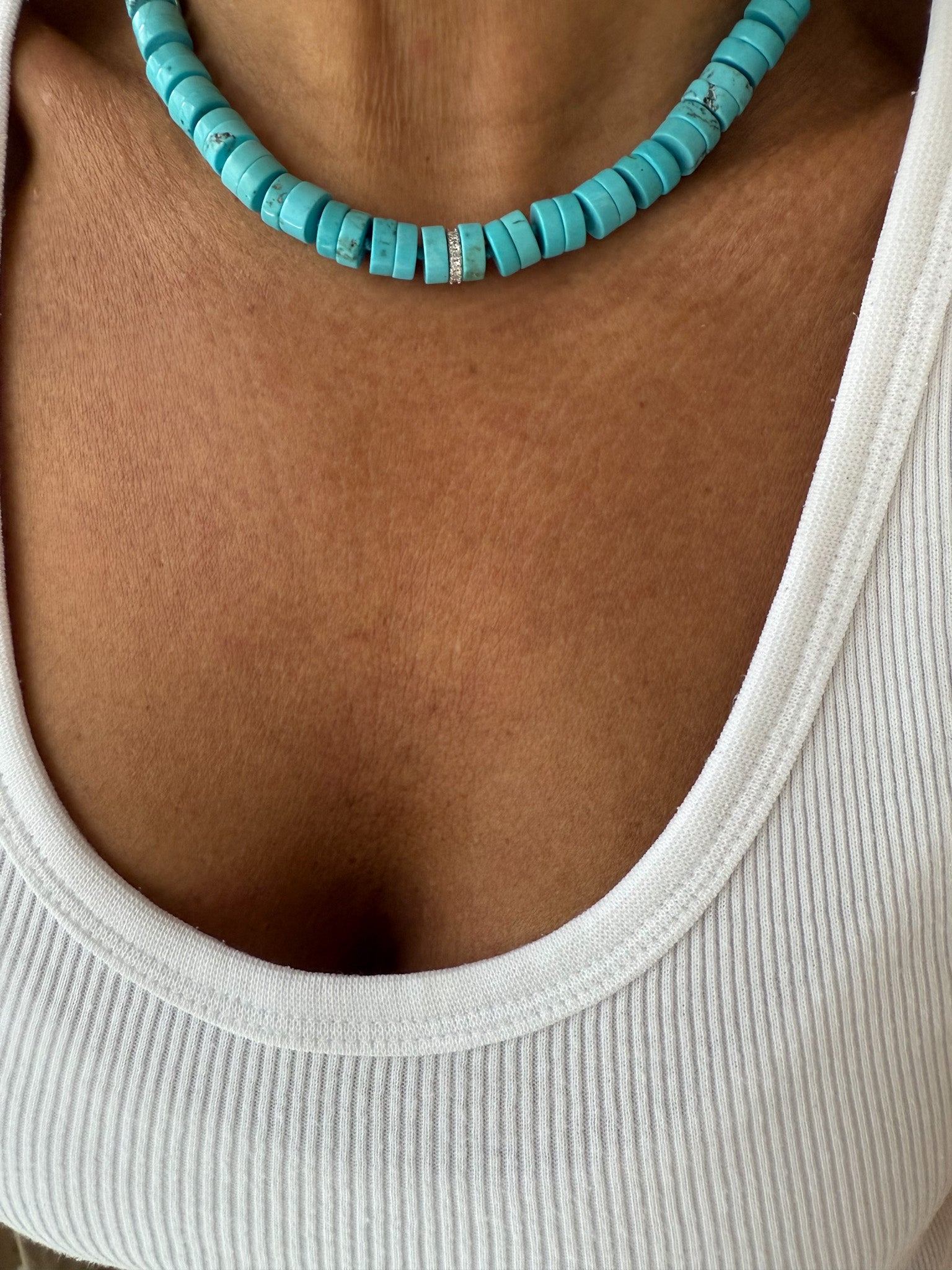 Este lindo colar apresenta pastilhas de turquesas naturais e um fecho de prata 925 com banho de ródio. O detalhe em zircônia no centro adiciona um toque de brilho. Com 39 cm de comprimento e 5 cm de extensores, é uma peça versátil e sofisticada para qualquer ocasião.