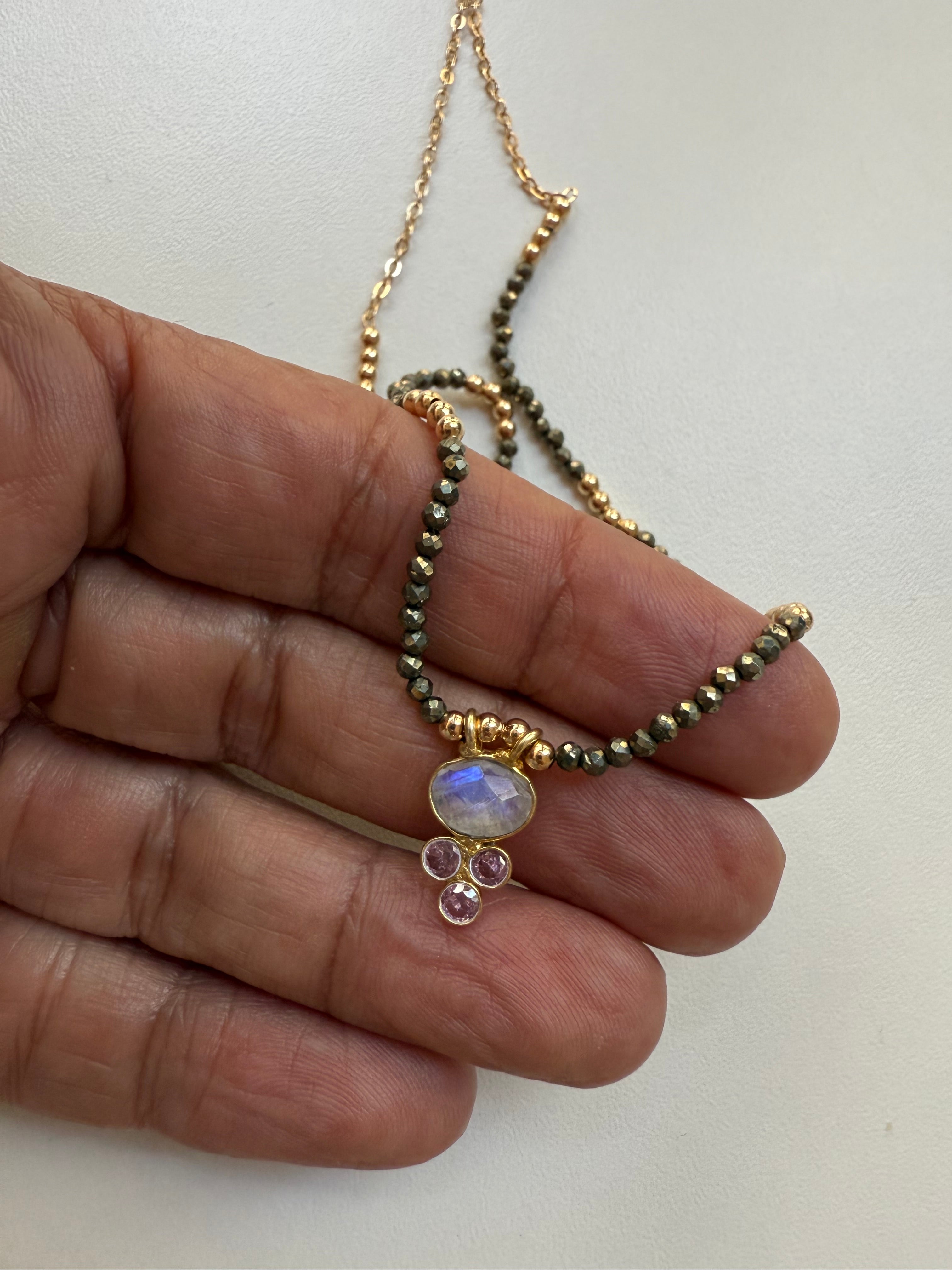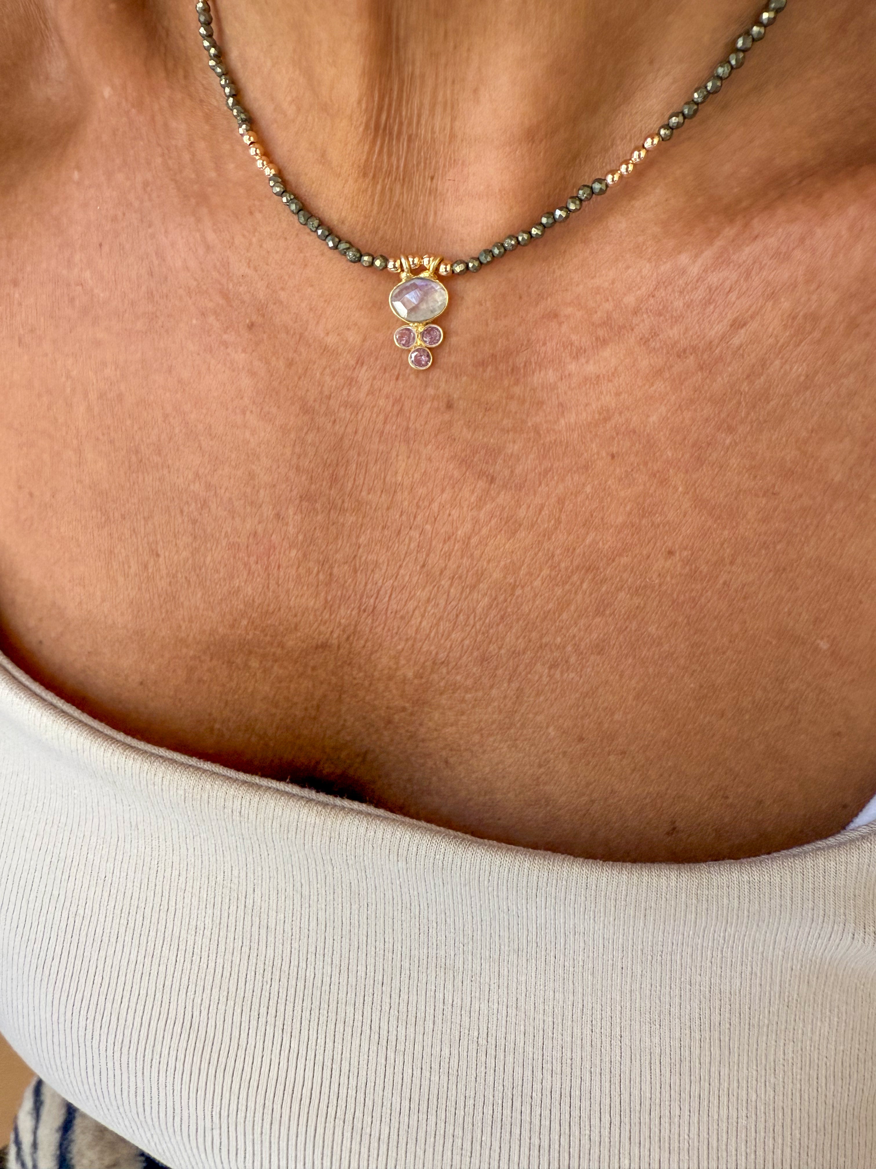 Este Colar de Pedras Naturais Hematitas e Pedra da Lua é perfeito para adicionar um toque de elegância ao seu visual. Com suas bolinhas banhadas a ouro 18K e 40 cm de comprimento, ele pode ser facilmente ajustado em até 5 cm com o extensor. Adquira já o seu e sinta-se sofisticada em qualquer ocasião.