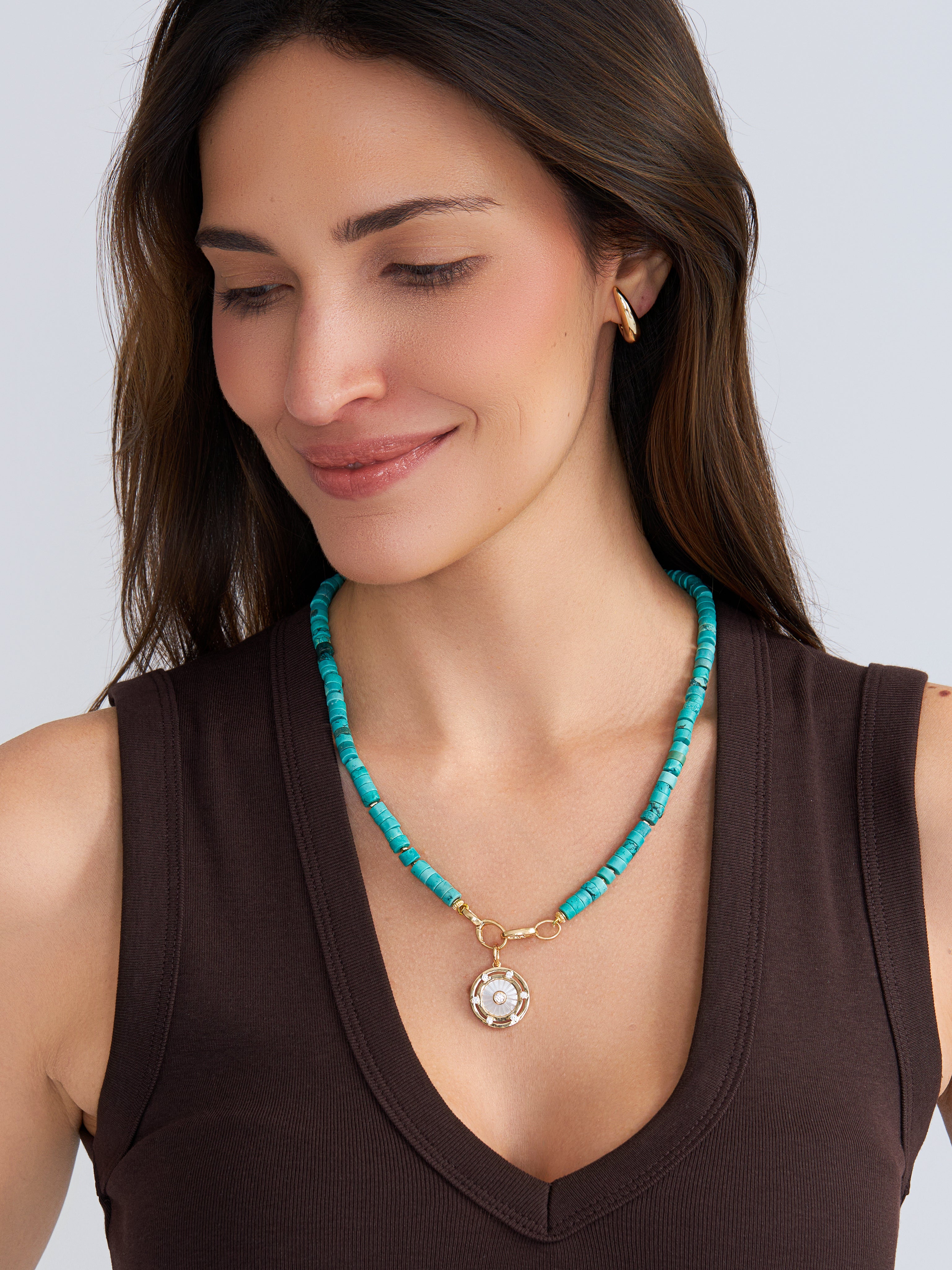 Este lindo colar de pedras naturais de turquesa verde é elegante e sofisticado. Com um fecho de prata 925 com banho de ouro, é a escolha perfeita para adicionar um toque de classe ao seu visual. Seu comprimento de 50cm permite uma variedade de estilos e looks. Adquira já o seu!