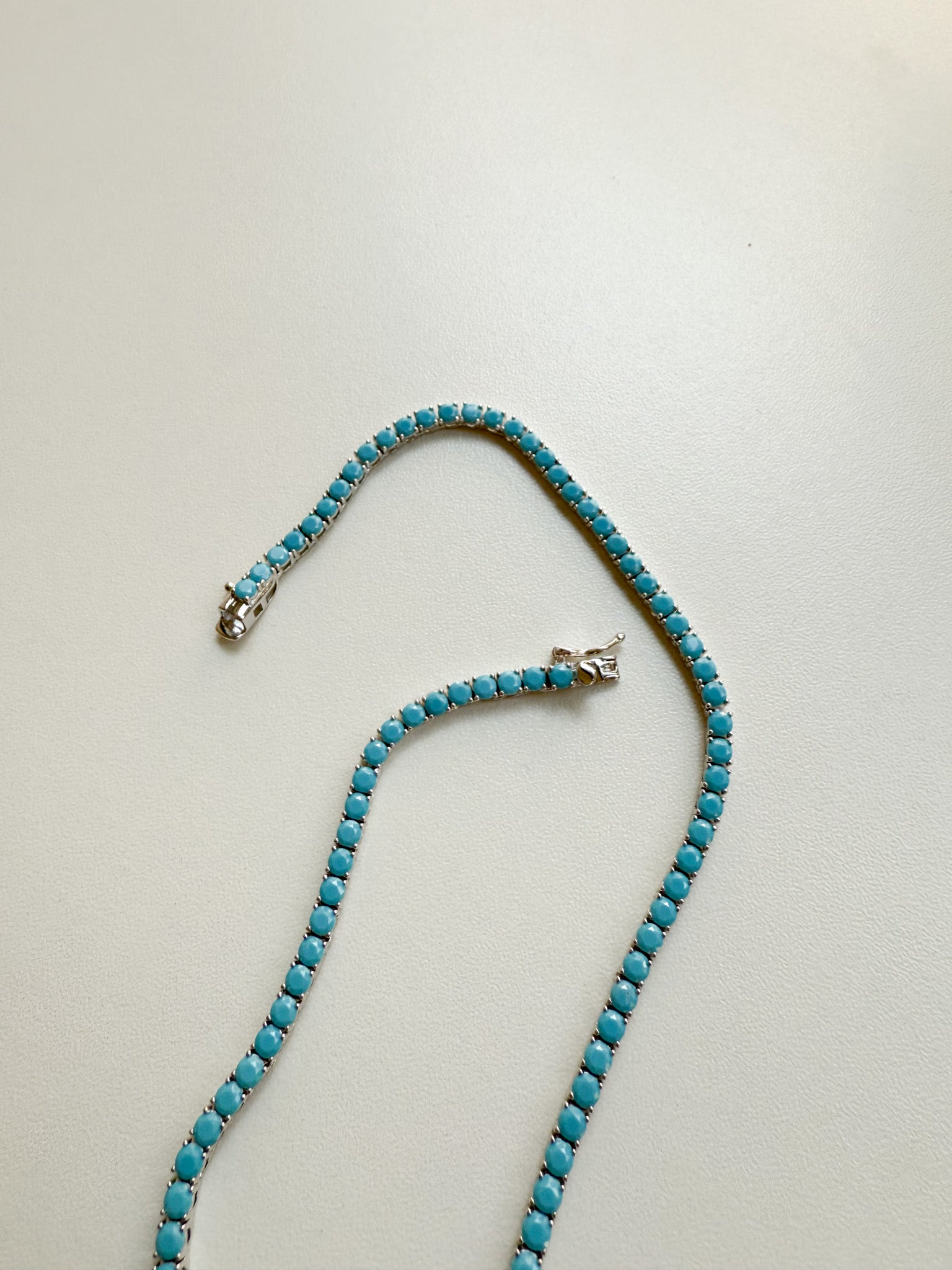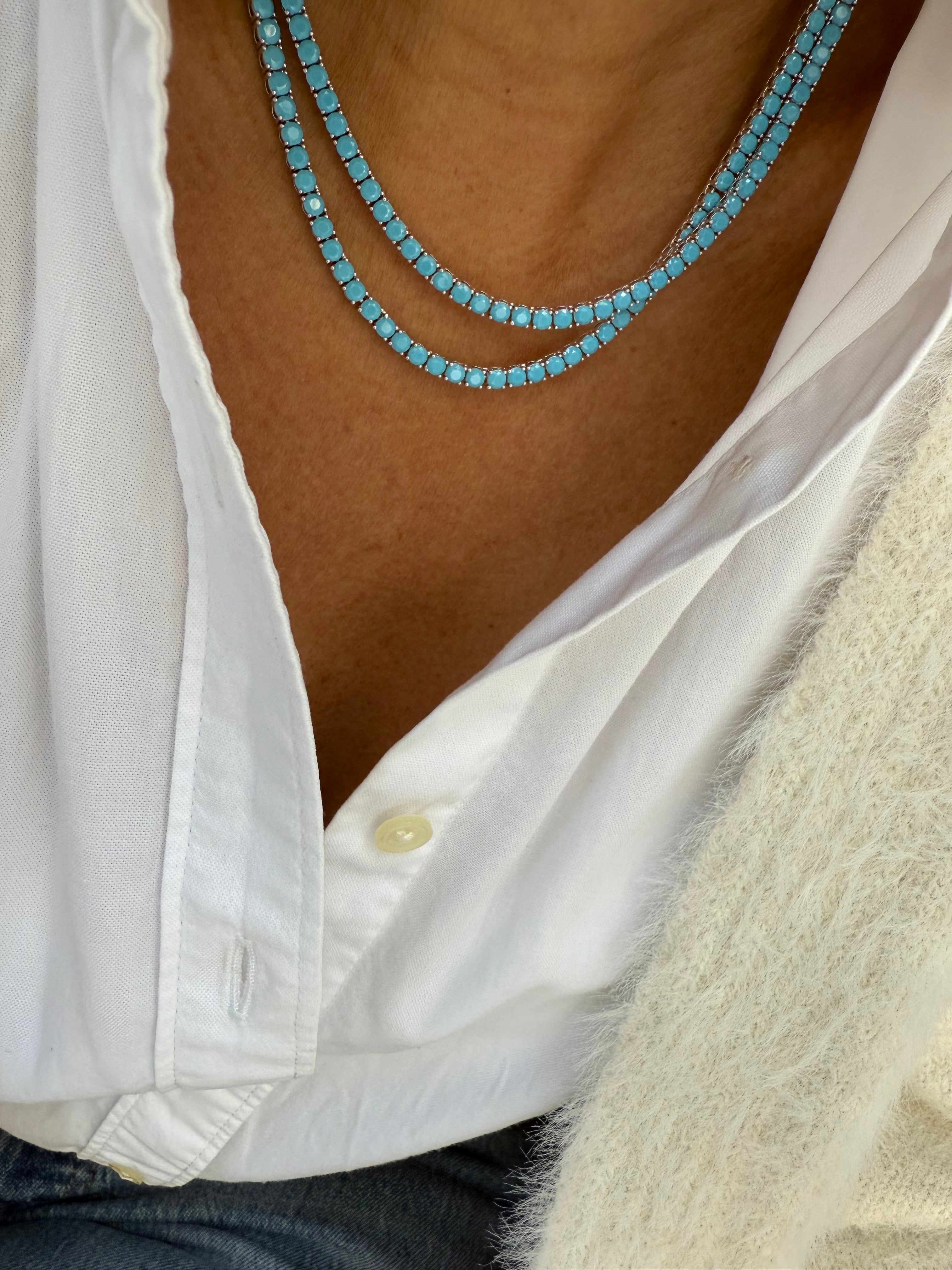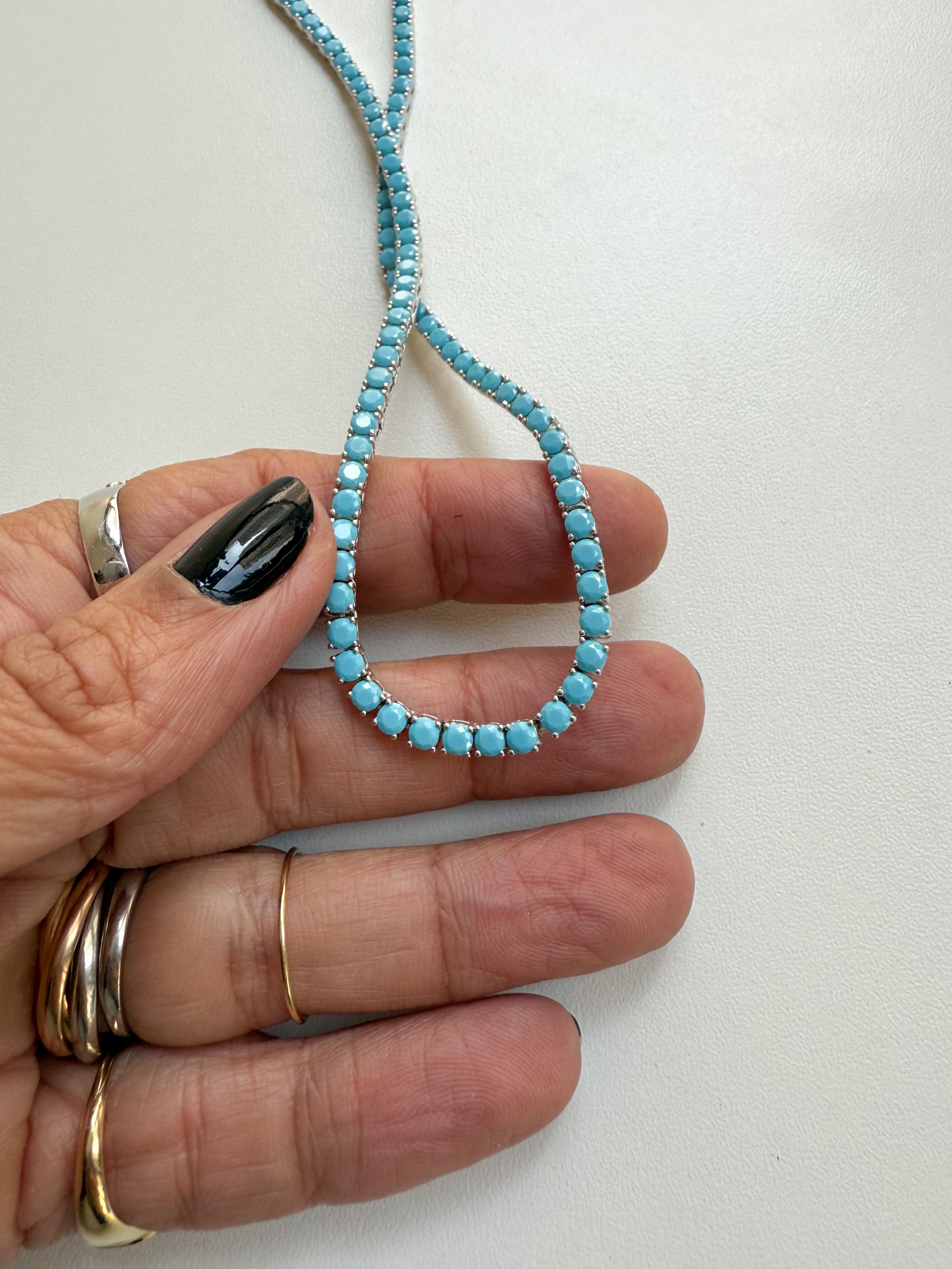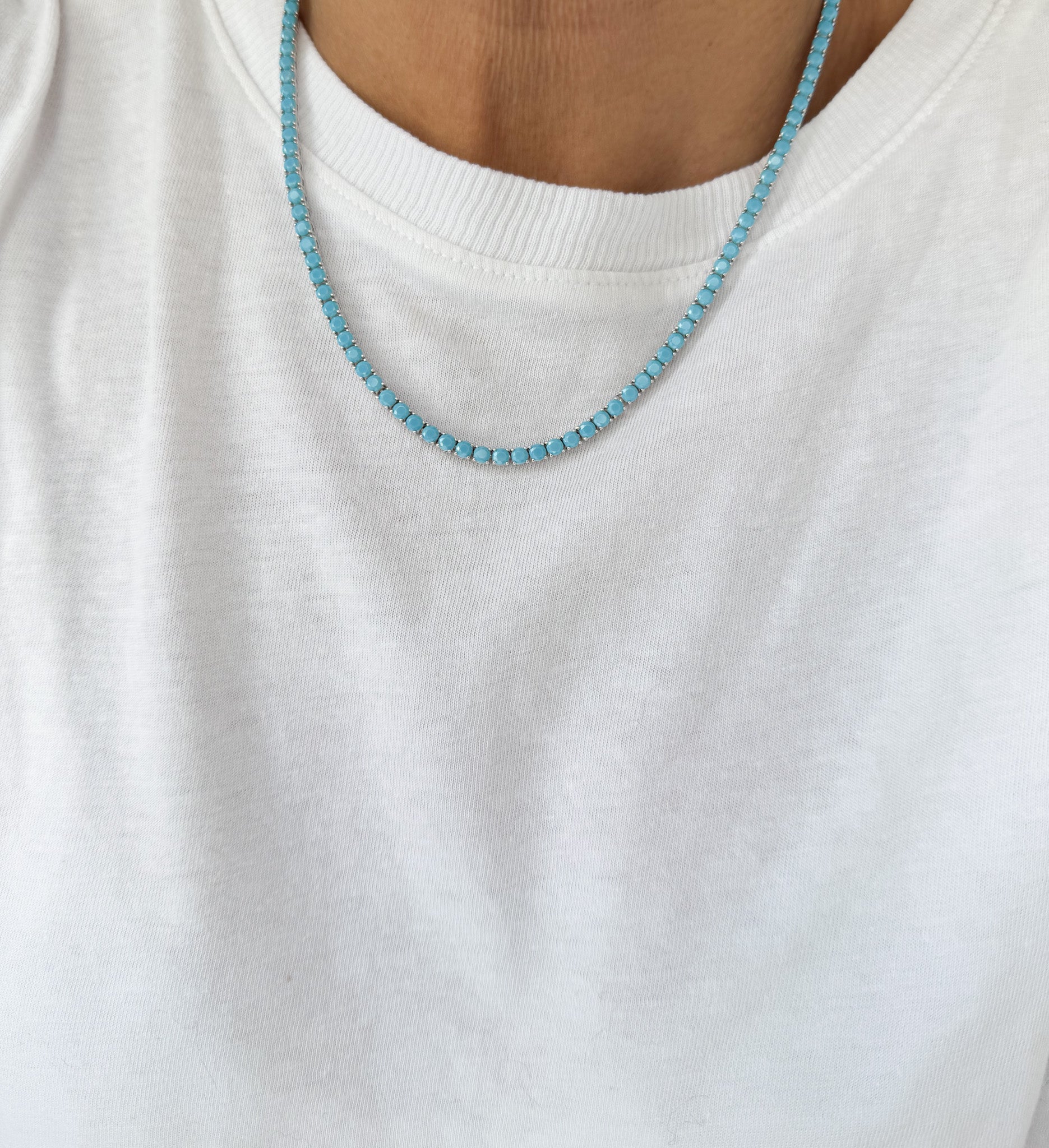 Este Colar Riviera é perfeito para adicionar um toque de cor e elegância ao seu visual. Feito de prata 925 com banho de ródio de alta qualidade, possui lindas pedras de quartzo na cor turquesa de 3mm, que refletem a luz e dão um brilho encantador. Com 42 cm de comprimento, é ideal para ser usado em diversas ocasiões.