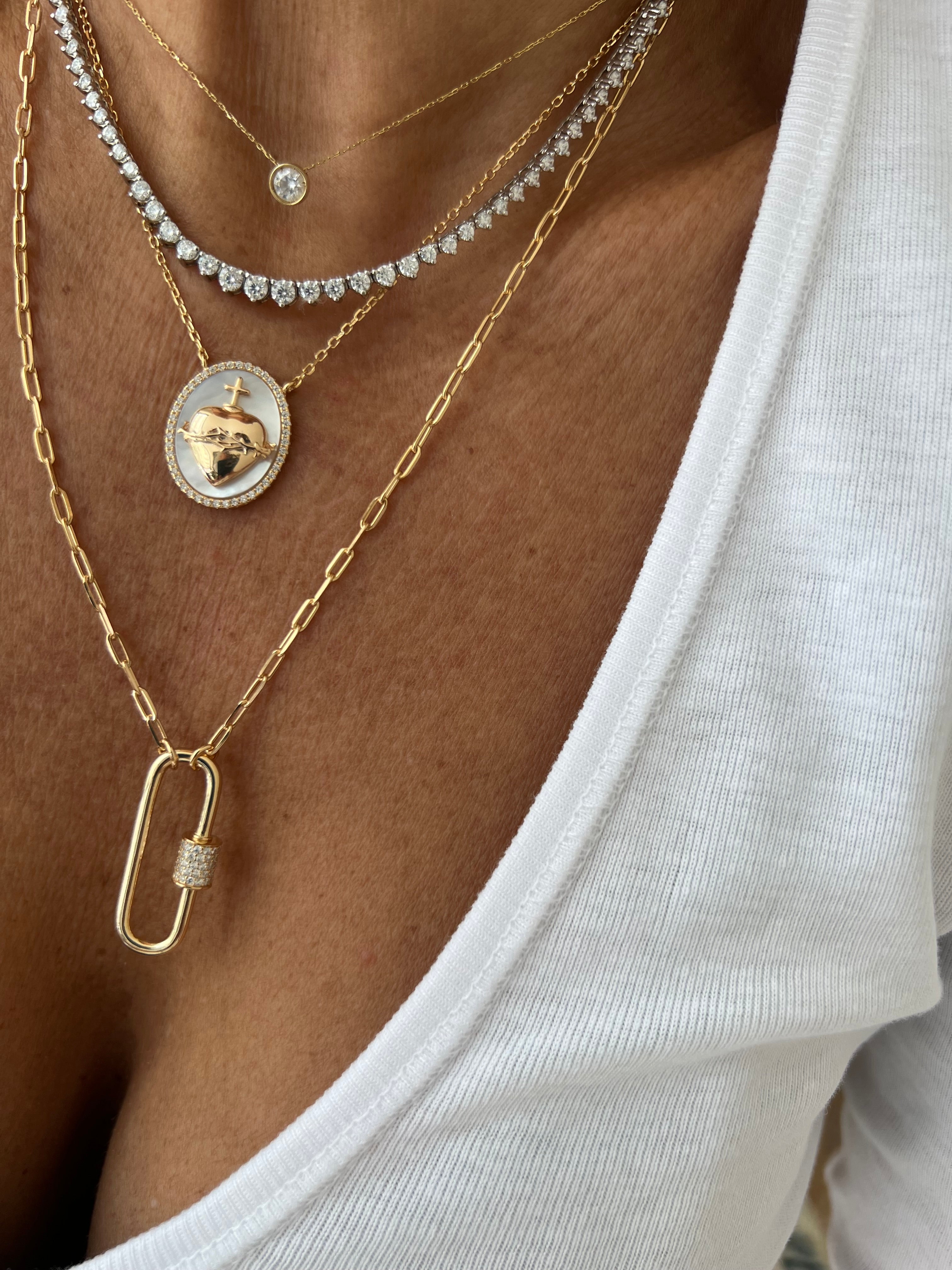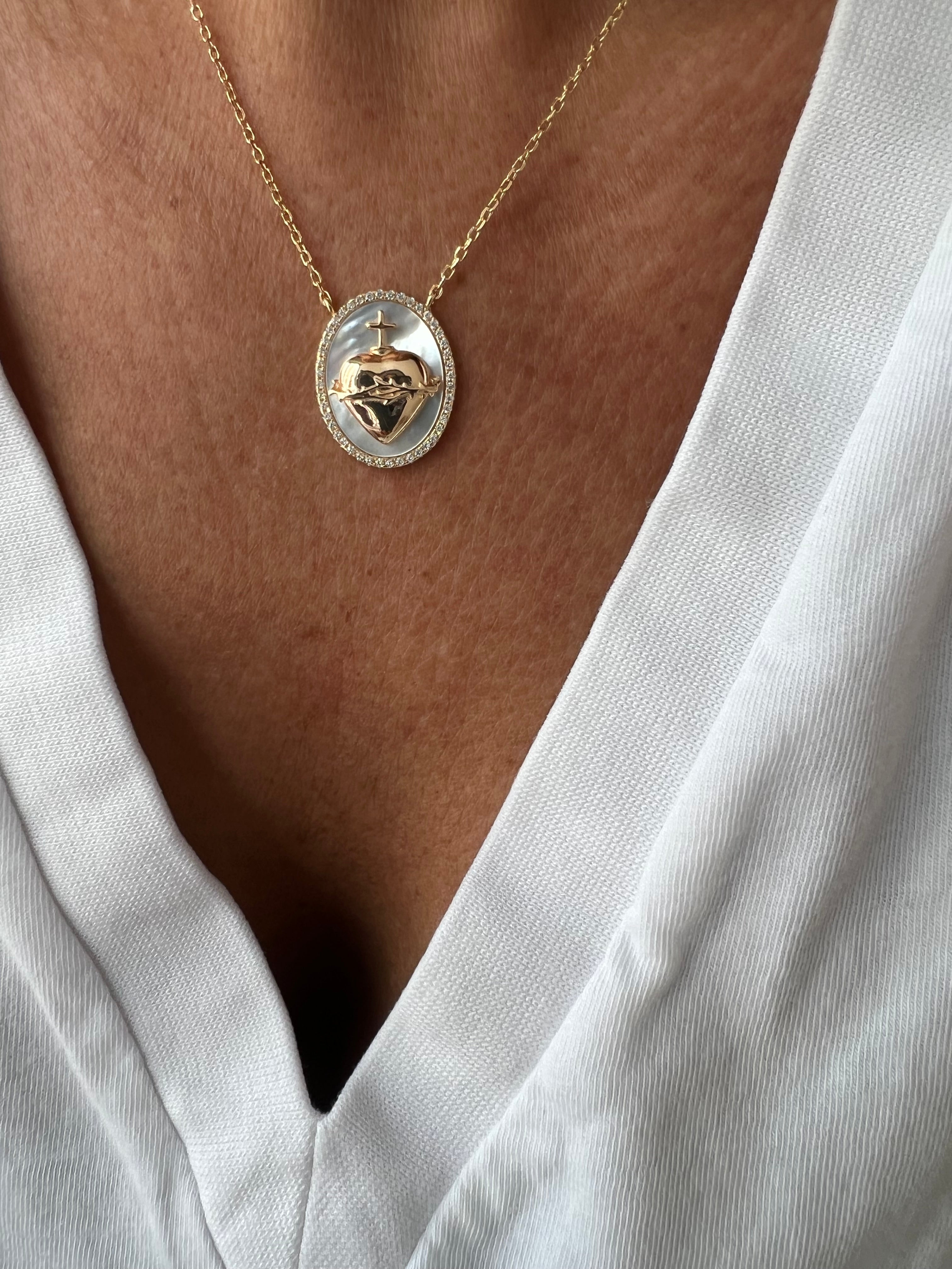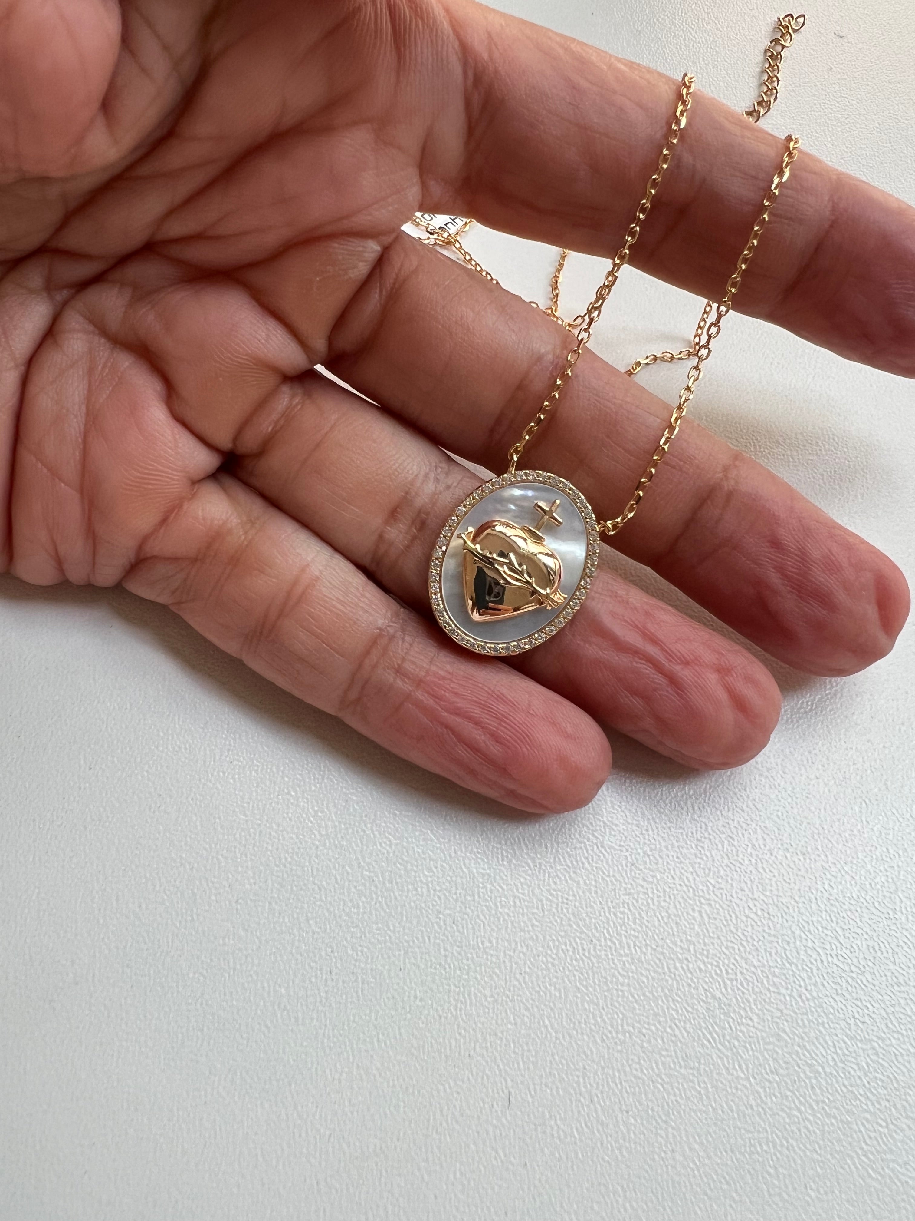 Este Colar Sagrado Coração de Maria é uma peça de prata 925 com banho de ouro, que apresenta um pingente de sagrado coração e madrepérola. A corrente possui 40cm de comprimento, podendo ser ampliada em até 5 cm com os extensores, oferecendo uma peça versátil e elegante para qualquer ocasião.
