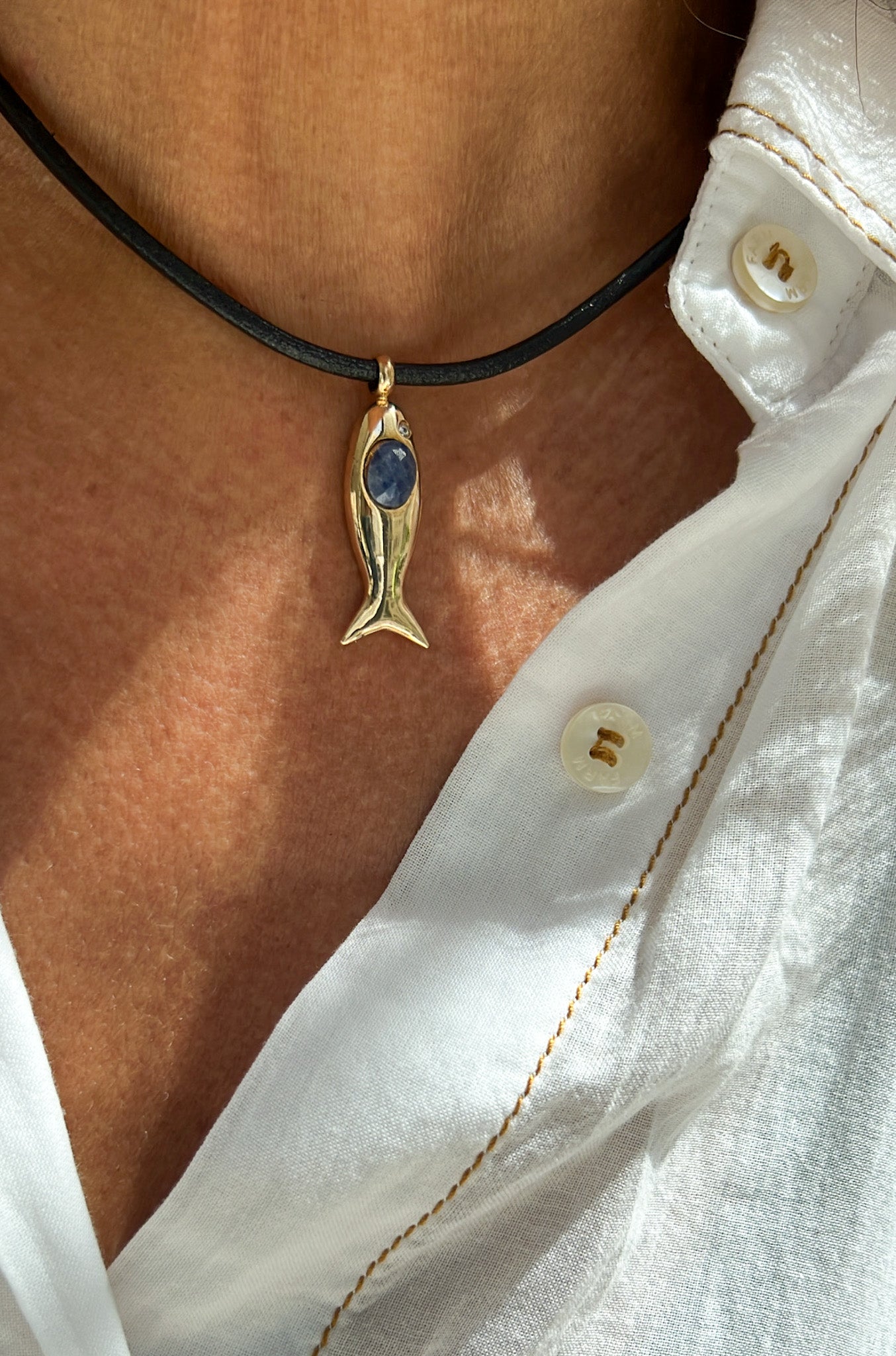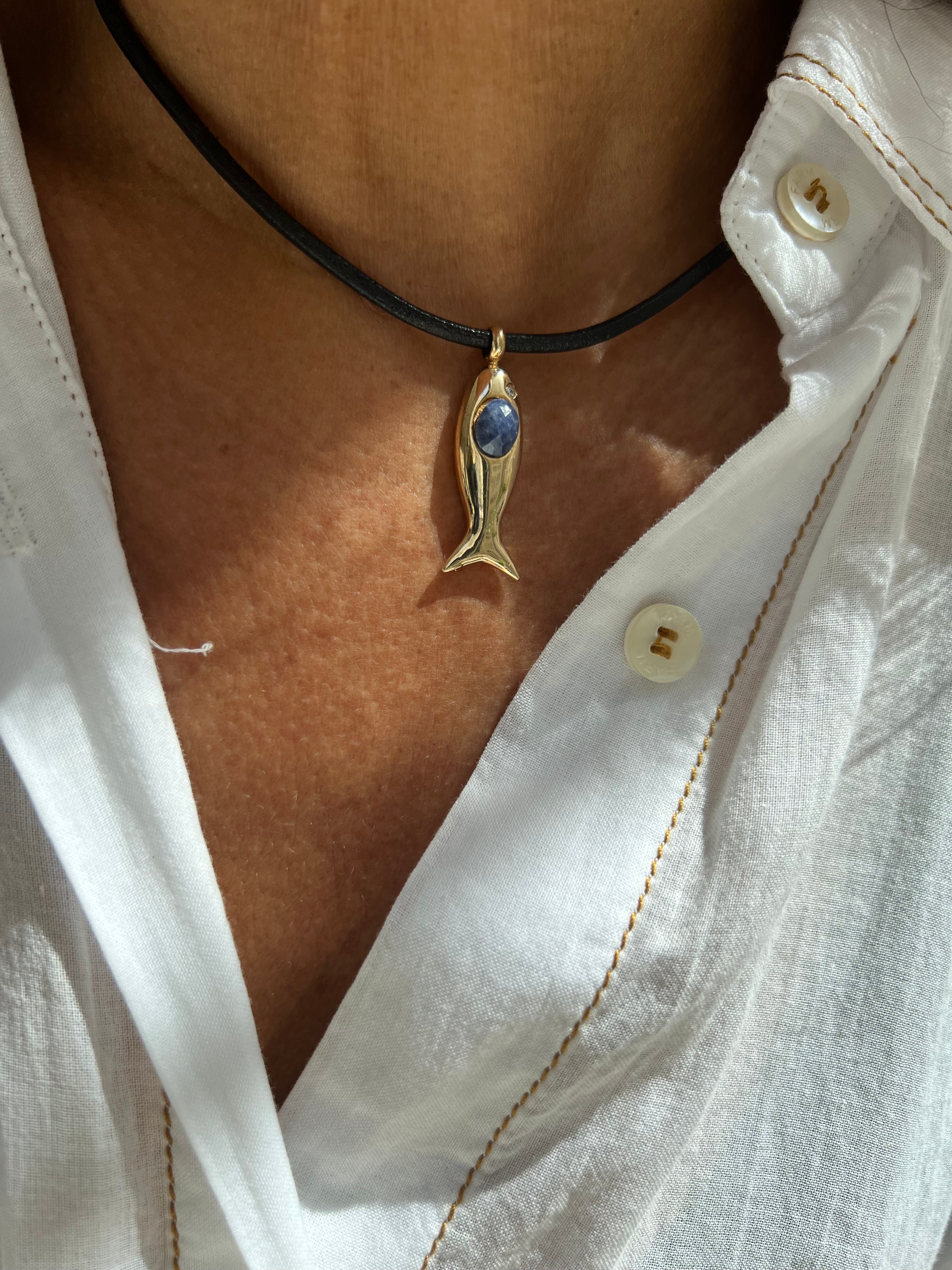 Este elegante Colar Sardine de couro preto tem 40 cm mais extensores e vem com uma sardinha banhada a ouro 18k, além de uma pedra de sodalita e zircônia. Feito com materiais de alta qualidade, este colar é a escolha perfeita para adicionar um toque único e sofisticado ao seu visual.