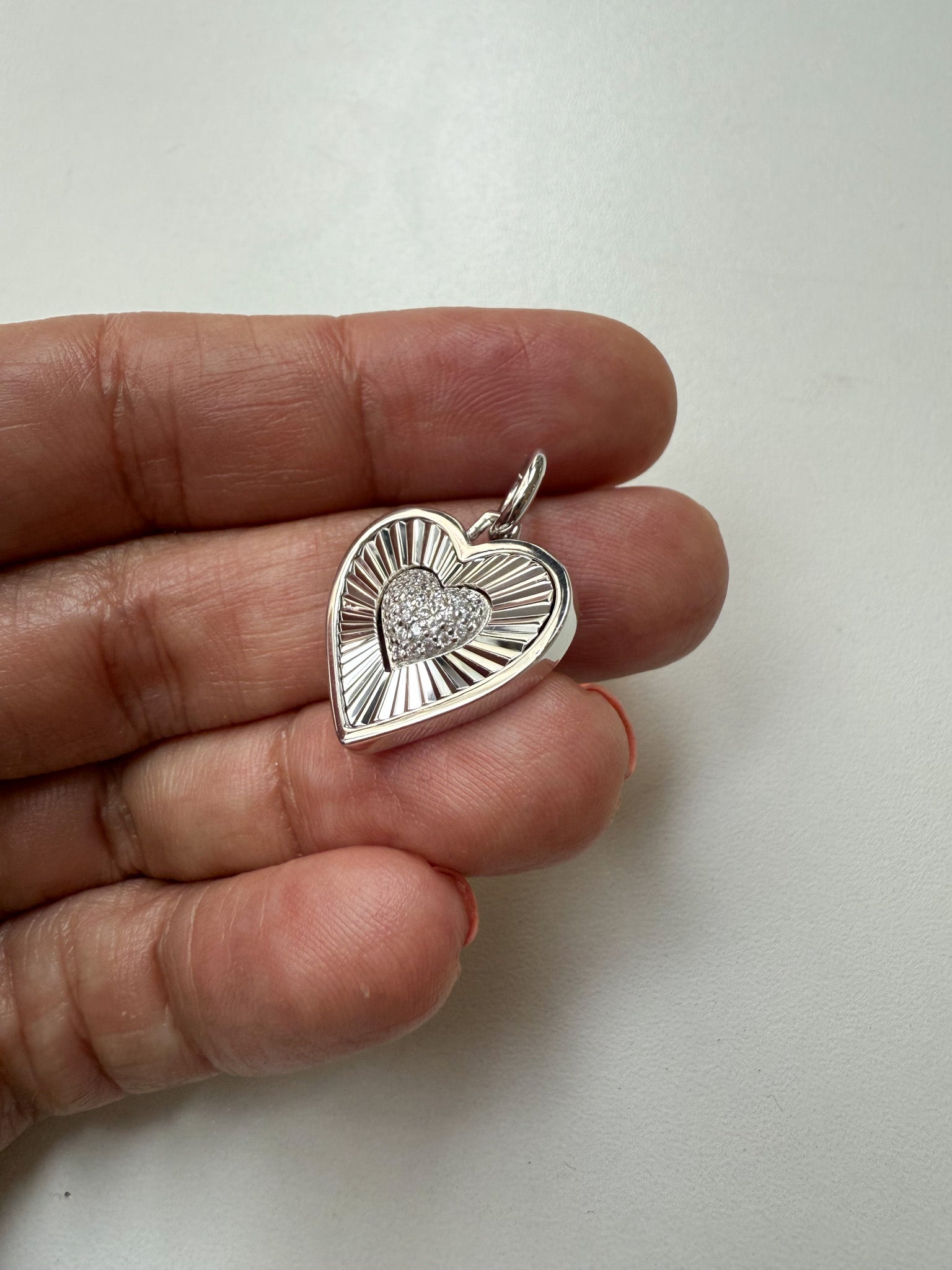Este pingente de prata 925 com banho de ródio é um luxuoso acessório com um miolo de coração cravejado de zircônias. Adicione um toque de brilho e elegância ao seu look com este belo pingente em plissê. Ideal para mostrar seu amor e sofisticação.