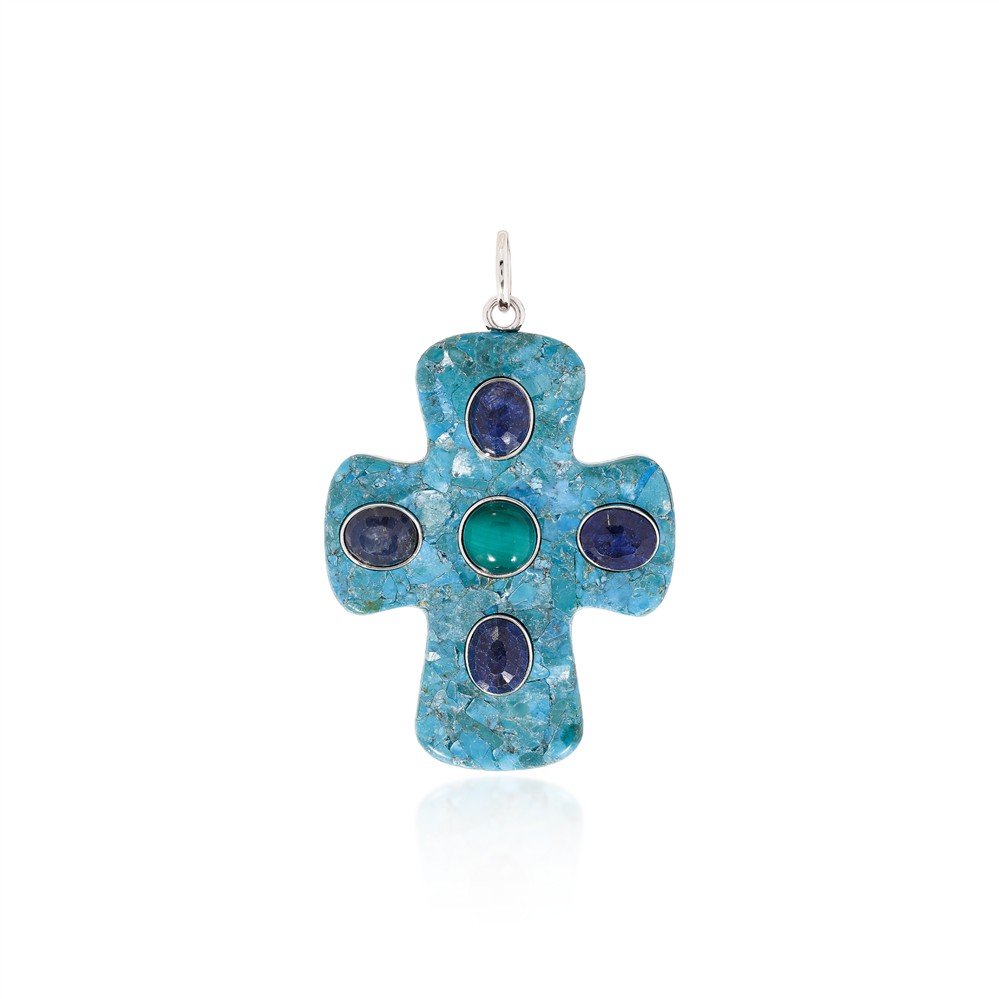 "Adicione um toque de estilo e proteção com o Pingente cruz turquesa. Confeccionado com pedra natural turquesa e prata 925 banhada em ródio, possui também argola e detalhes de amazonita e olho de tigre. Com 7cm de comprimento, é perfeito para complementar seu visual com elegância e boas energias."