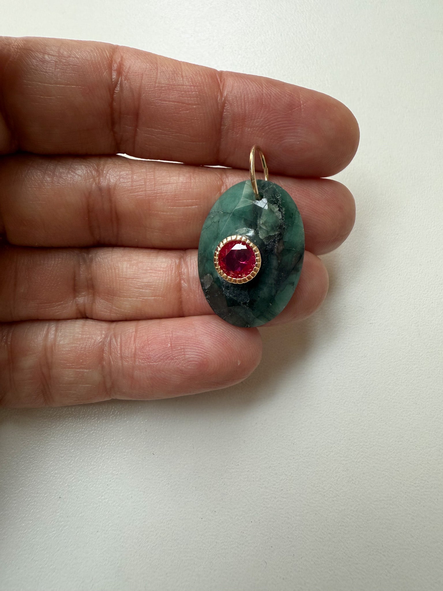 Este elegante pingente apresenta uma pedra natural de esmeralda, com uma inclusão que adiciona um toque único e exclusivo. Um cristal vermelho cravado no centro da pedra de esmeralda traz um brilho adicional a esta peça incrível. Perfeito para adicionar um toque de sofisticação e estilo a qualquer visual.