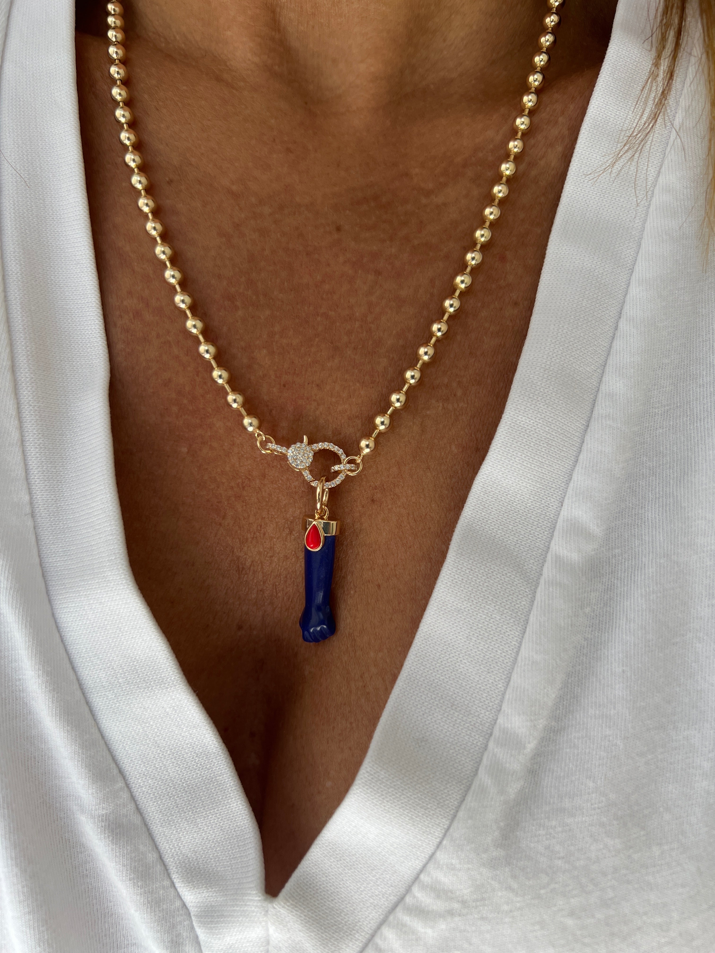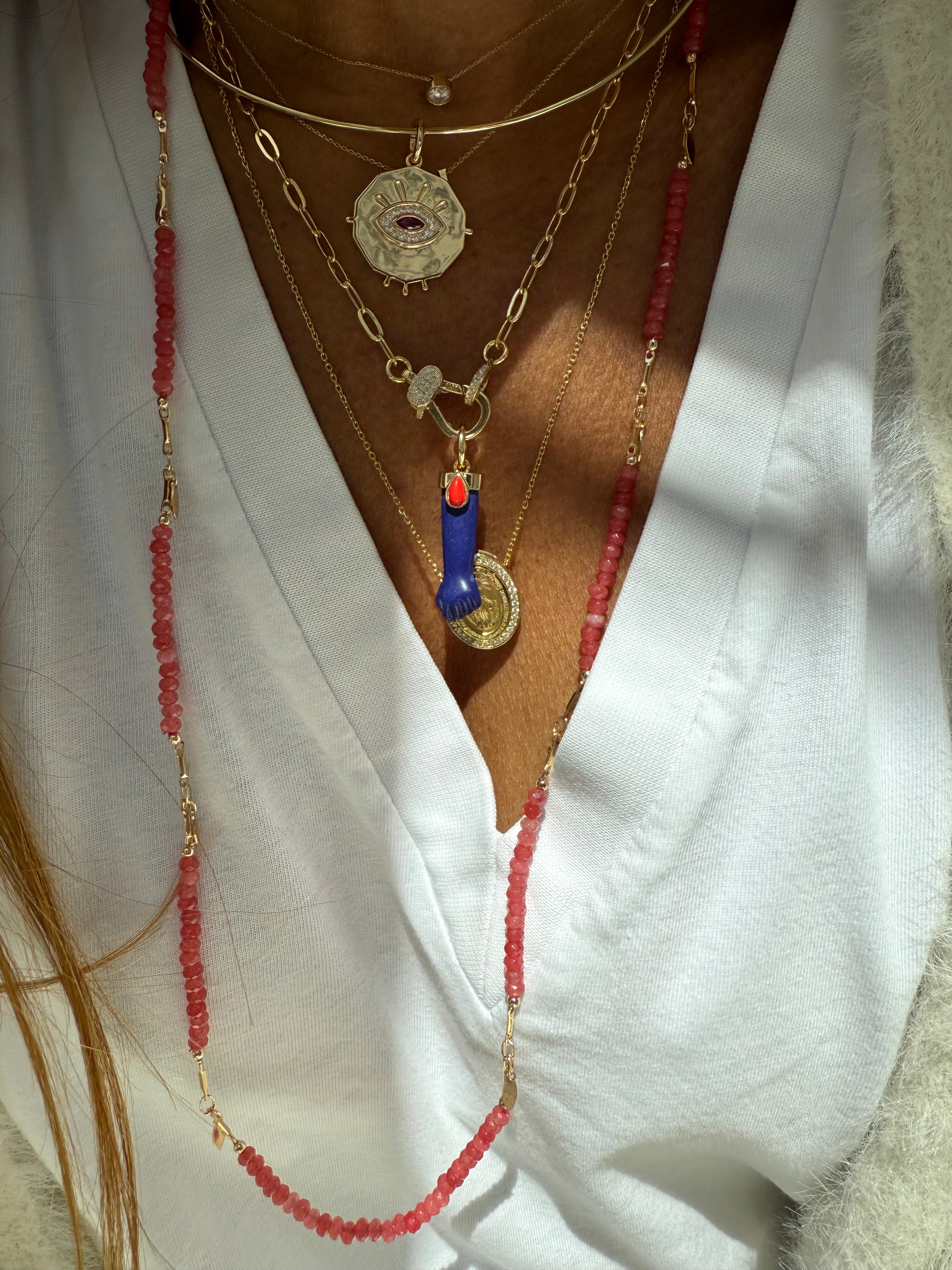 Este elegante pingente de pedra lápis lázuli com gota de coral é perfeito para quem busca sofisticação e beleza nos seus acessórios. Com acabamento em prata e banho de ouro 18k, essa peça combina com qualquer look e é uma ótima escolha para quem procura um toque de elegância em suas combinações. Adicione um toque especial ao seu visual com esse pingente exclusivo.