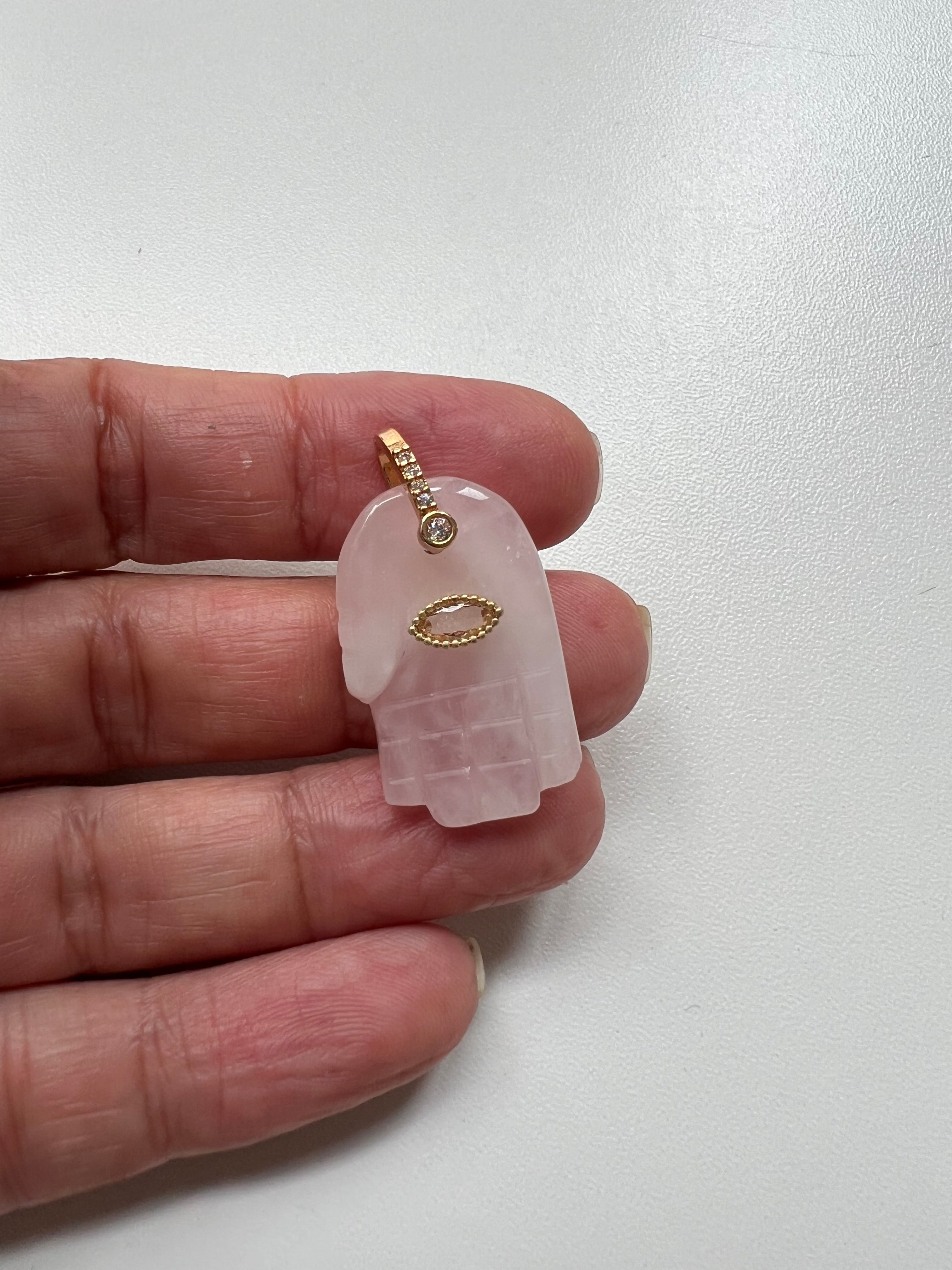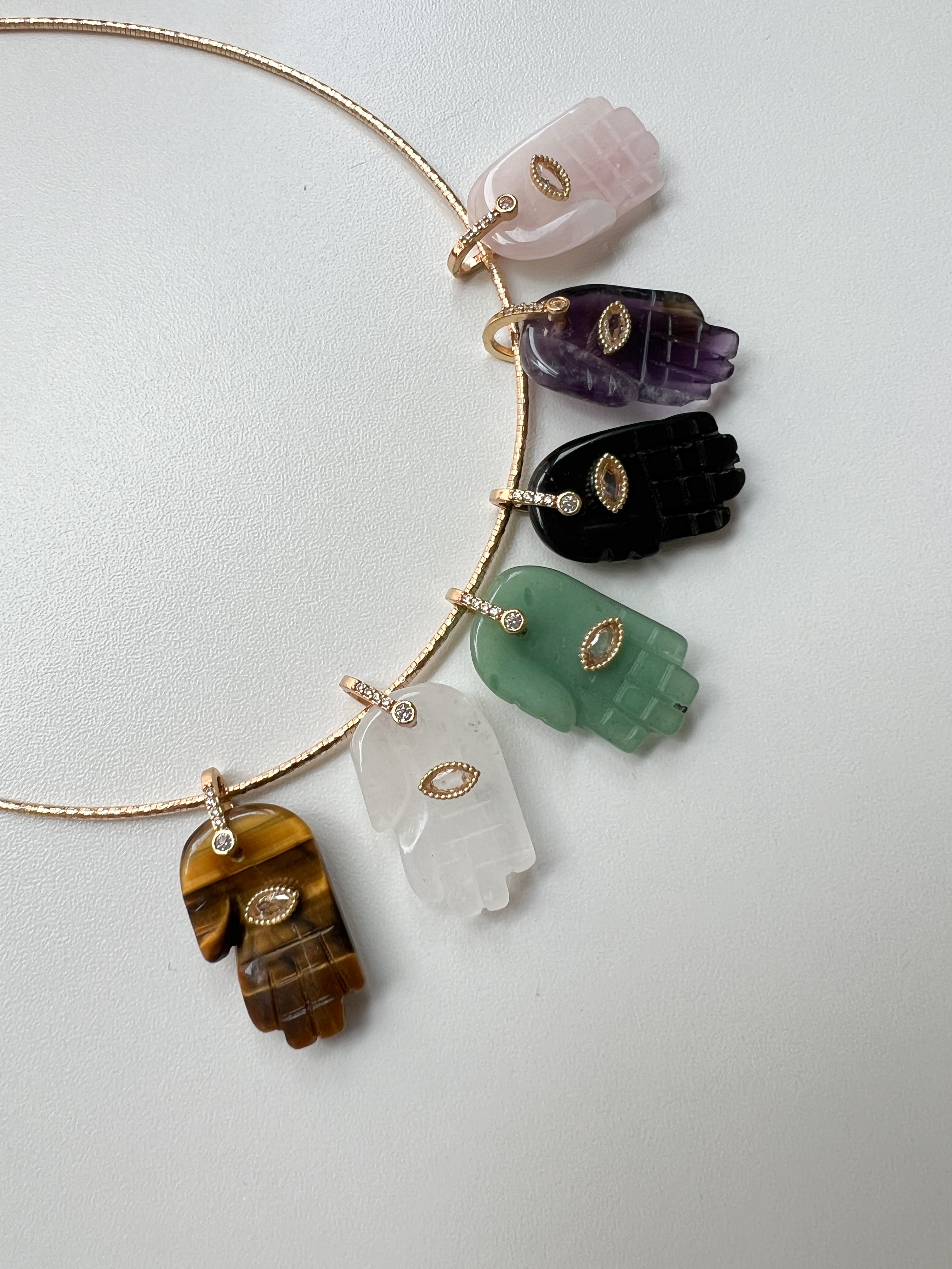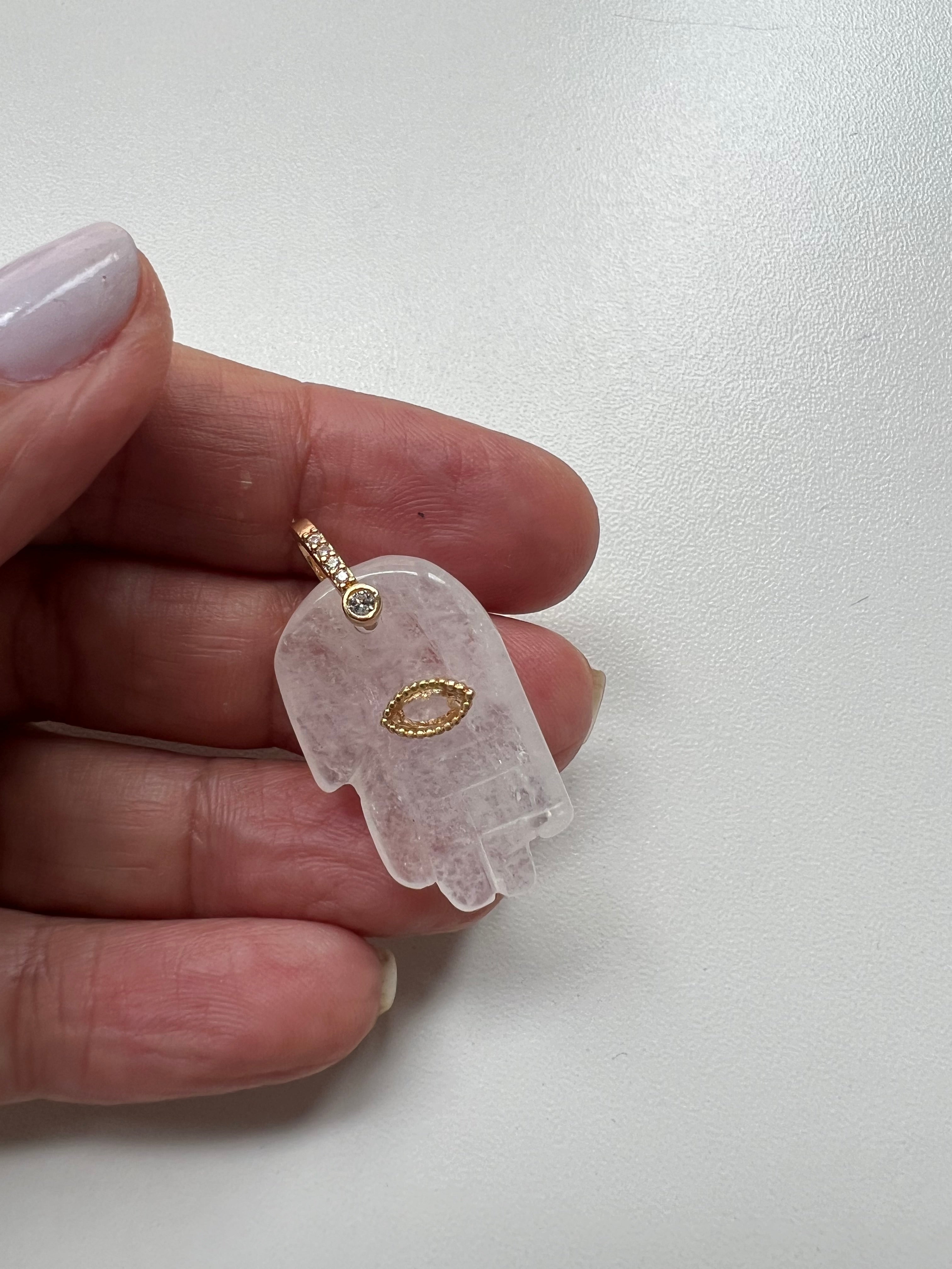 Este pingente possui banho de ouro 18k, pedras naturais e um cristal translúcido no centro, trazendo elegância e proteção para o seu dia a dia. A Hamsa, também conhecida como Mão de Fátima, é considerada um amuleto contra o mau-olhado e traz boas energias para quem usa.