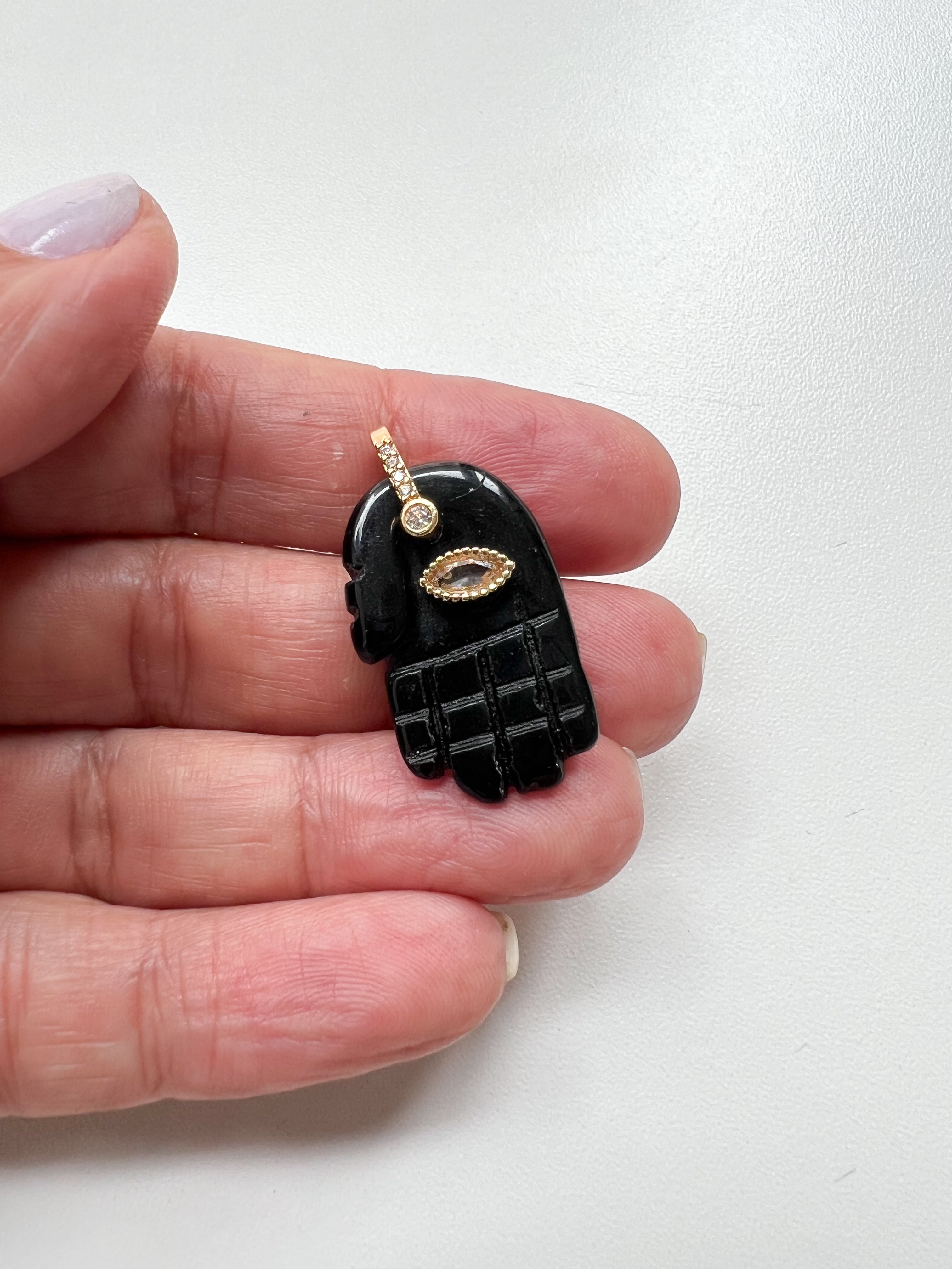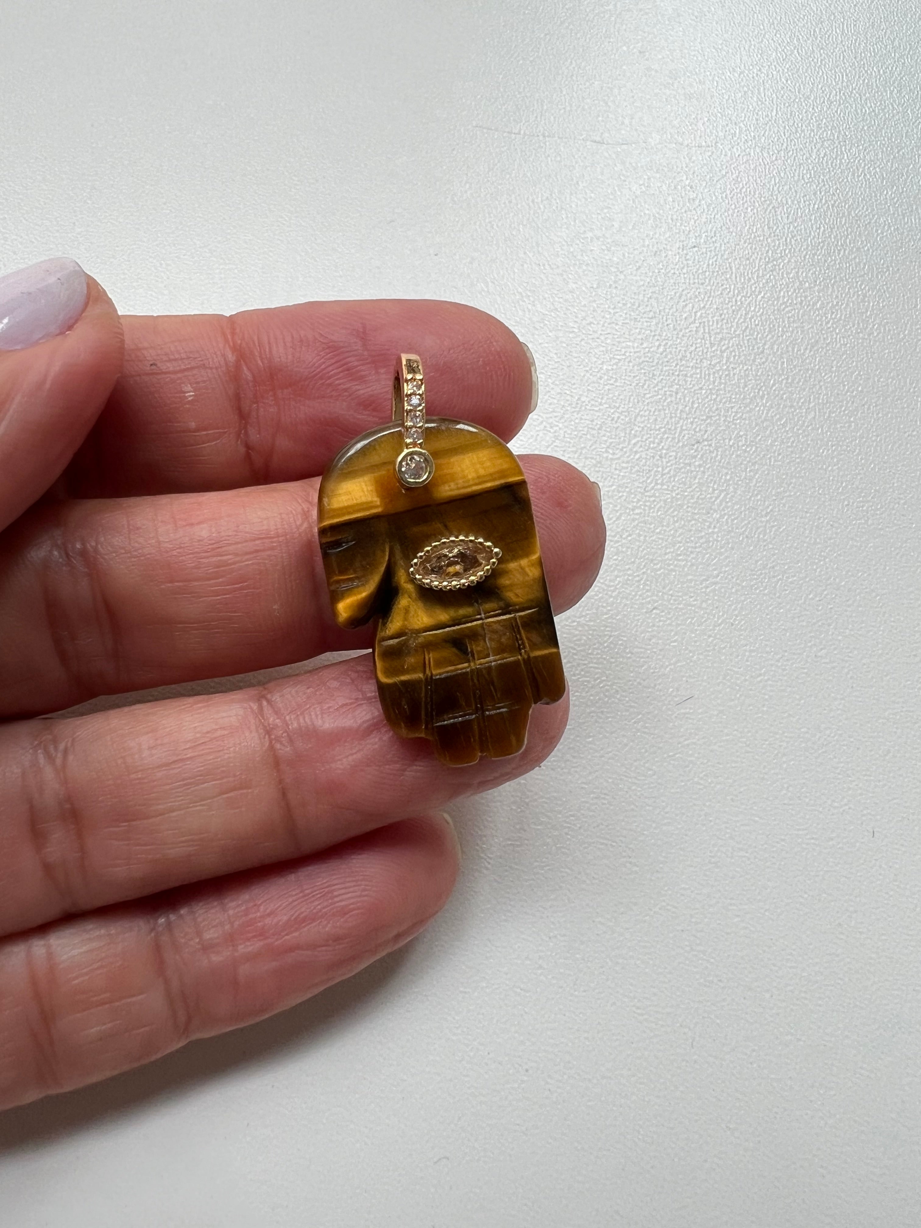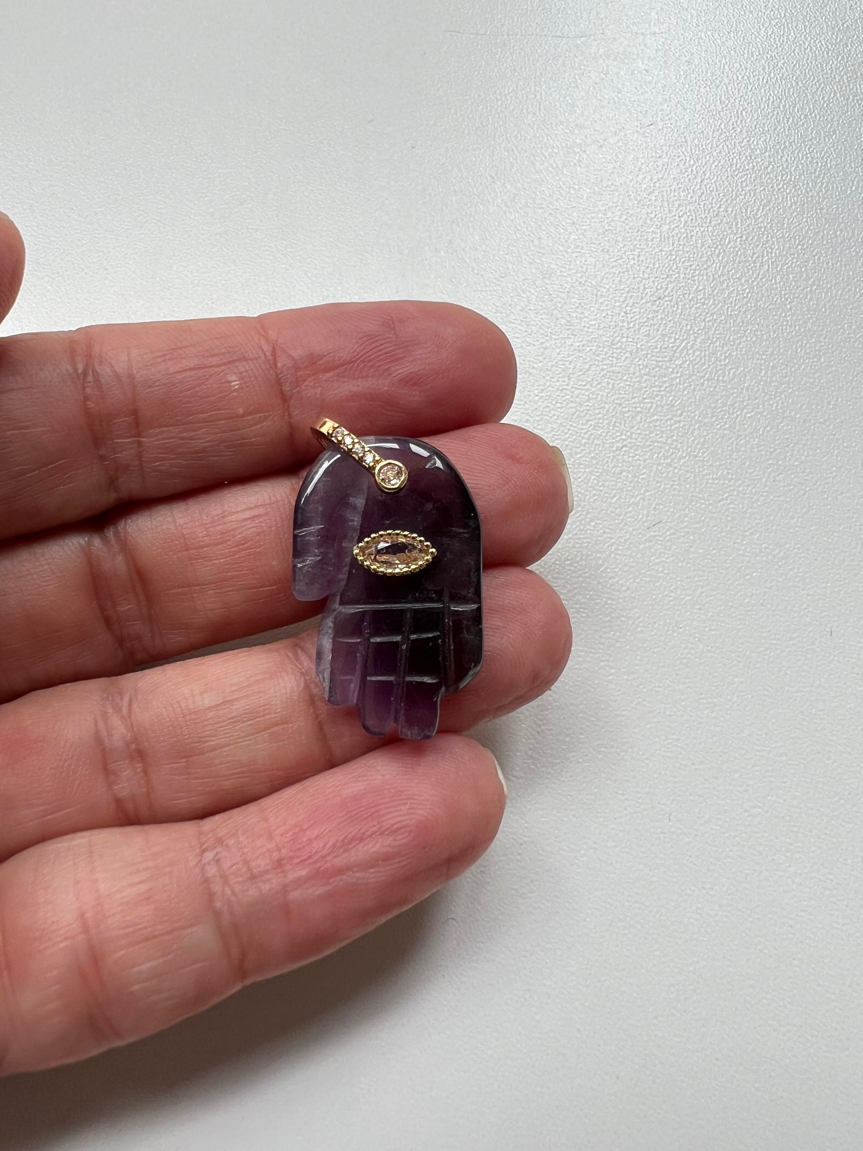 Este pingente possui banho de ouro 18k, pedras naturais e um cristal translúcido no centro, trazendo elegância e proteção para o seu dia a dia. A Hamsa, também conhecida como Mão de Fátima, é considerada um amuleto contra o mau-olhado e traz boas energias para quem usa.