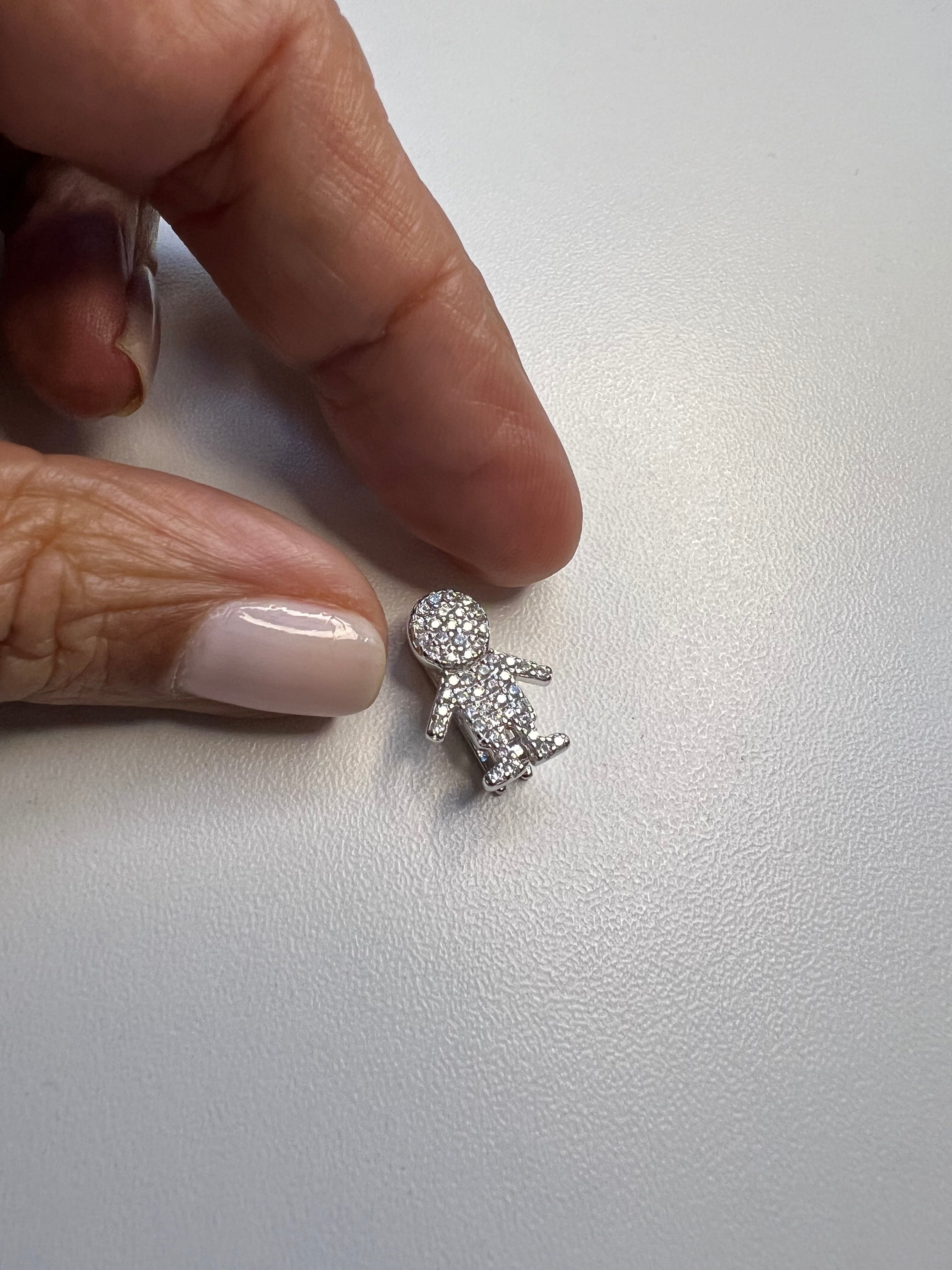 Este pingente de menino em prata 925,com banho de ródio é uma adição elegante e sofisticada ao seu colar favorito. Medindo 1,5 cm por 1 cm, é cravado com zircônias e seus traços delicados adicionam um charme especial a qualquer visual. Aproveite o brilho e a sofisticação deste pingente.
