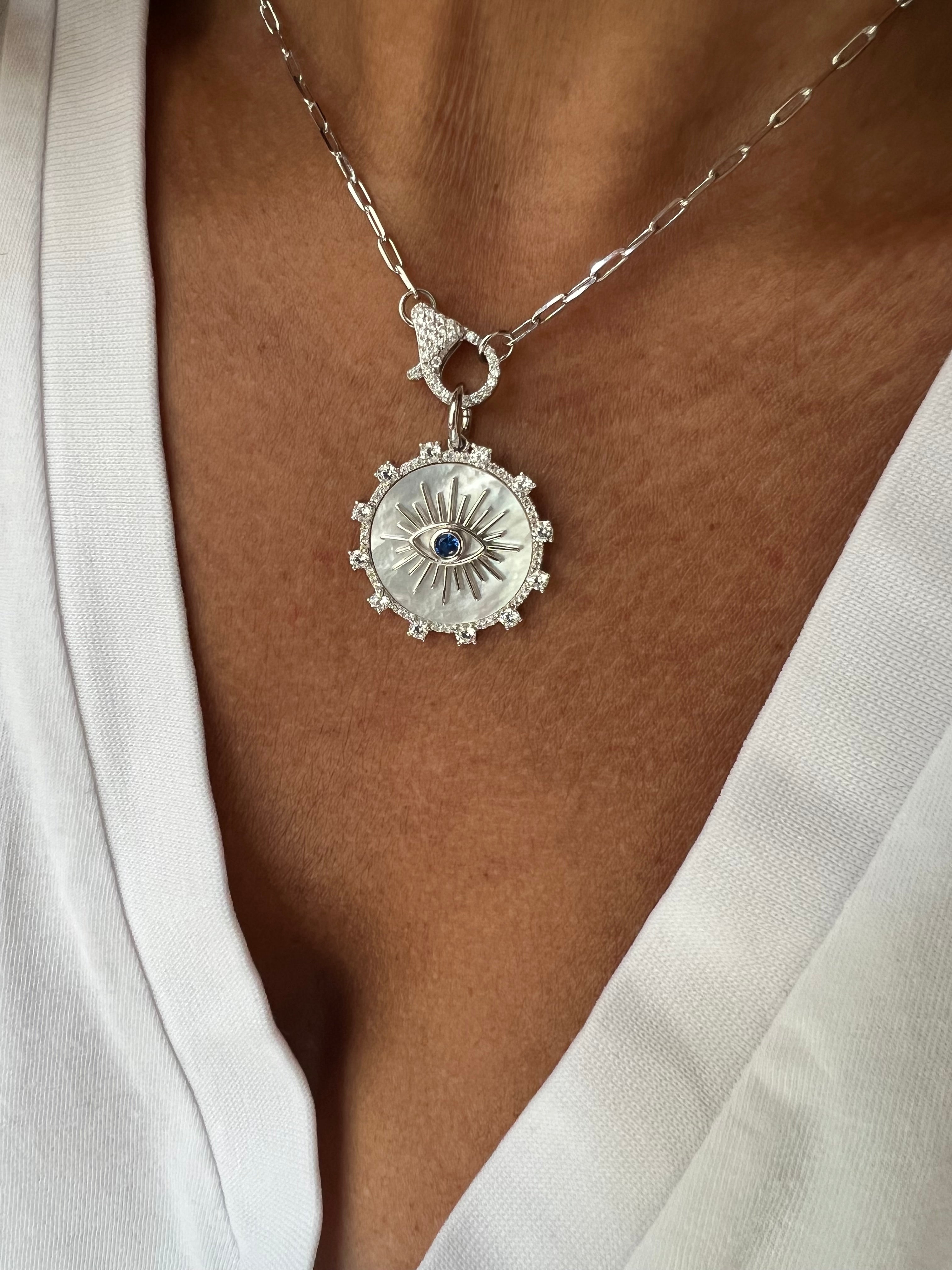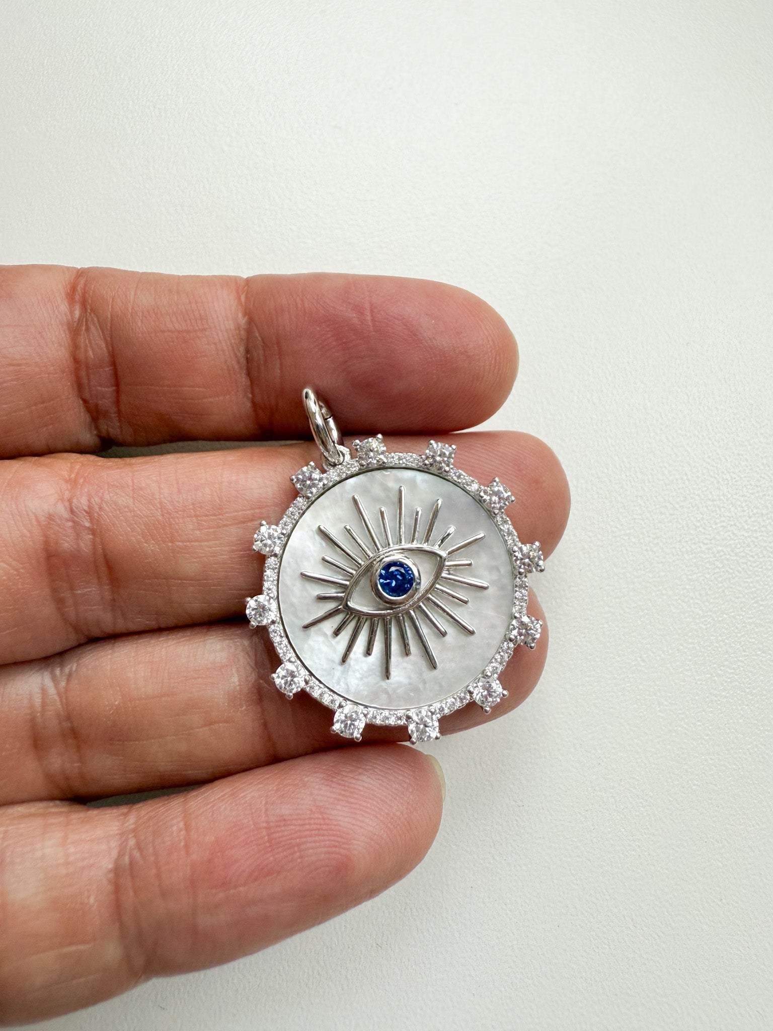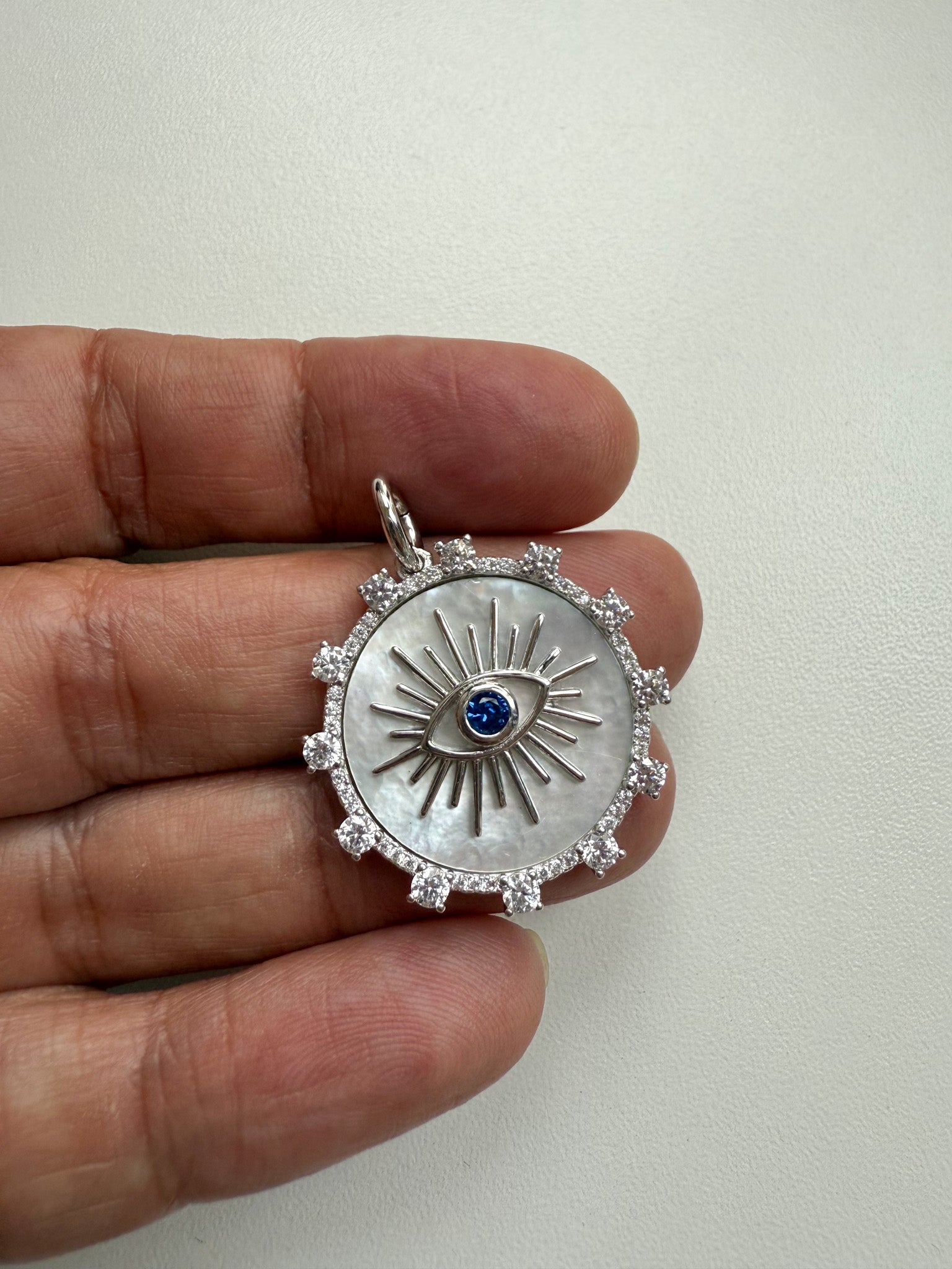 Este lindo pingente de prata com banho de ródio e madrepérola possui um elegante olho grego com zircônia azul escuro e cravações de zircônias nas laterais. Com 2.5 cm de tamanho, é perfeito para adicionar um toque de proteção e beleza ao seu look.