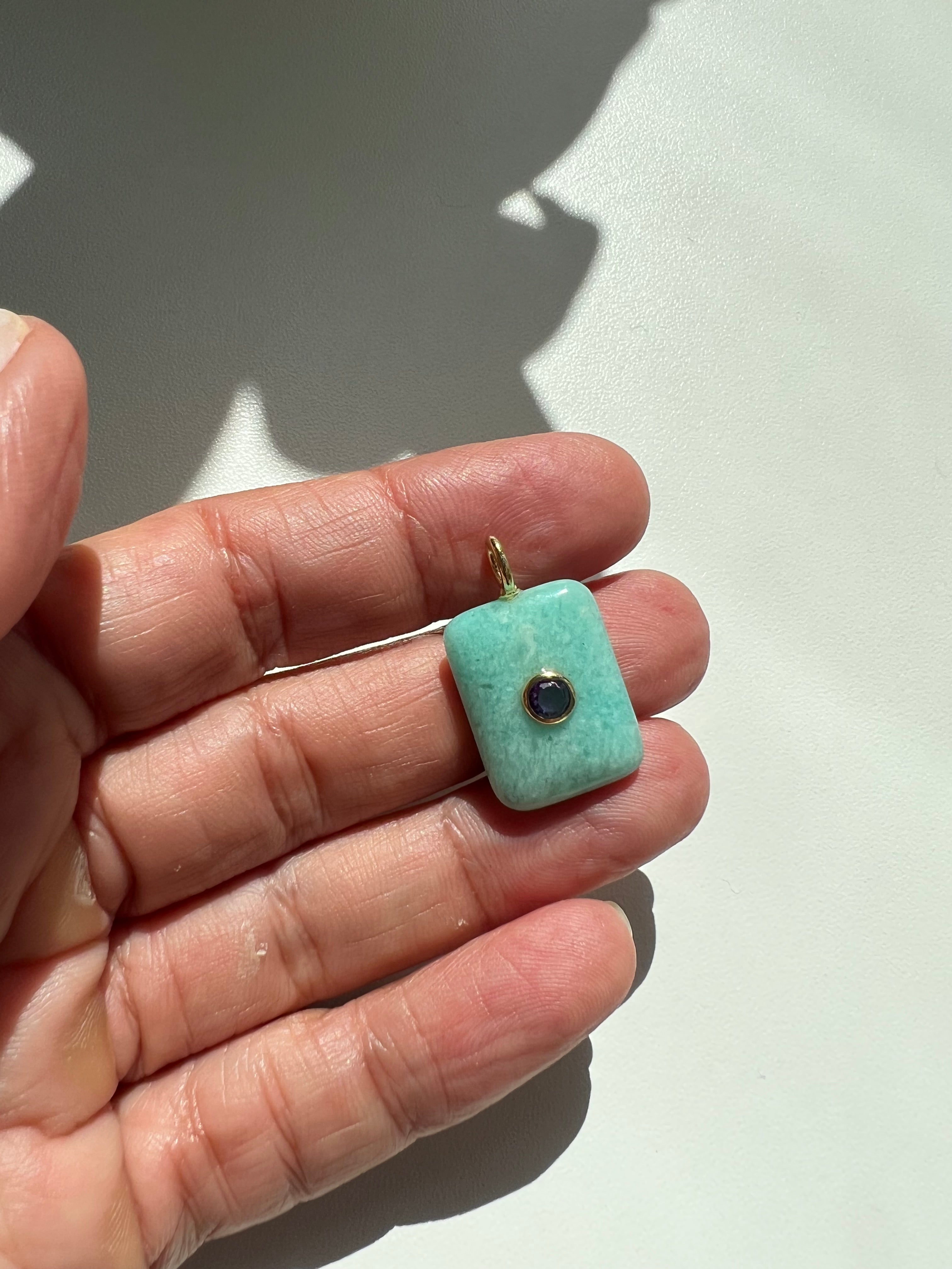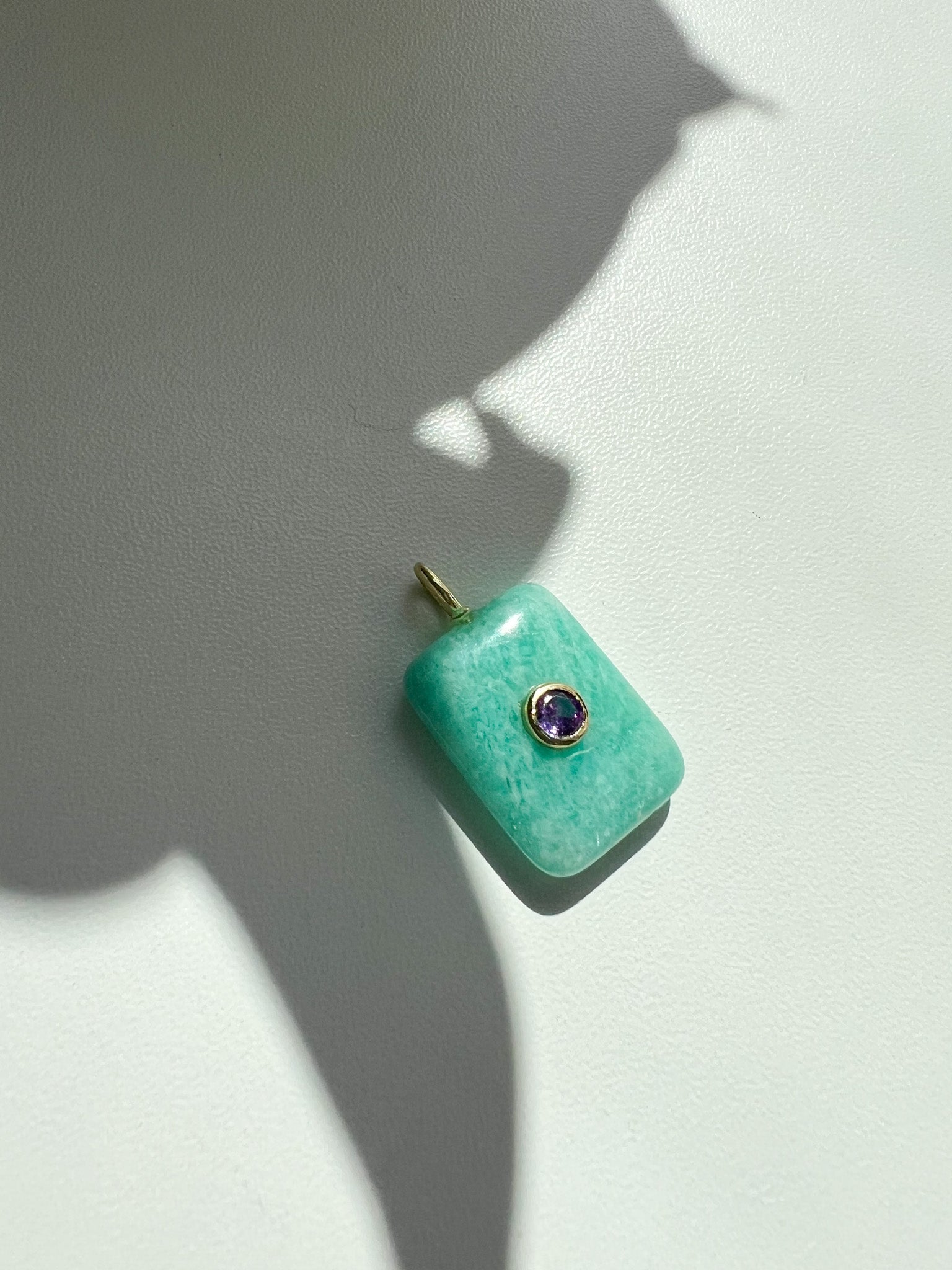 Este pingente quadrado apresenta uma pedra natural de amazonita, cravada com técnica inglesa, acompanhada por uma linda ametista. Com 3cm de comprimento, é a peça ideal para adicionar um toque de beleza e sofisticação ao seu visual. Perfeito para quem busca um acessório único e cheio de significado.