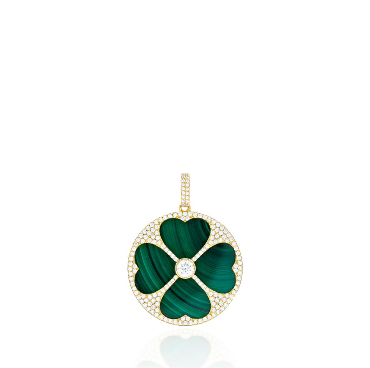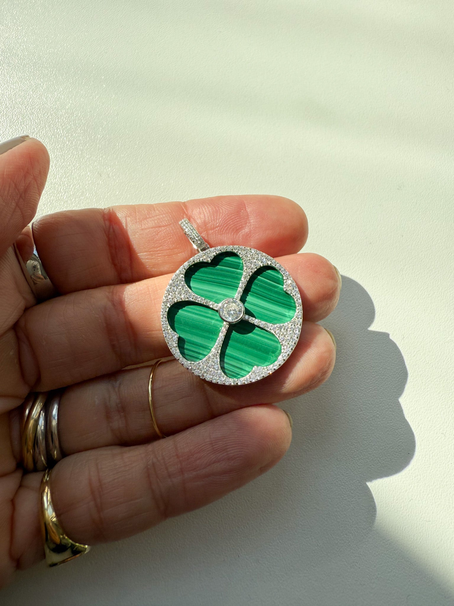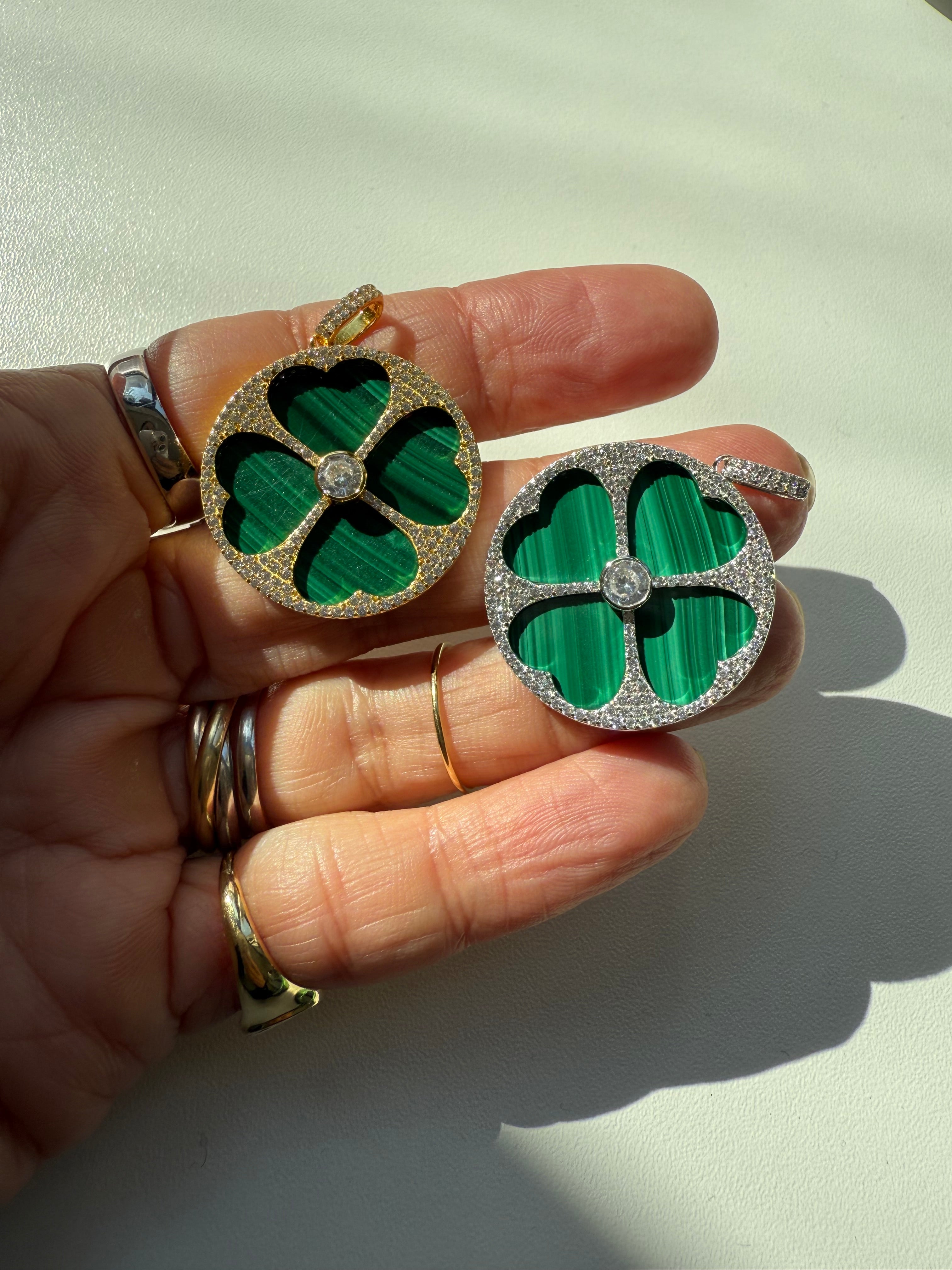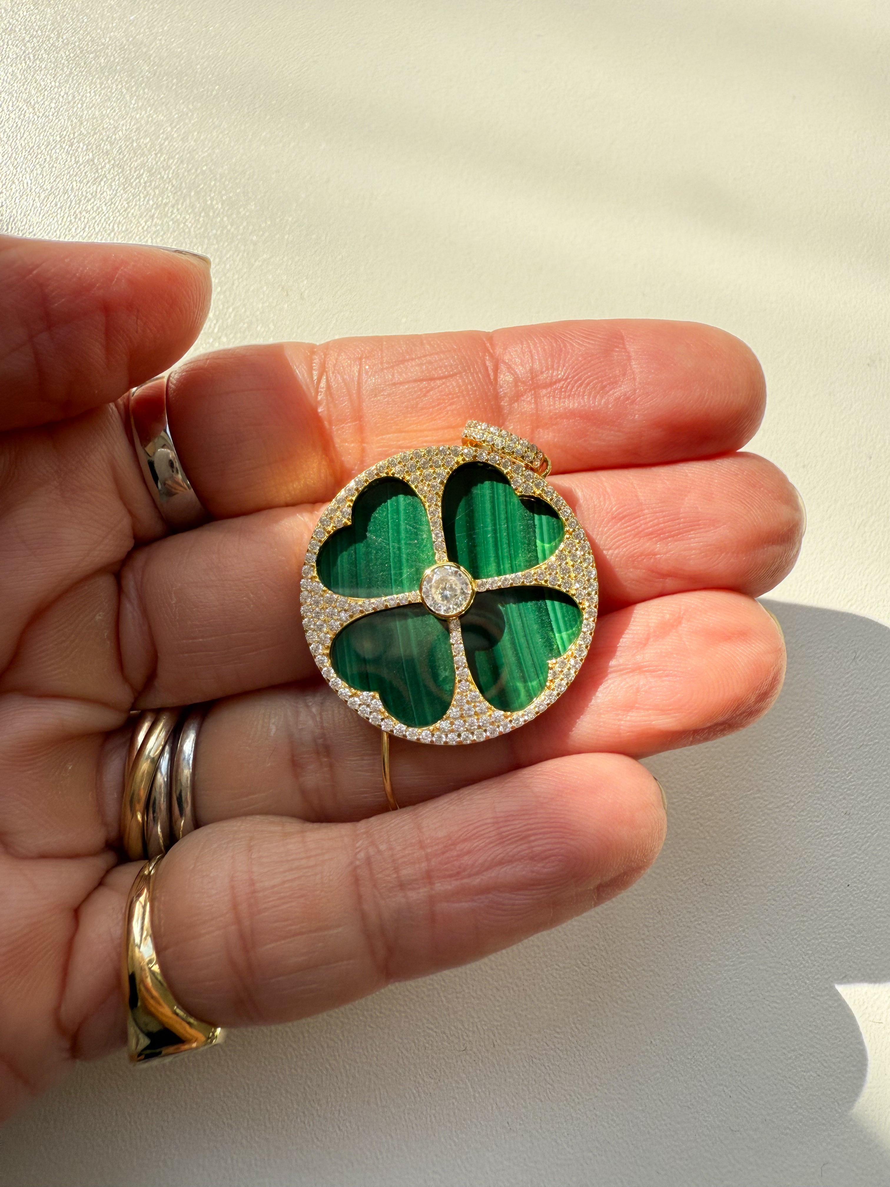 Este pingente possui uma bela pedra malaquita, conhecida por suas propriedades curativas e protetoras. Com detalhes em prata 925, banho de ouro e ródio, e cravações de zircônias, é uma peça sofisticada e cheia de significado. Com 2.7 cm de comprimento, pode ser utilizado como amuleto da sorte ou como um acessório elegante.