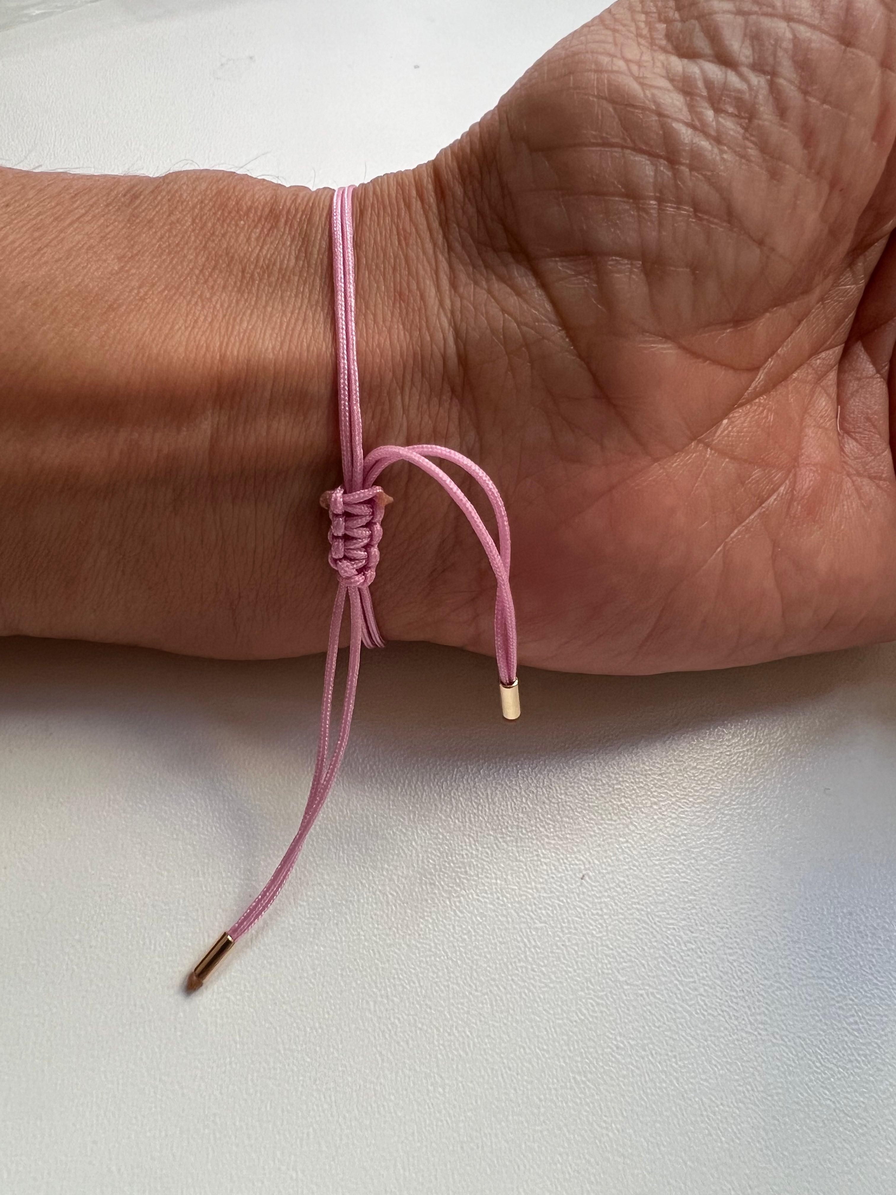 Modelo exclusivo de pulseira banhada em ouro 18k com pedras quartzo rosa e cristais, trazendo um toque elegante e sofisticado para qualquer look. Fechamento ajustável em macramé e fio de seda rosa, proporcionando conforto e estilo. Adicione um toque de brilho e requinte ao seu dia a dia com essa pulseira.