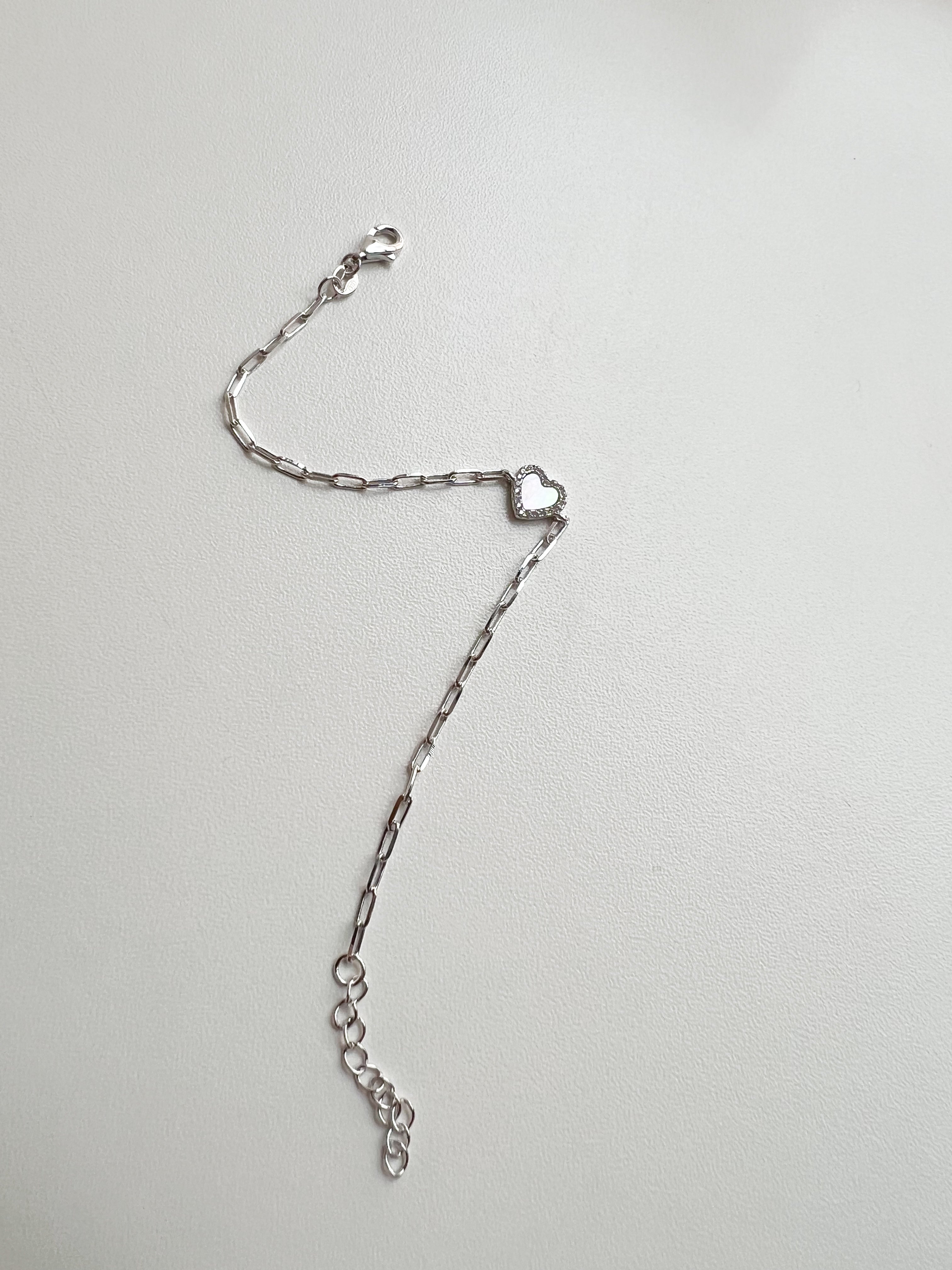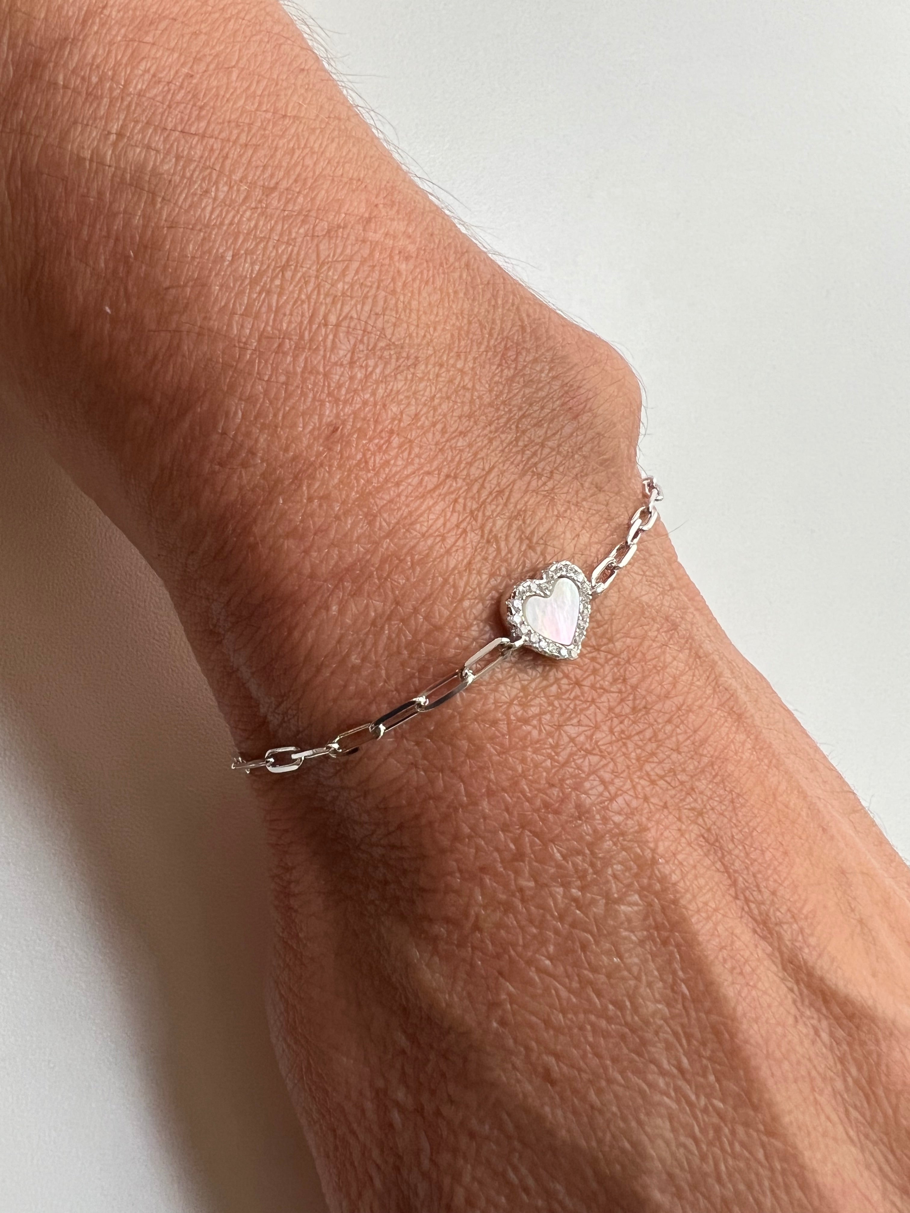 Pulseira refinada em prata 925 com banho em ródio, estruturada em corrente de elos com pingente de coração. Combina elementos naturais de turquesa e madrepérola meticulosamente adornados com zircônias de alta qualidade. Oferece ajuste personalizado com 16 cm de comprimento e extensor adicional de 3 cm para adaptação perfeita ao pulso.