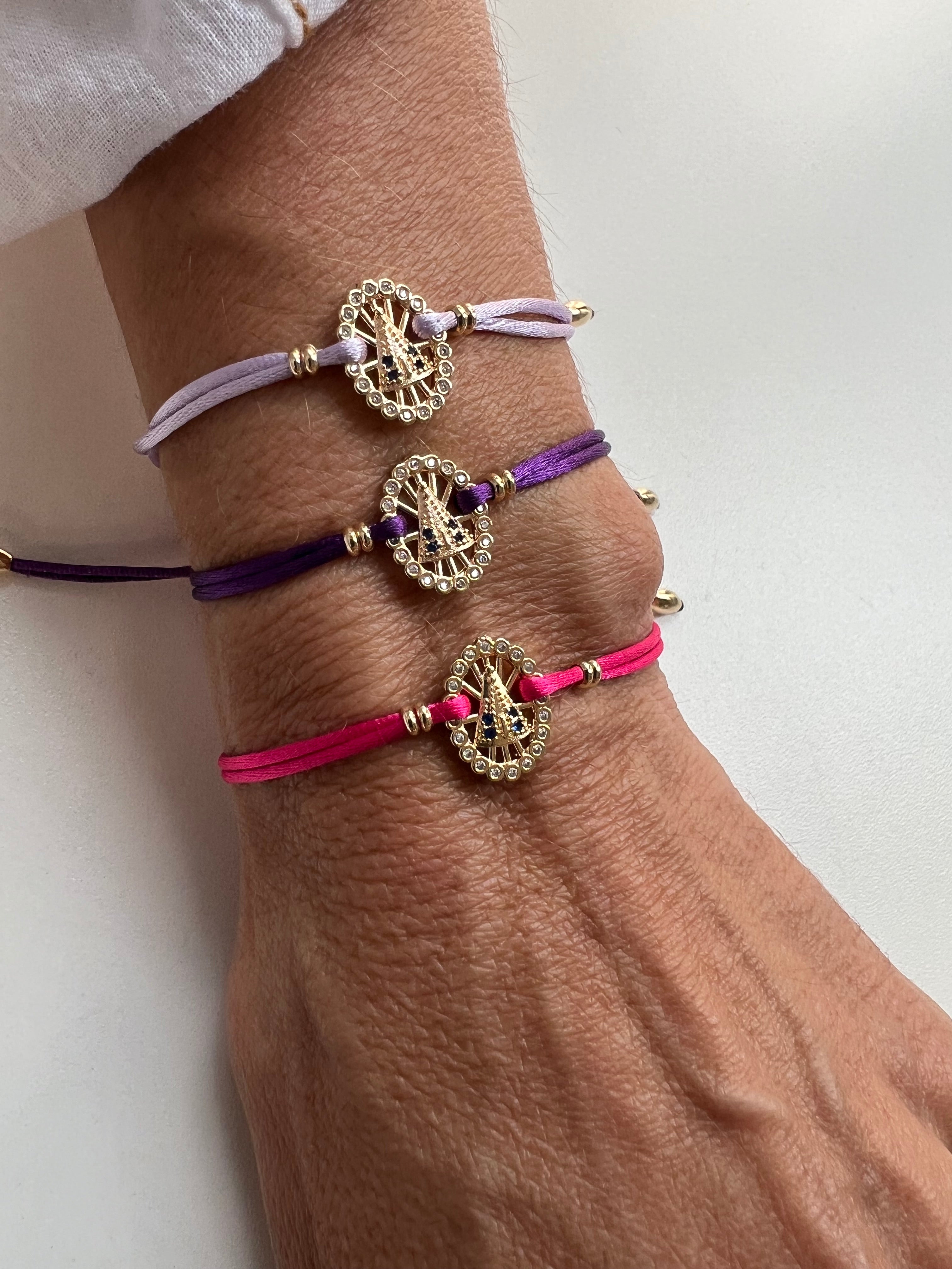 Esta pulseira feita com fio de seda e imagem de Nossa Senhora Aparecida banhada a ouro é uma forma elegante e delicada de expressar sua devoção. Com fecho ajustável de macramé, é perfeitamente adaptável ao seu pulso. Mostre sua fé com estilo.