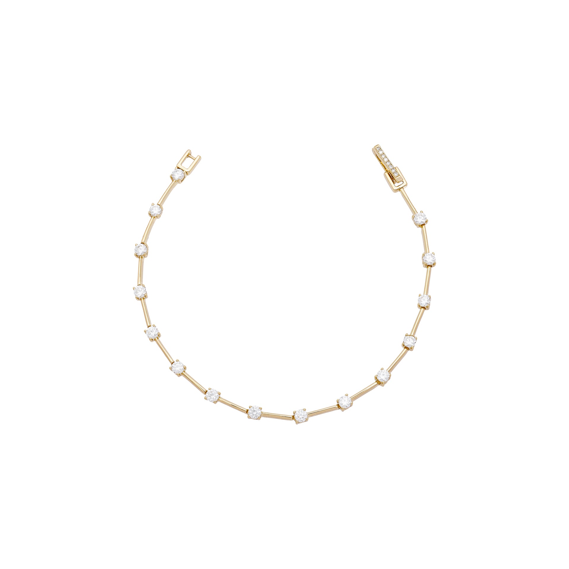 A pulseira de prata 925 com banho de ouro apresenta pedras moissanites de 1,58 ct, com 3 mm de diâmetro. Com 17 cm de comprimento, conta com um fecho gaveta cravado em moissanites, garantindo segurança e durabilidade. Ideal para compor looks sofisticados e elegantes.