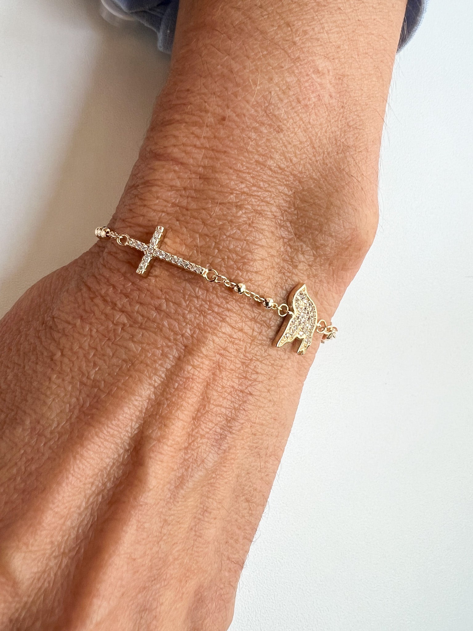 Desfrute de uma peça sofisticada e protegida com a Pulseira Protegida. Feita em prata 925 com banho de ouro 18k, possui belas imagens de Nossa Senhora das Graças, Espírito Santo, Cruz e um coração, com cravações de zircônias. Com 15cm e mais 3cm de extensores, ela se ajusta perfeitamente ao seu pulso.