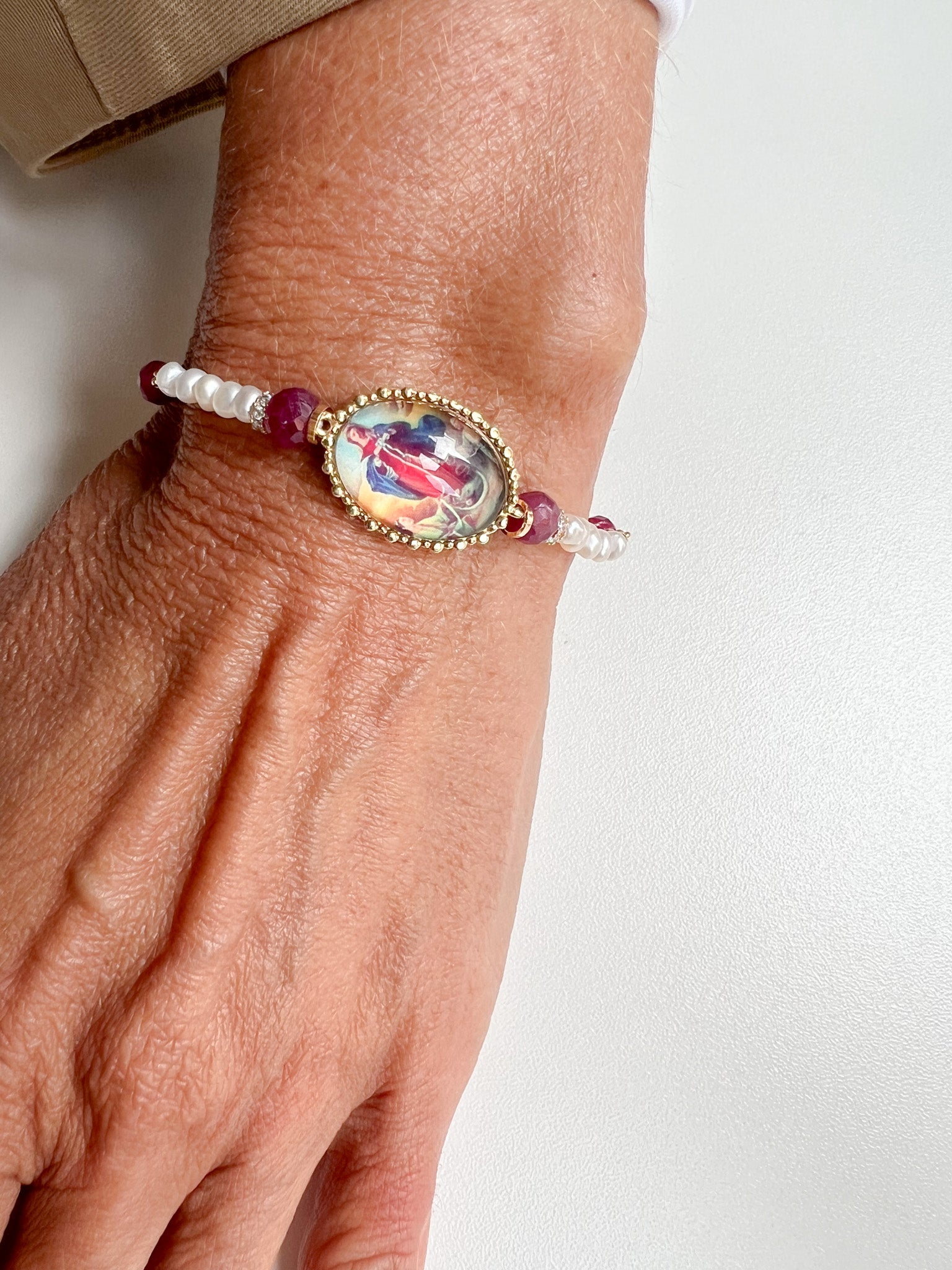 Adorada por muitos, esta pulseira conta com medalhas de Nossa Senhora das Graças e da Desatadora de Nós, banhadas a ouro 18k. Com pérolas cultivadas, 6 pedras de rubis e entremeios de zircônias, ela mede 16cm com 5cm de extensor para ajustar perfeitamente ao seu pulso. A qualidade incomparável desta joia traz consigo proteção e elegância.