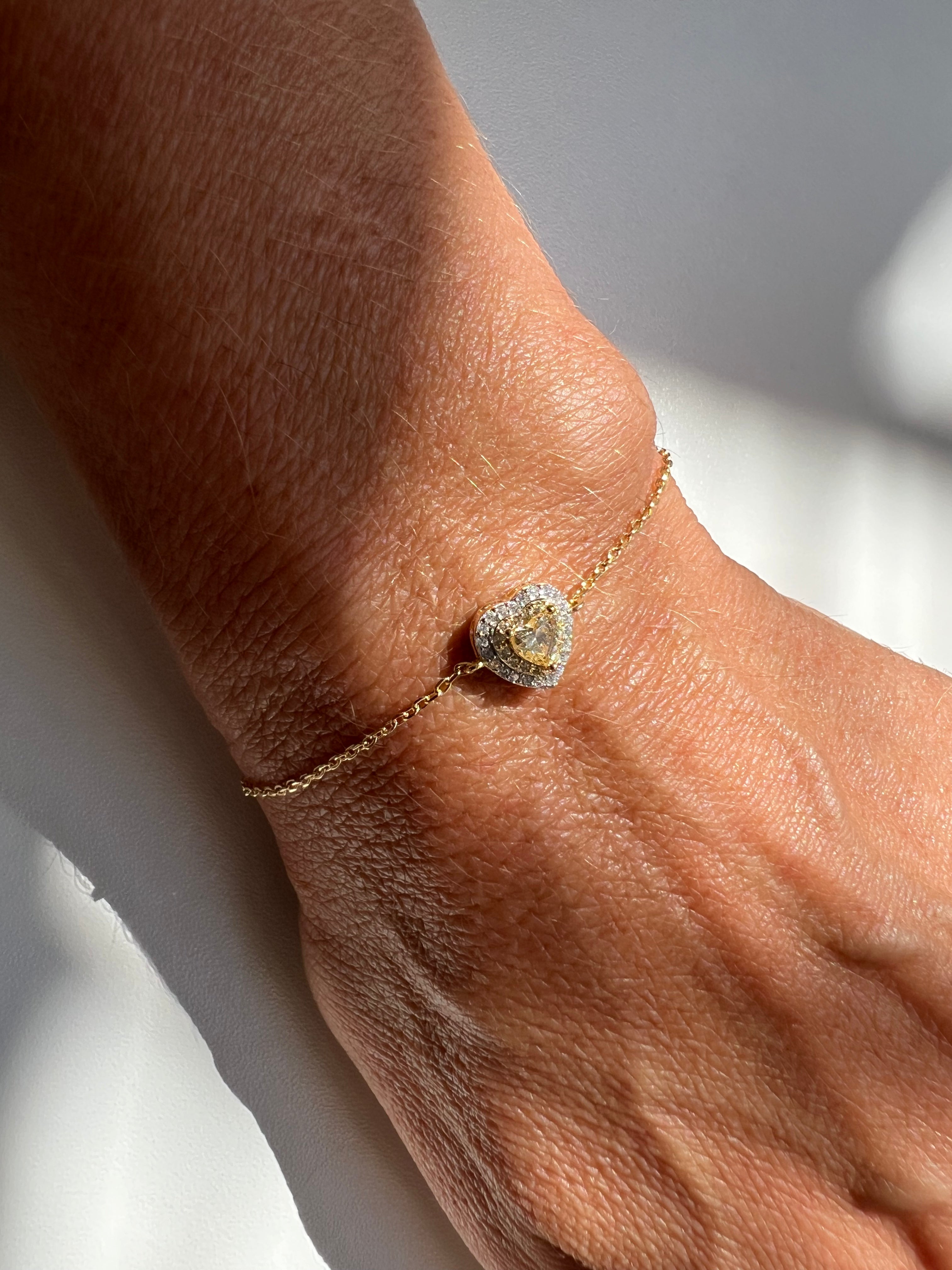 A pulseira mini coração Yellow fancy é feita em prata 925 com banho de ouro 18k, com cravações de zircônias e um coração de zircônia yellow fancy. Seu tamanho de 15cm pode ser ajustado com duas argolas adicionais, permitindo o uso nas medidas de 16 e 17cm. Adicione um toque de elegância e brilho ao seu visual com essa pulseira exclusiva.