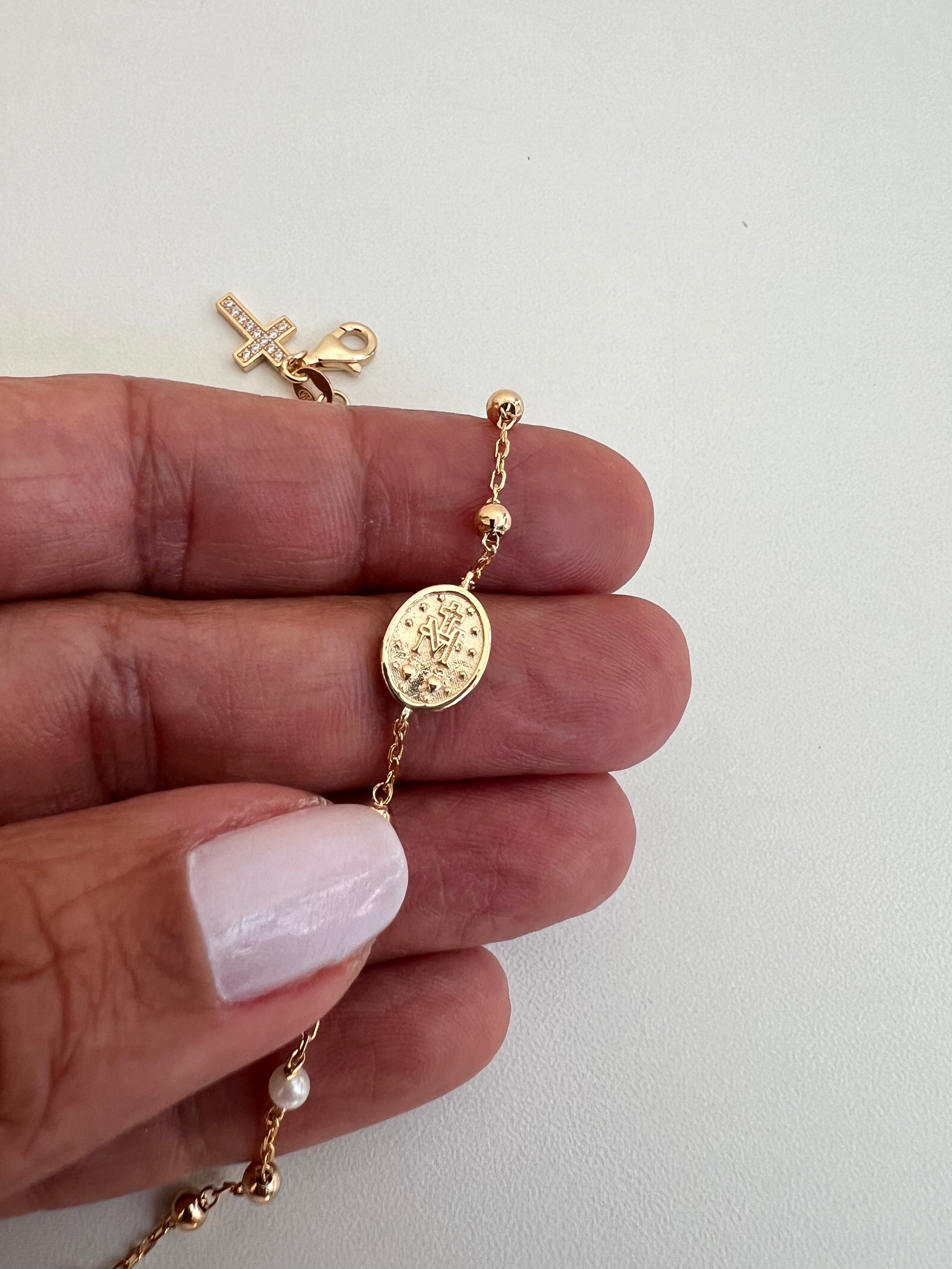 A pulseira de prata 925 com banho de ródio e banho de ouro 18k é perfeita para adicionar um toque de elegância e proteção ao seu look. Com bolinhas e pérolas, e uma mini cruz no fecho, possui 15 cm de comprimento e 3 cm de extensores para se ajustar perfeitamente ao seu pulso.Vom gravação interna também .