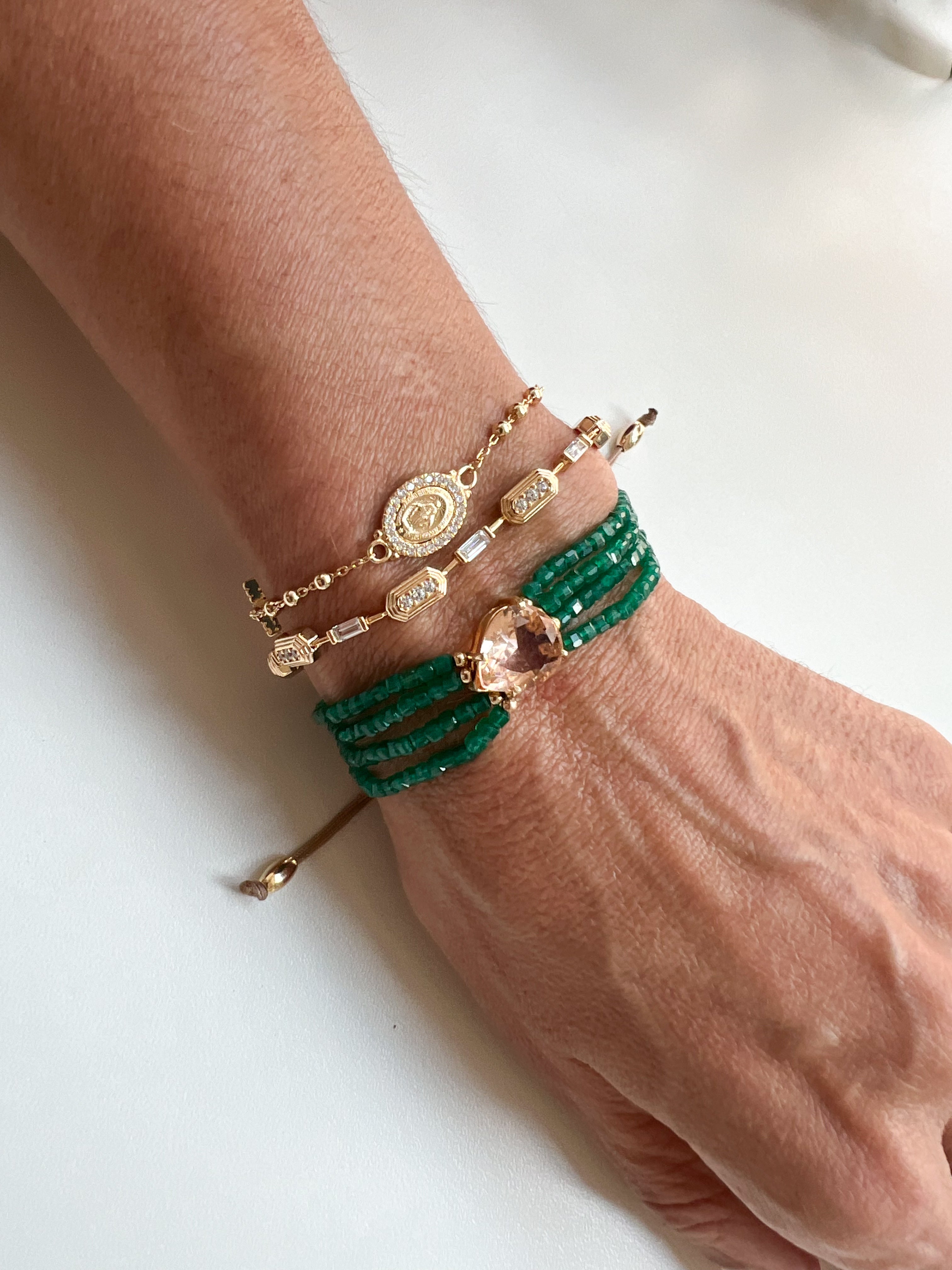 A pulseira de pedras jade é feita com pedras naturais e possui um fecho macramé ajustável para maior conforto. Com uma linda pedra central de cristal morganita, banhada a ouro, traz um toque sofisticado e elegante para qualquer look. Aproveite os benefícios das pedras jade e do cristal morganita enquanto adiciona estilo ao seu visual.